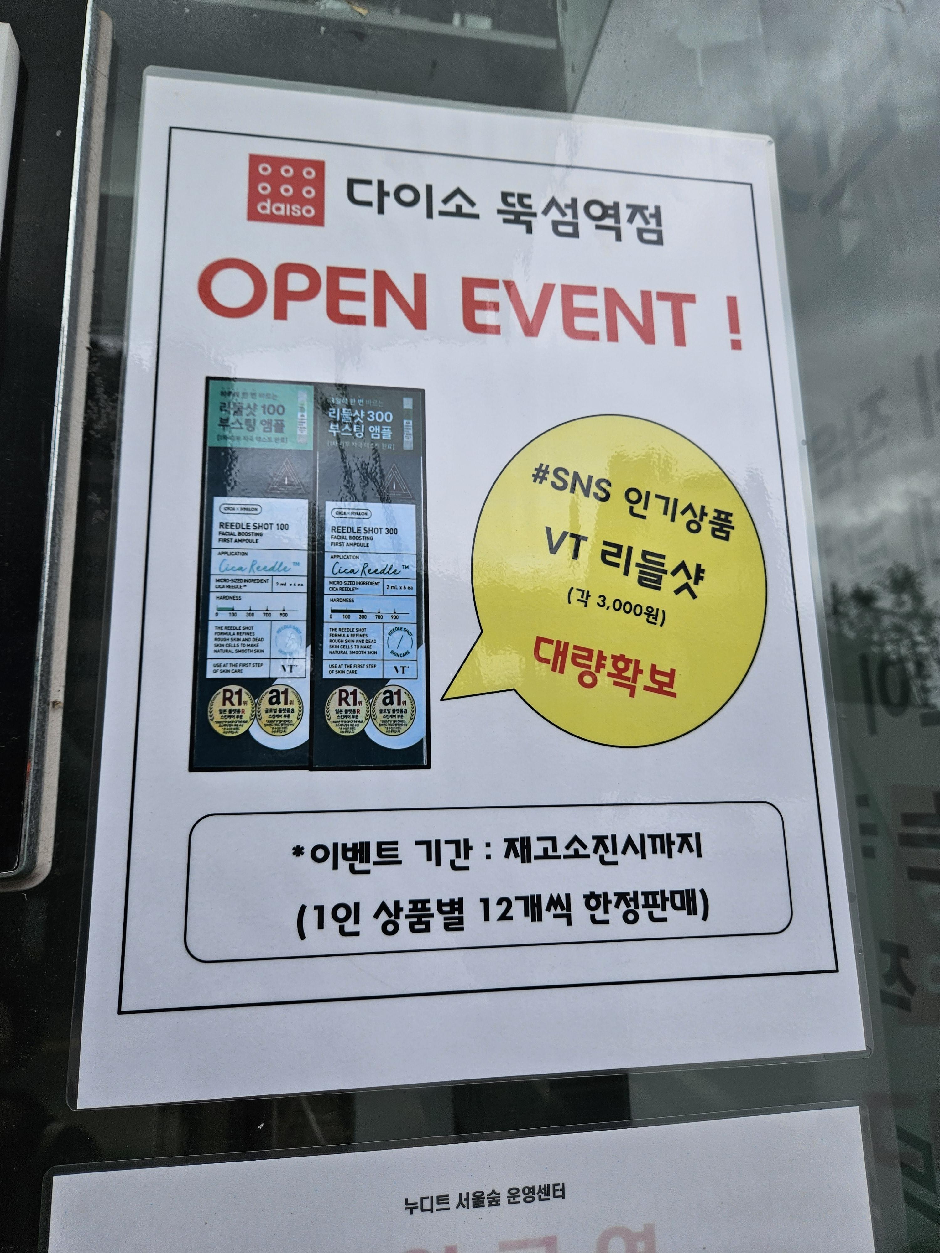 그리고 매장에 들어갈 때 SNS 인기상품 홍보 전단 같은 게 붙어있어서 봤더니 다이소 VT 리들샷 재고를 대량확보해 놨다는 것인데 1인 판매 제한 개수를 상품별 12개씩 한정판매라고 하니 뭔지 궁금하더라.