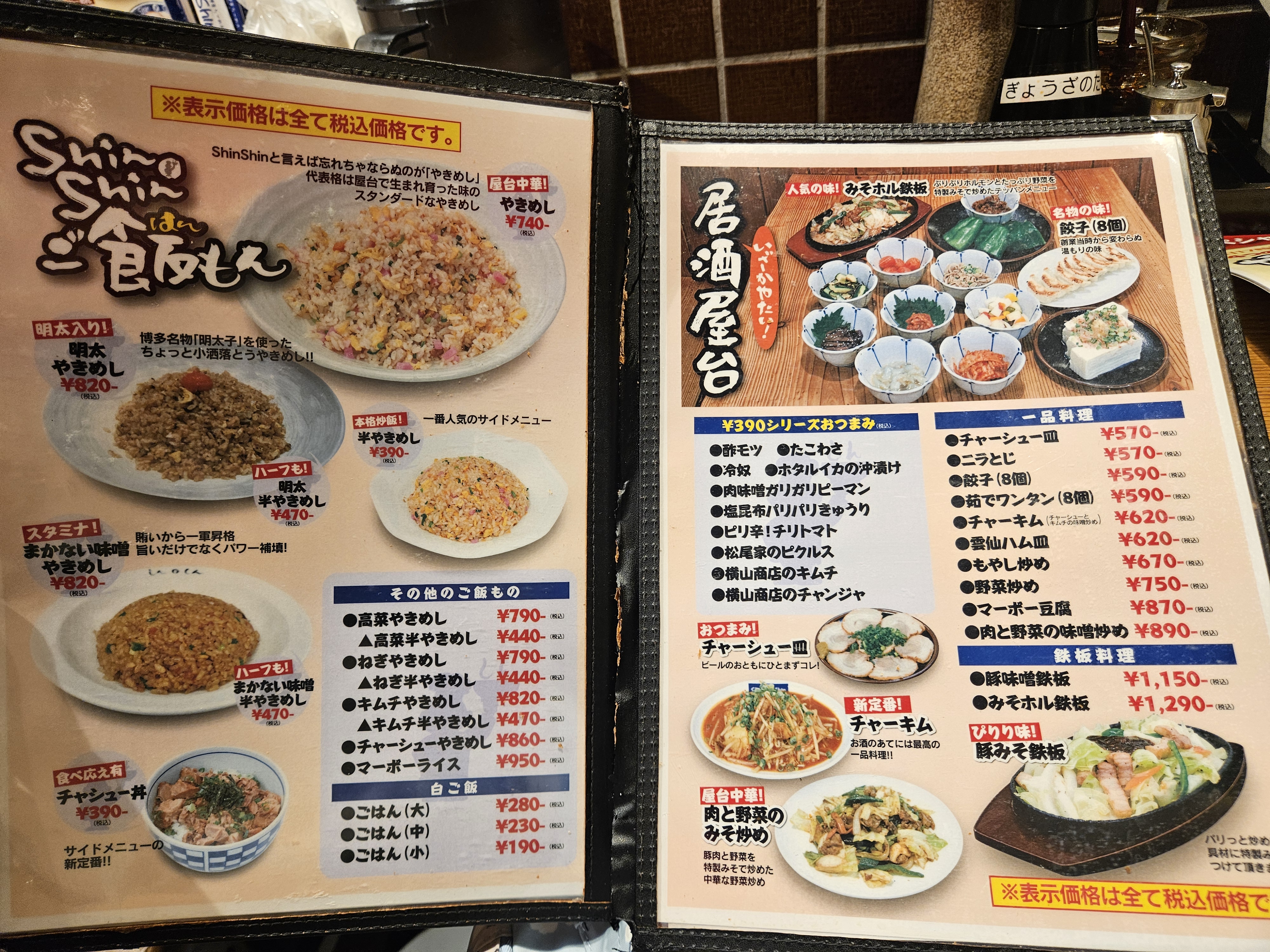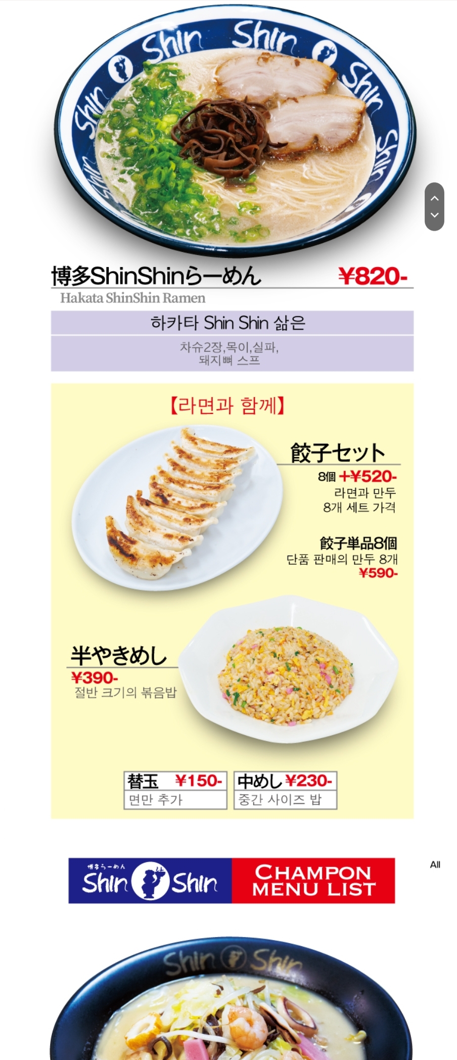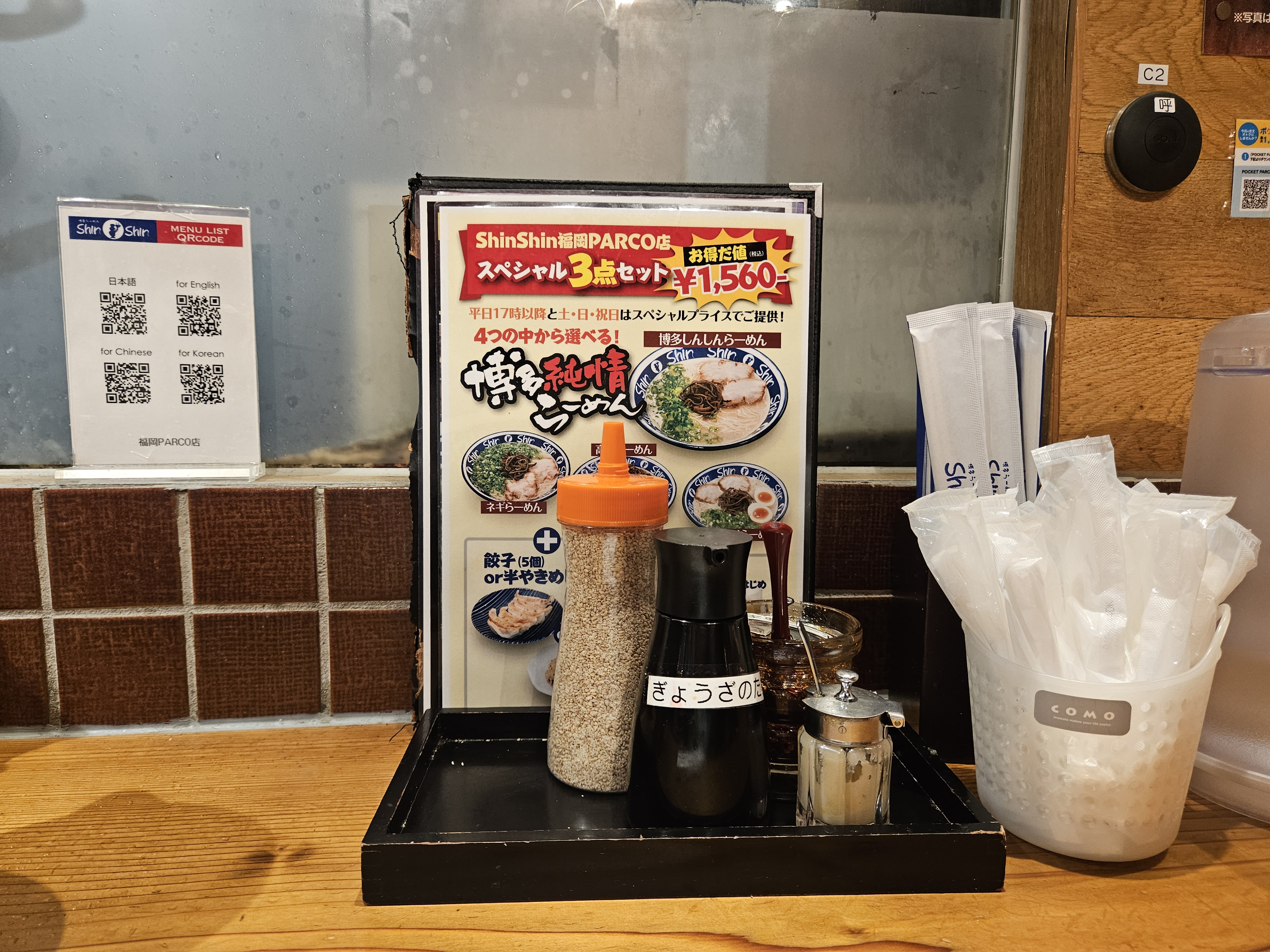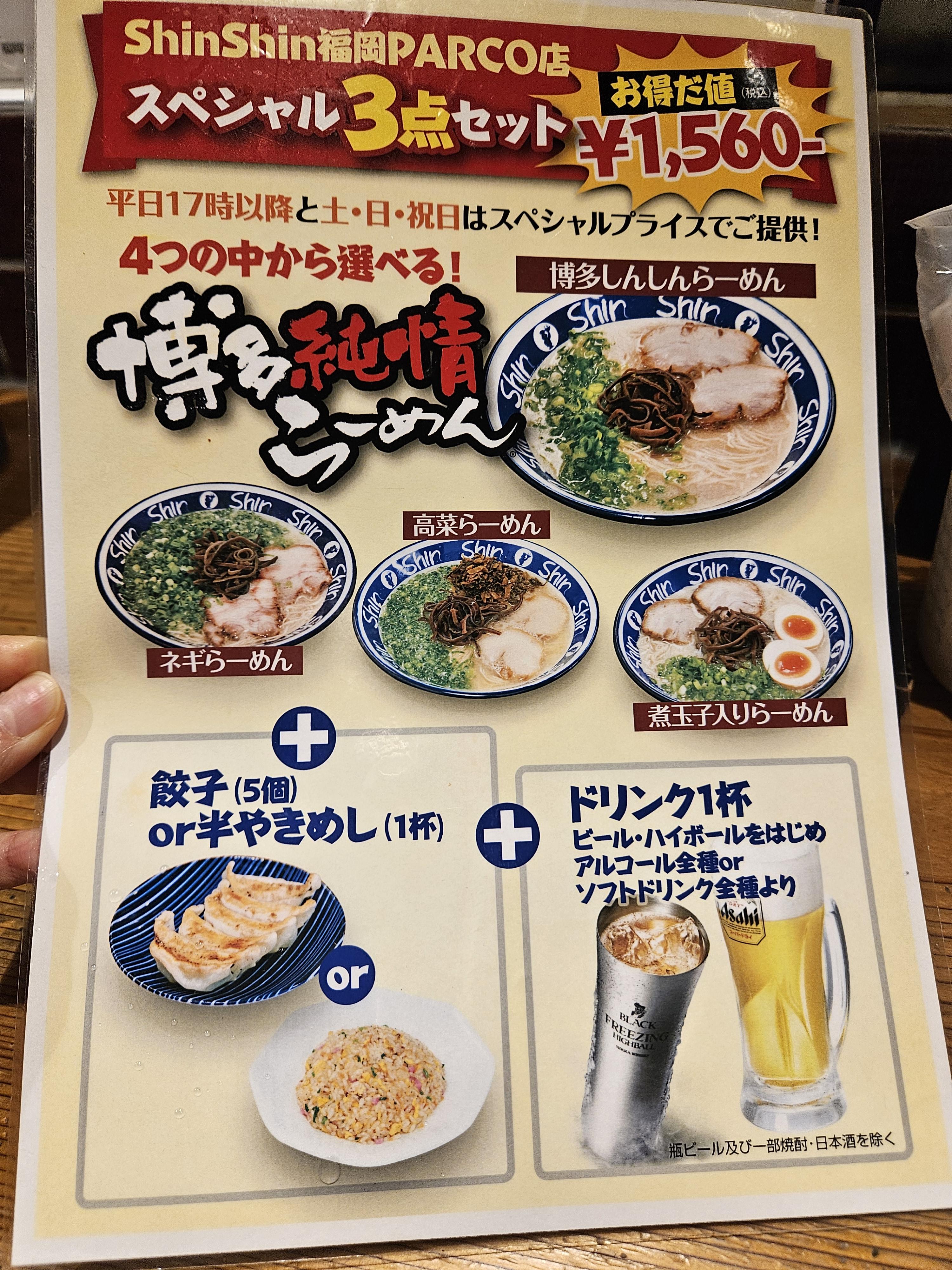 평일 5시 이후, 주말과 공휴일에 메인 라멘과 사이드(교자 or 볶음밥), 음료(맥주, 하이볼, 소프트드링크 중 1)를 하나씩 고르는 세트 메뉴를 1580엔에 판매하고 있어서 여러 가지 맛보고 싶으면 이 메뉴 선택하는 게 좀 더 저렴하다.