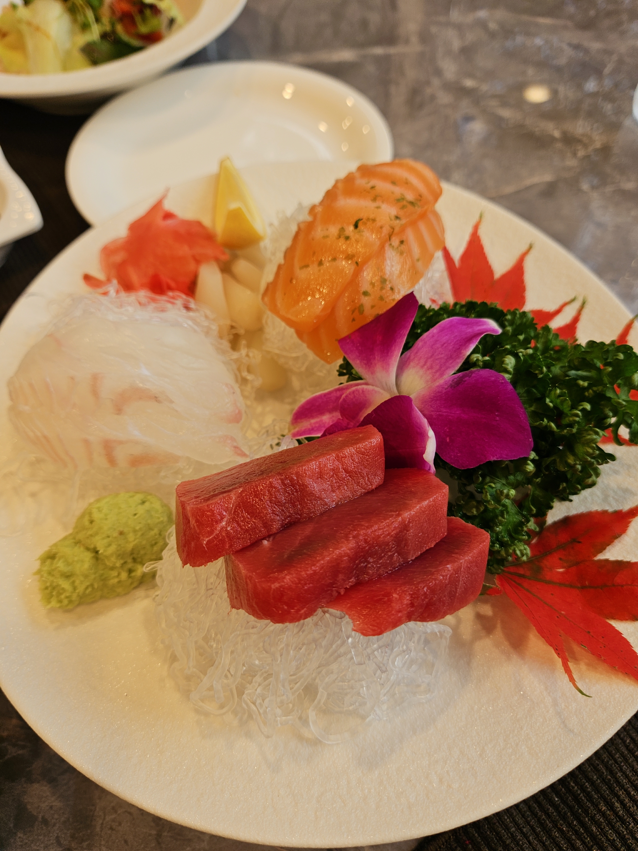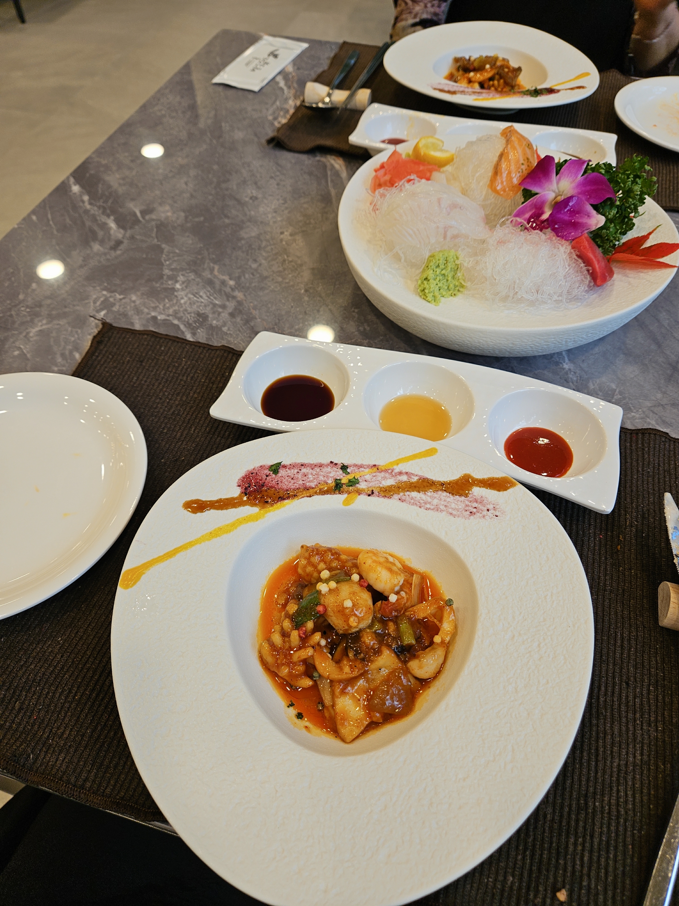 육회 / 제철 사시미(광어, 연어, 참치) / 팔보채