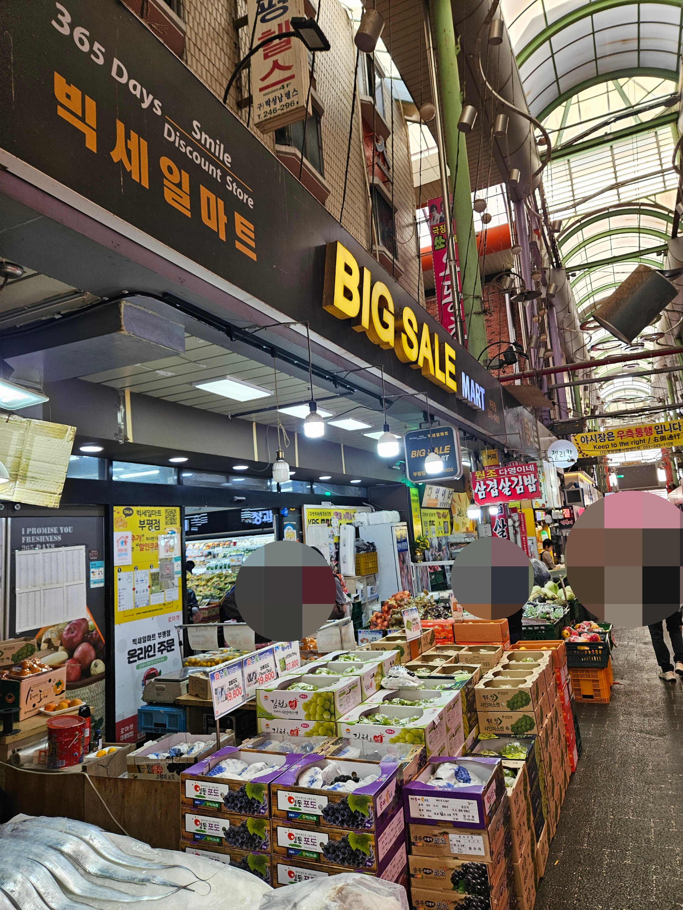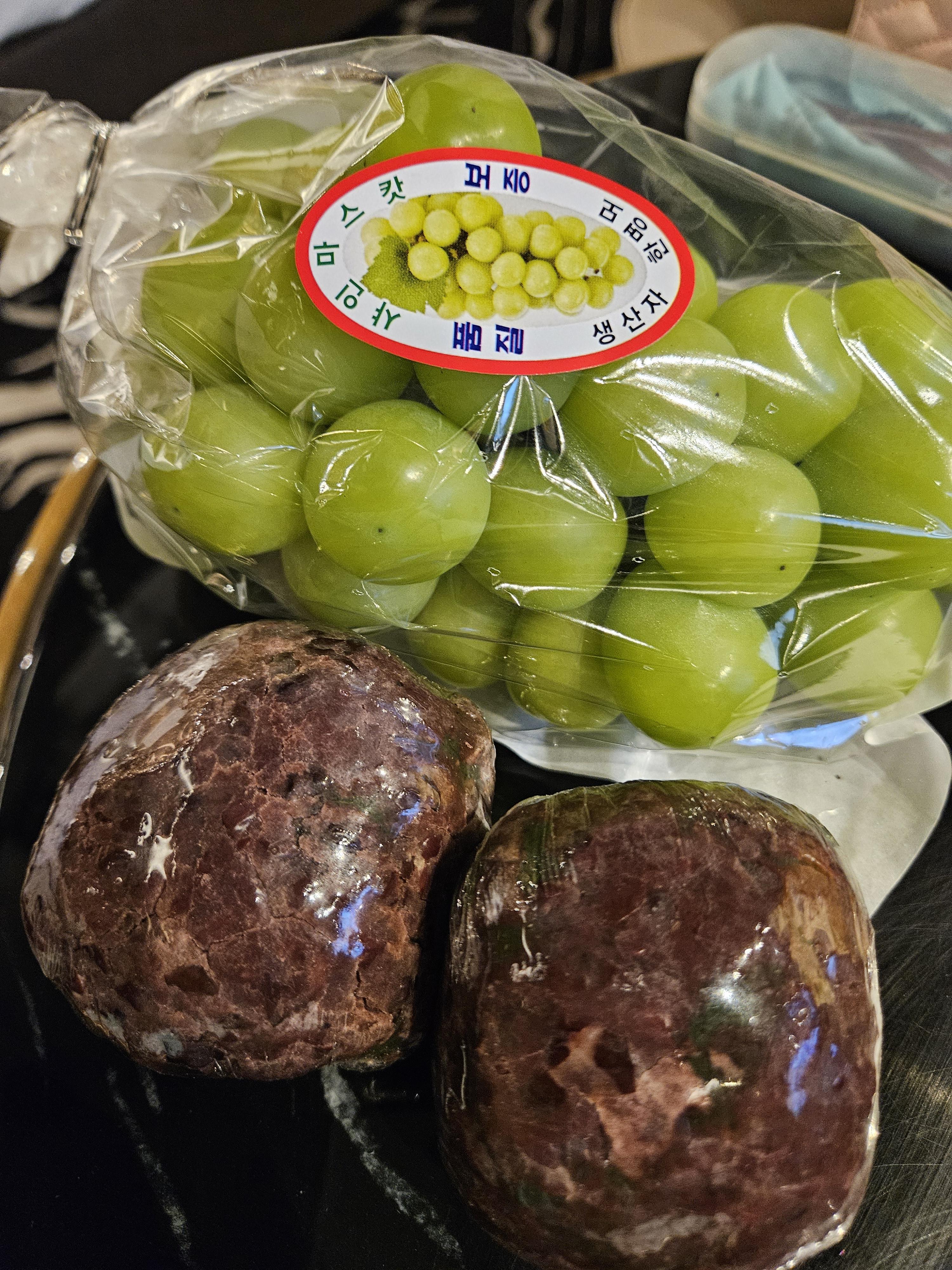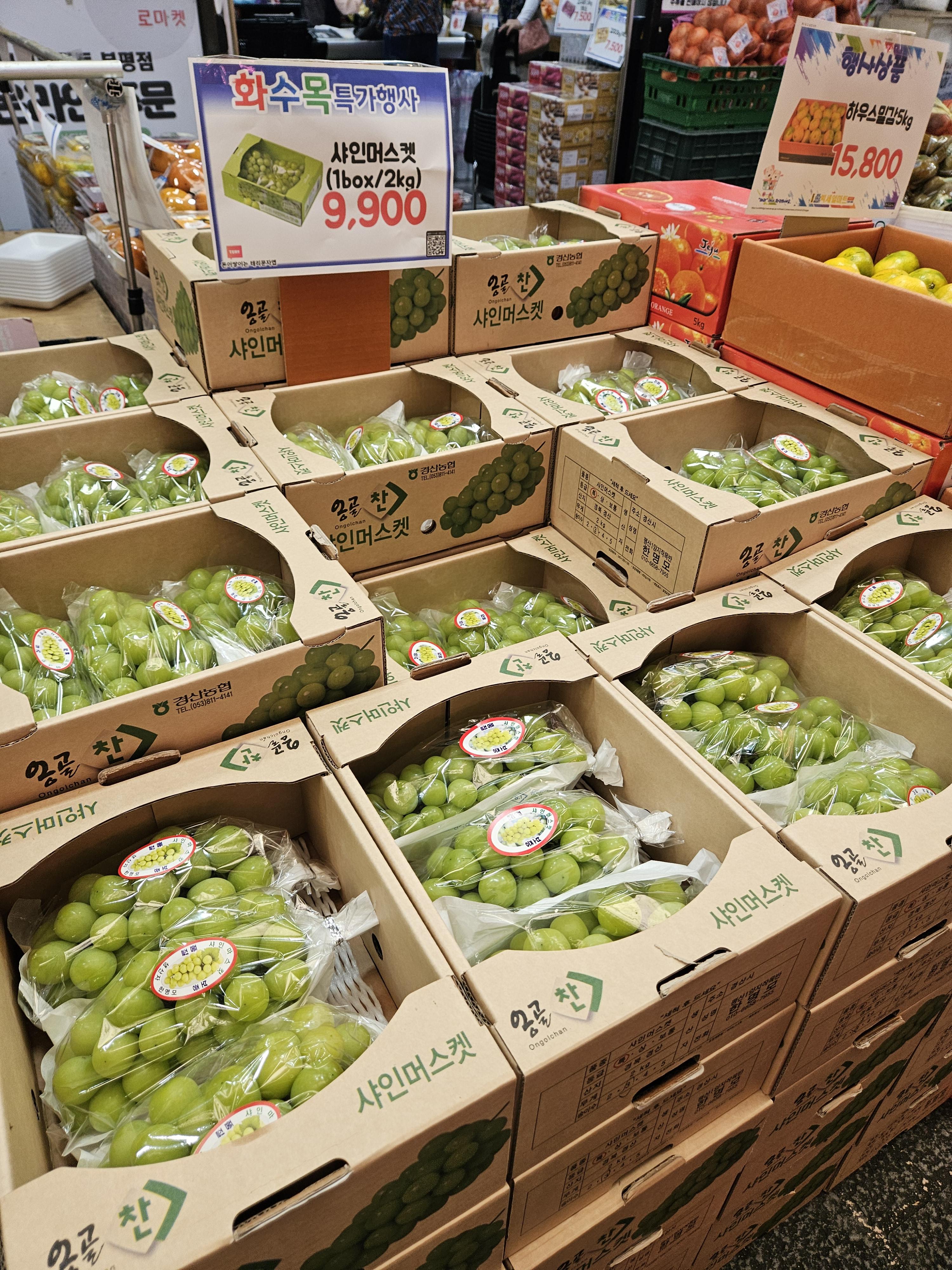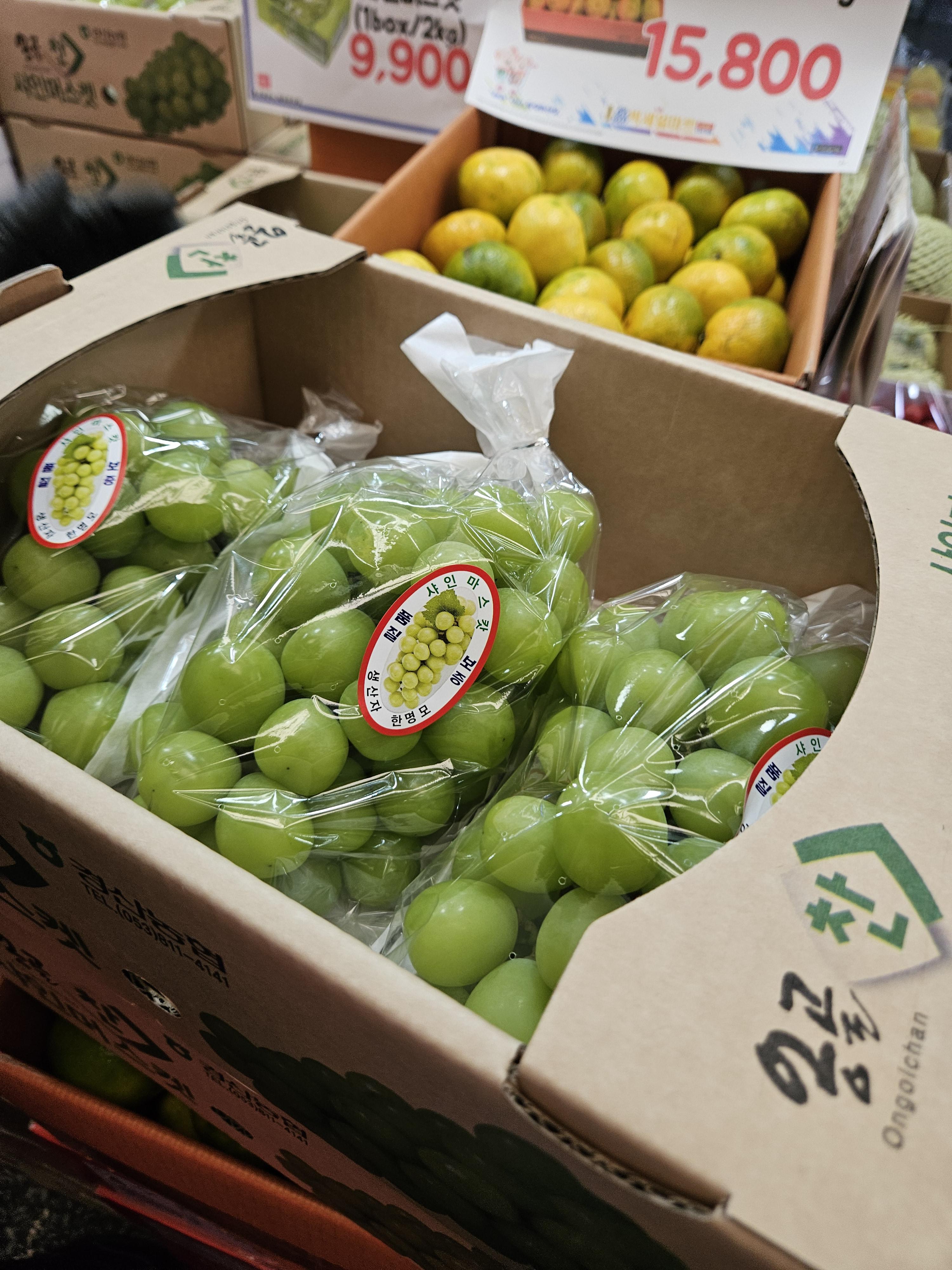 둘러보고 다시 깡통시장으로 와서 이가네 떡볶이 근처 탑세일마트(부평 소, 돼지 도매센터 정육점 앞)에서 찜해 놓은 샤인머스캣 2박스 구매했다.