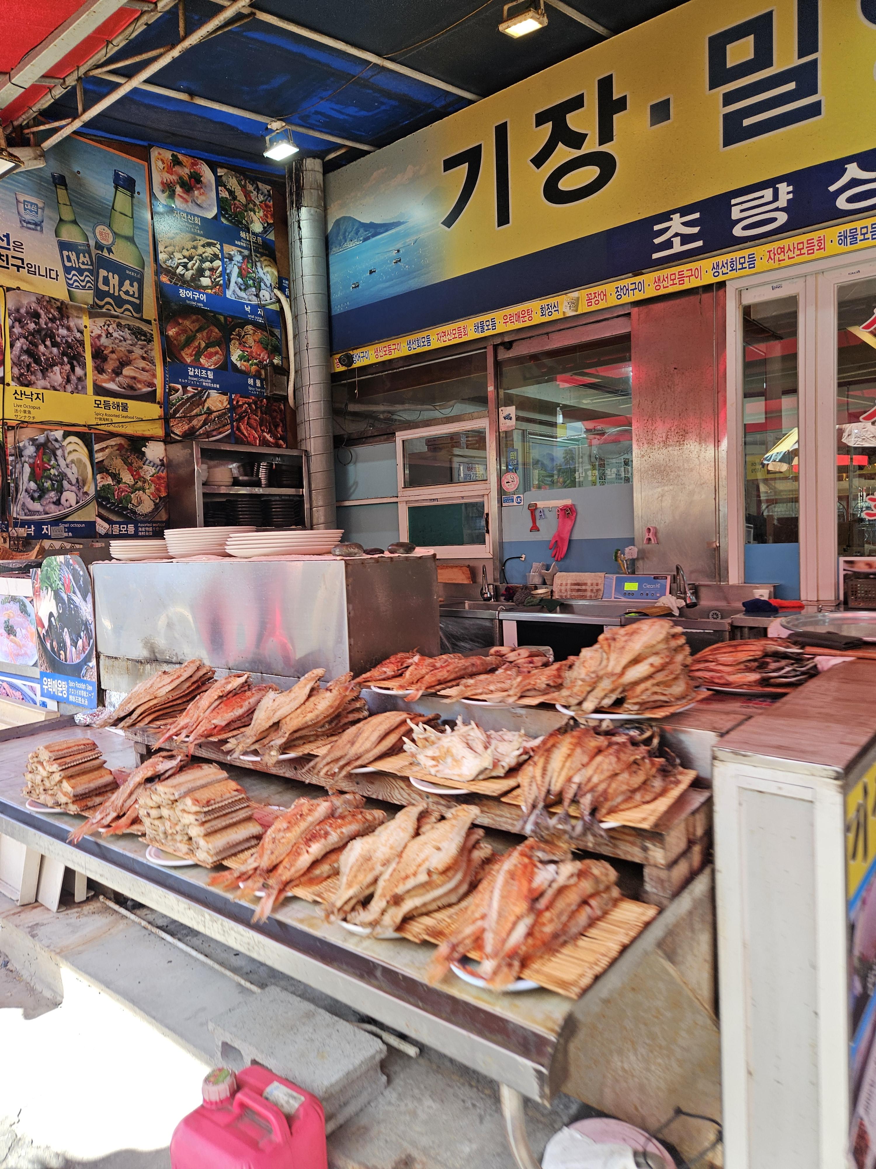 수산물 건어물 회 생선구이 곰장어 등 노포도 많아서 식사하는 분들도 많다.