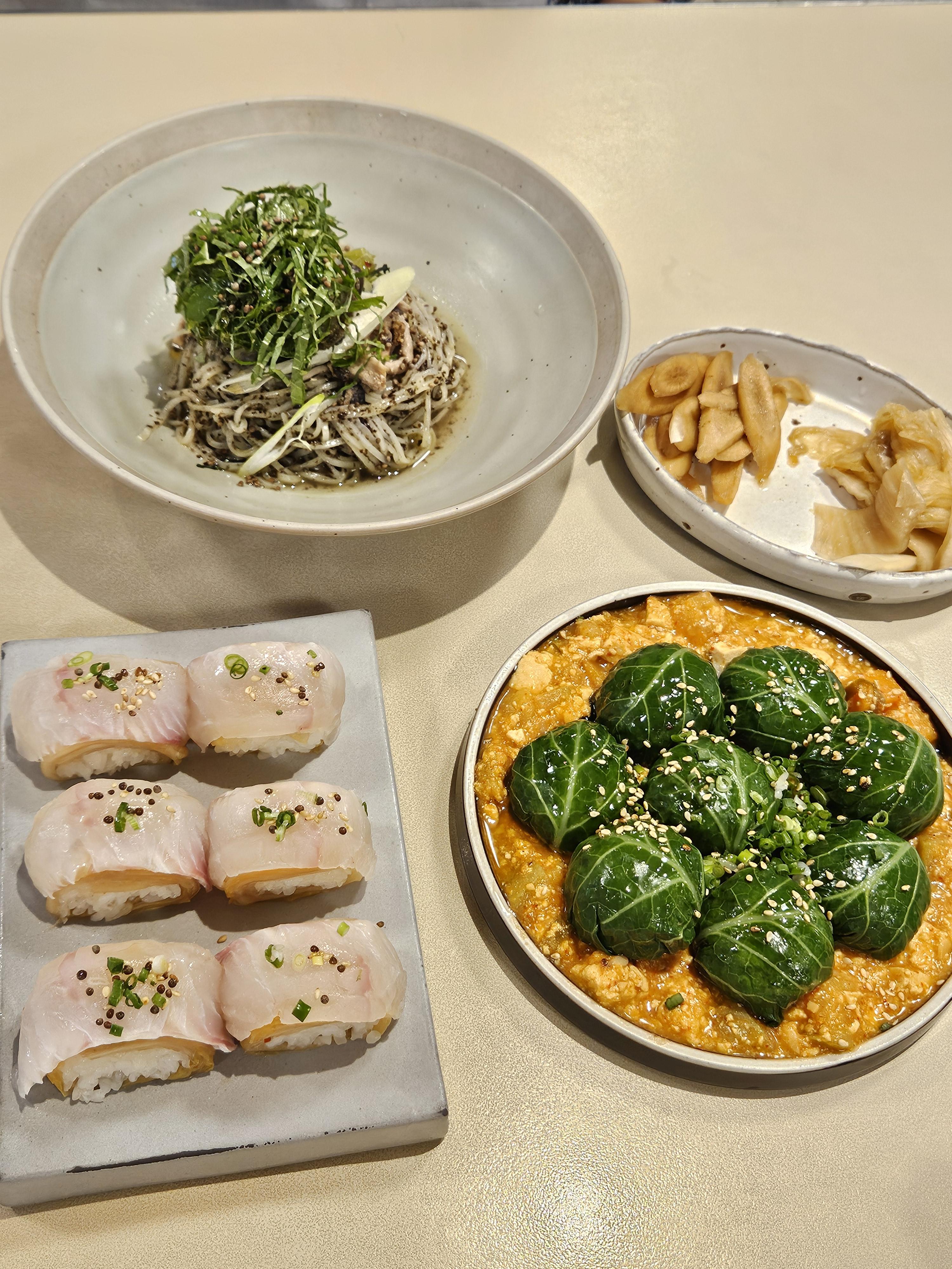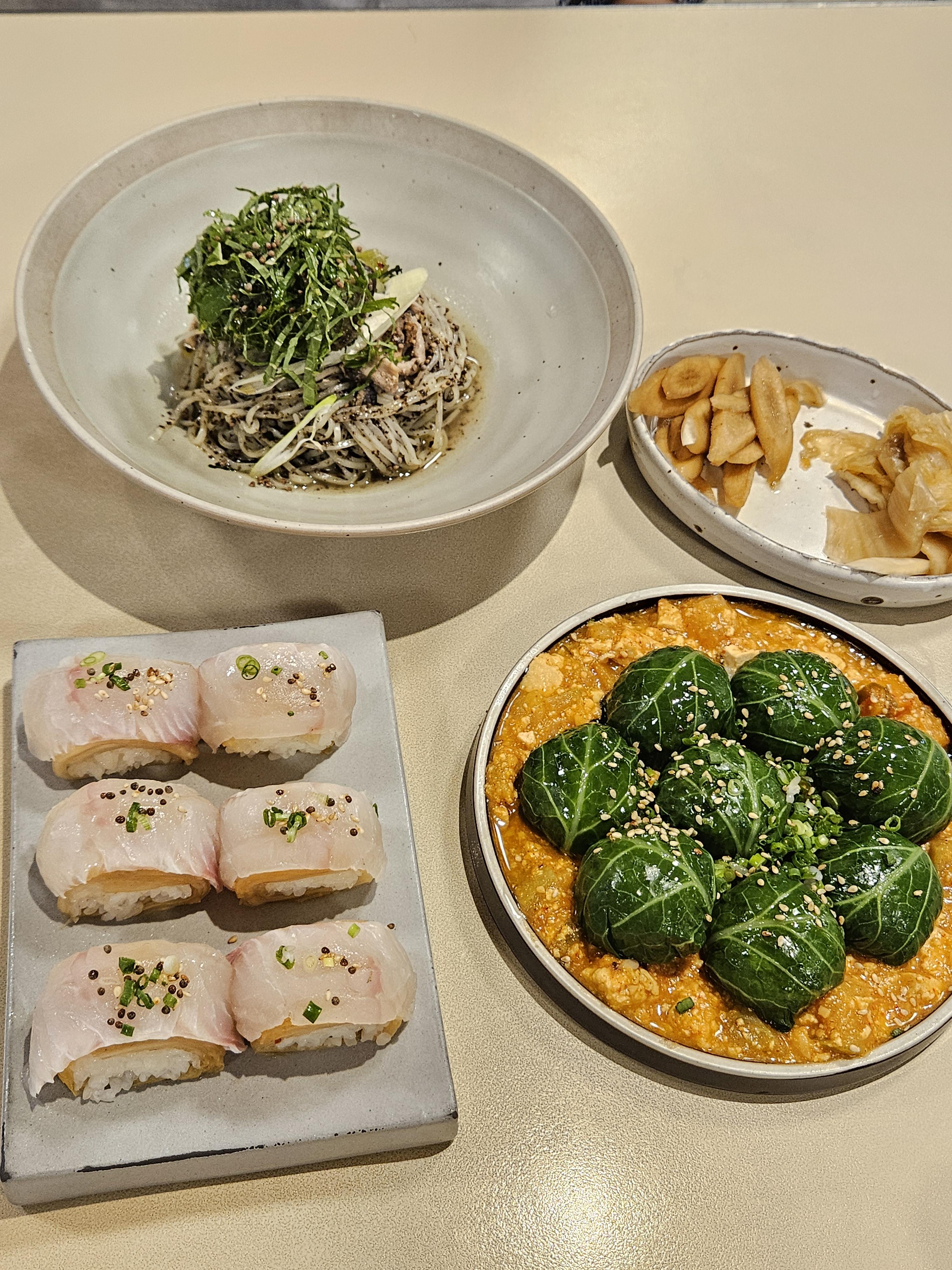 제철회 묵은지 말이는 회는 광어같이 담백했는데 묵은지가 너무 많이 두껍게 말려있어 짜다.