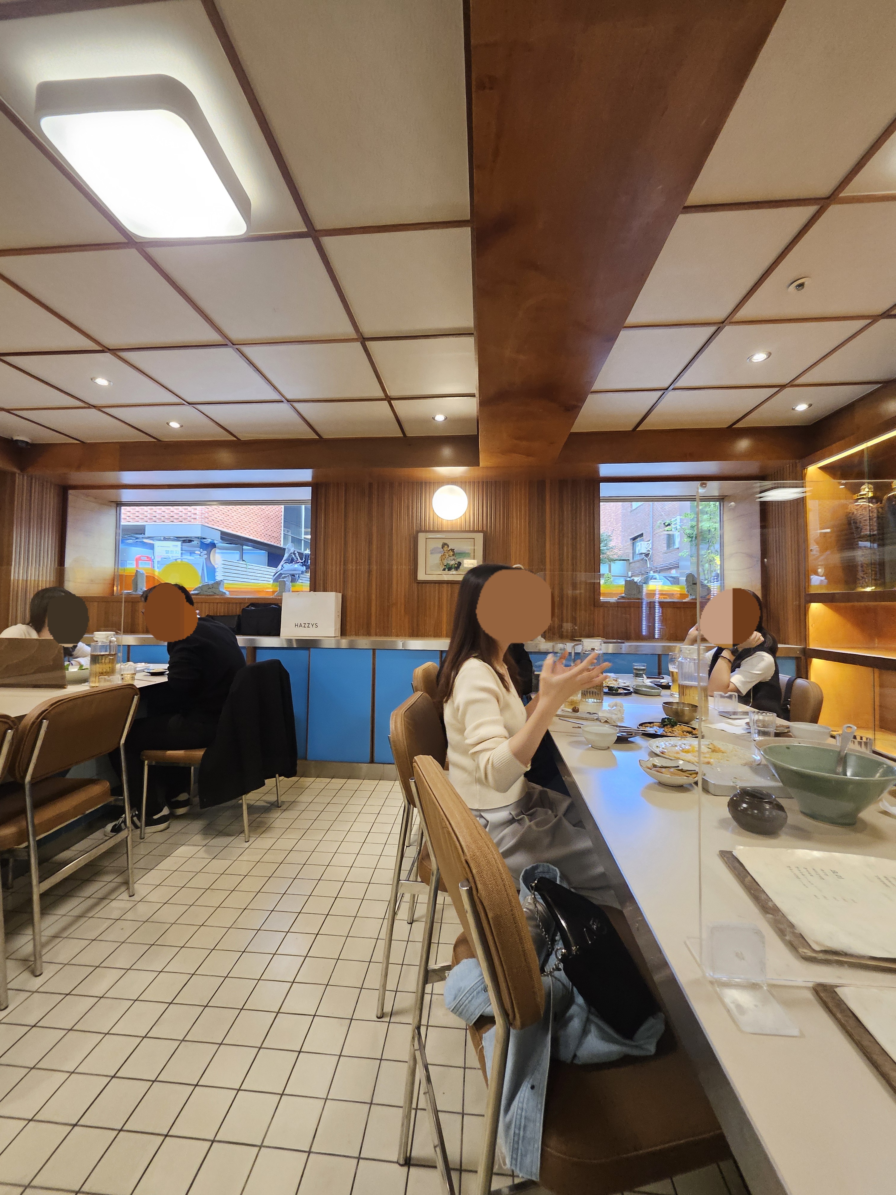 원테이블 자리는 투명 파티션을 올려둬서 좌석 구분을 해놨는데 프라이빗한 느낌은 아니고 외투 걸이가 화장실 가는 방향에 비치되어 있었음.