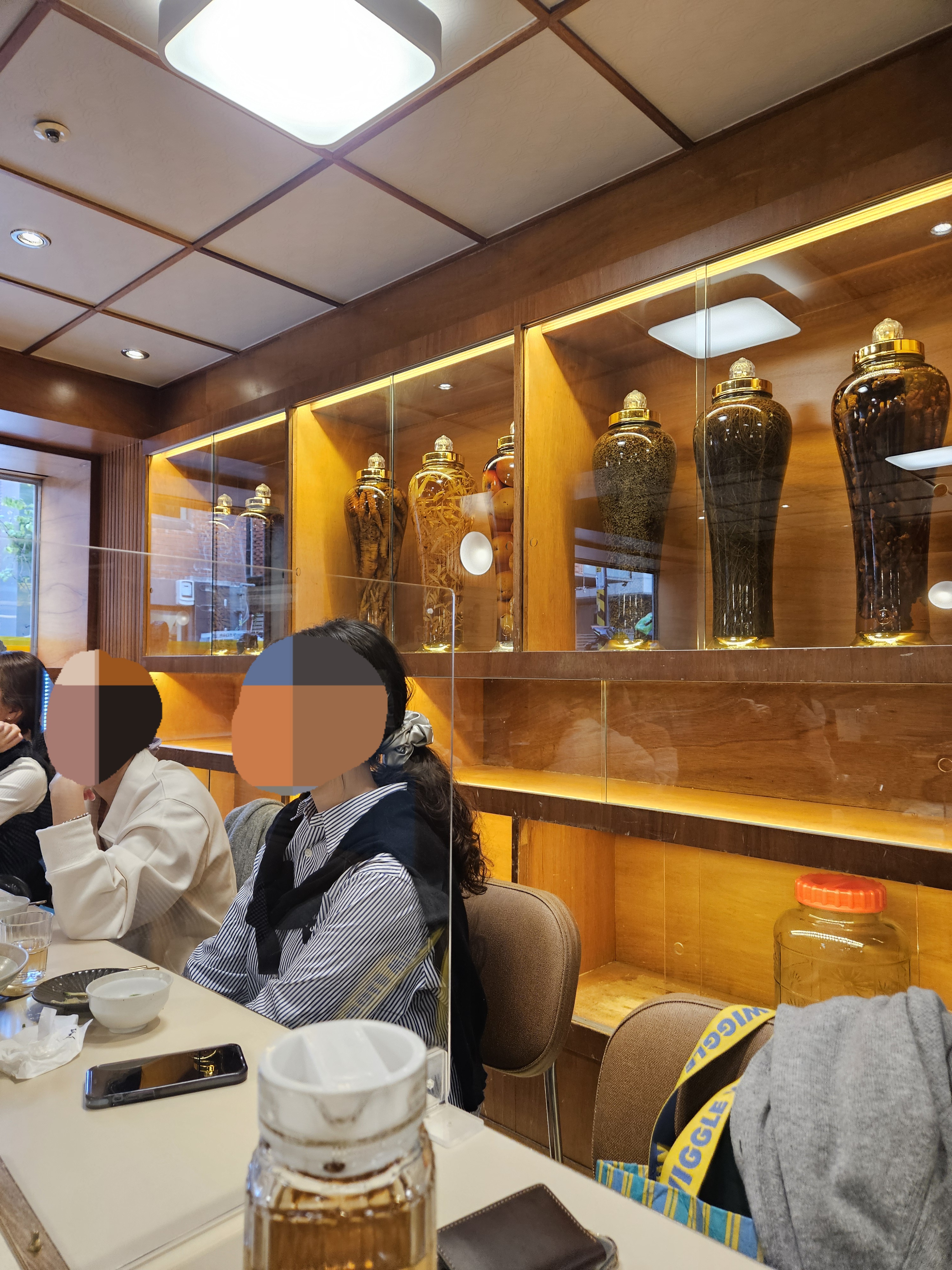 벽면에 대형 담금주 병에 더덕등 다양한 식재료 담아둬서 신선한 모습이었다. 기본찬을 묵은지랑 우엉절임을 내주던데 이렇게 만든 걸까 싶기도.