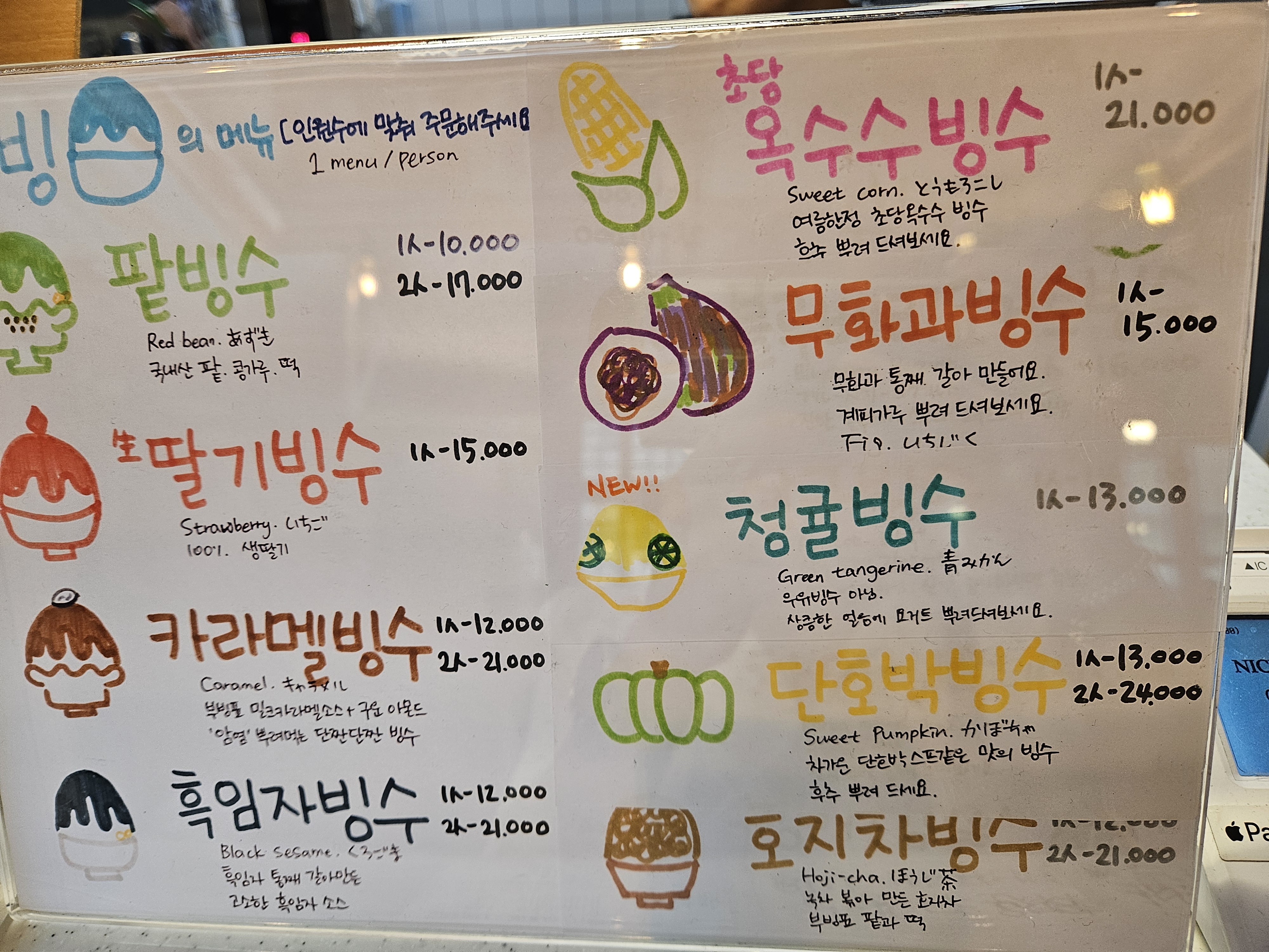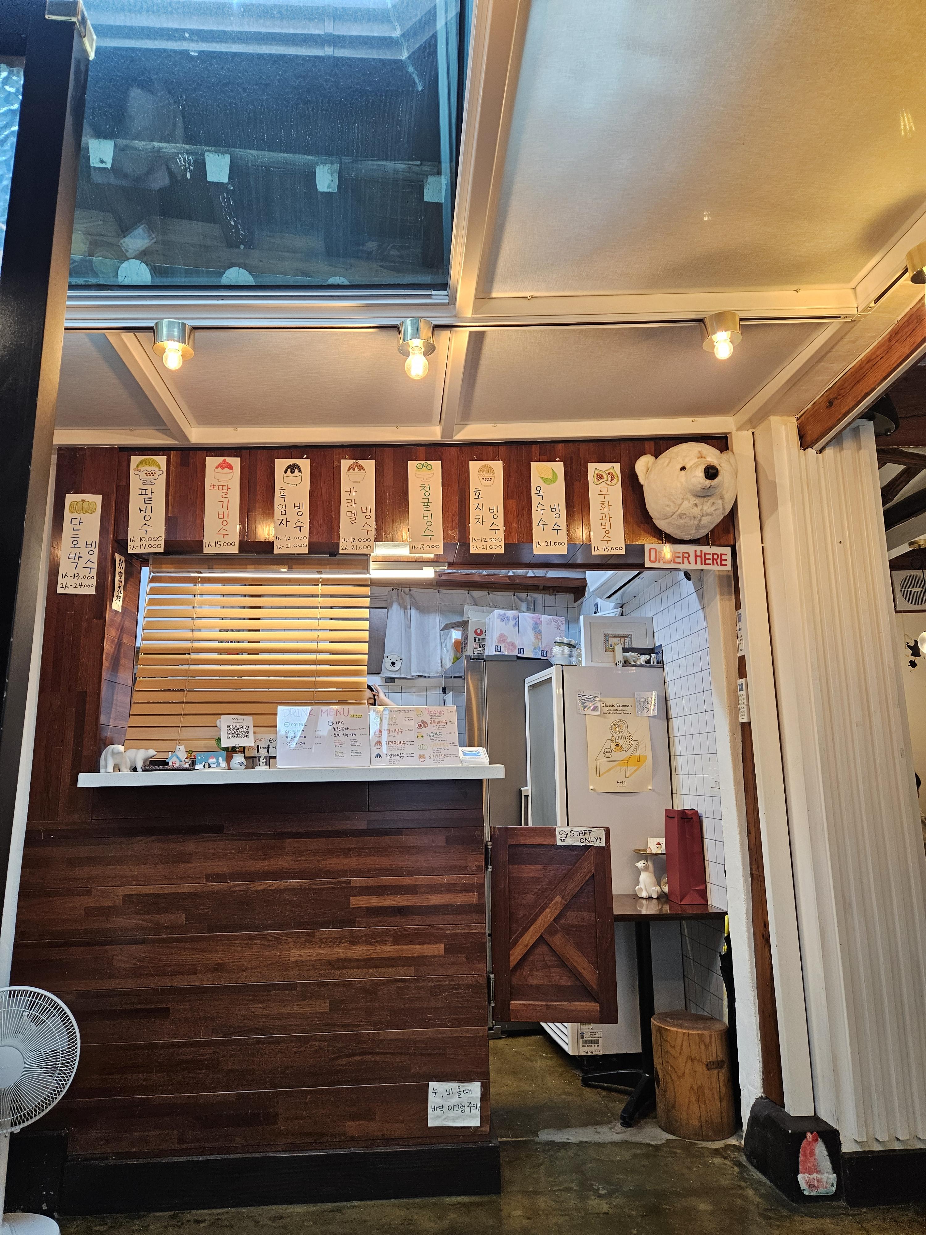 대기가 있었는데 안에 대기할 수 있는 벤치가 있어서 조금 기다리니 자리 났고 카운터에서 주문하는데 밖에서 보이지 않아 히든 메뉴 같던 단호박 빙수도 있더라.