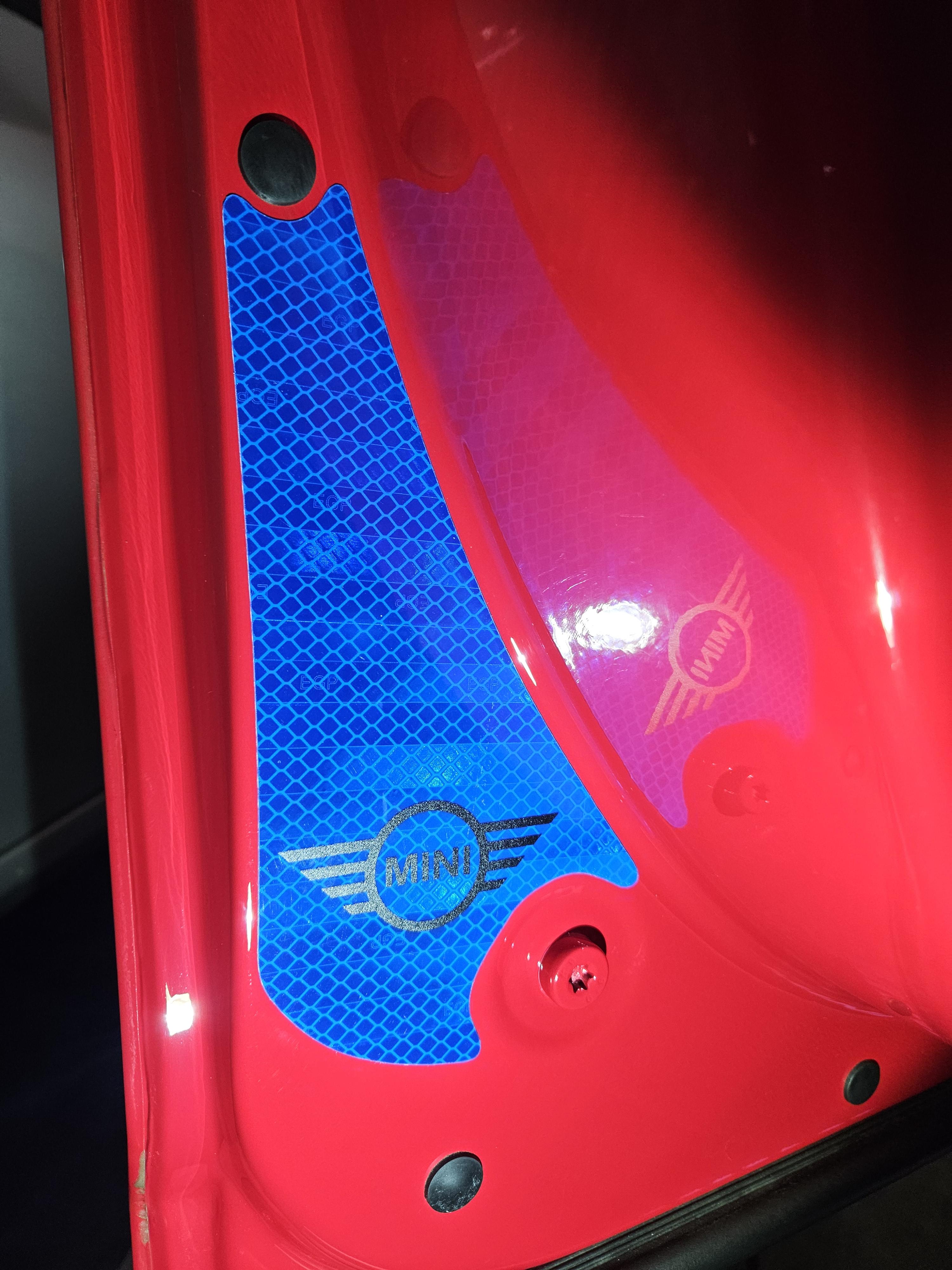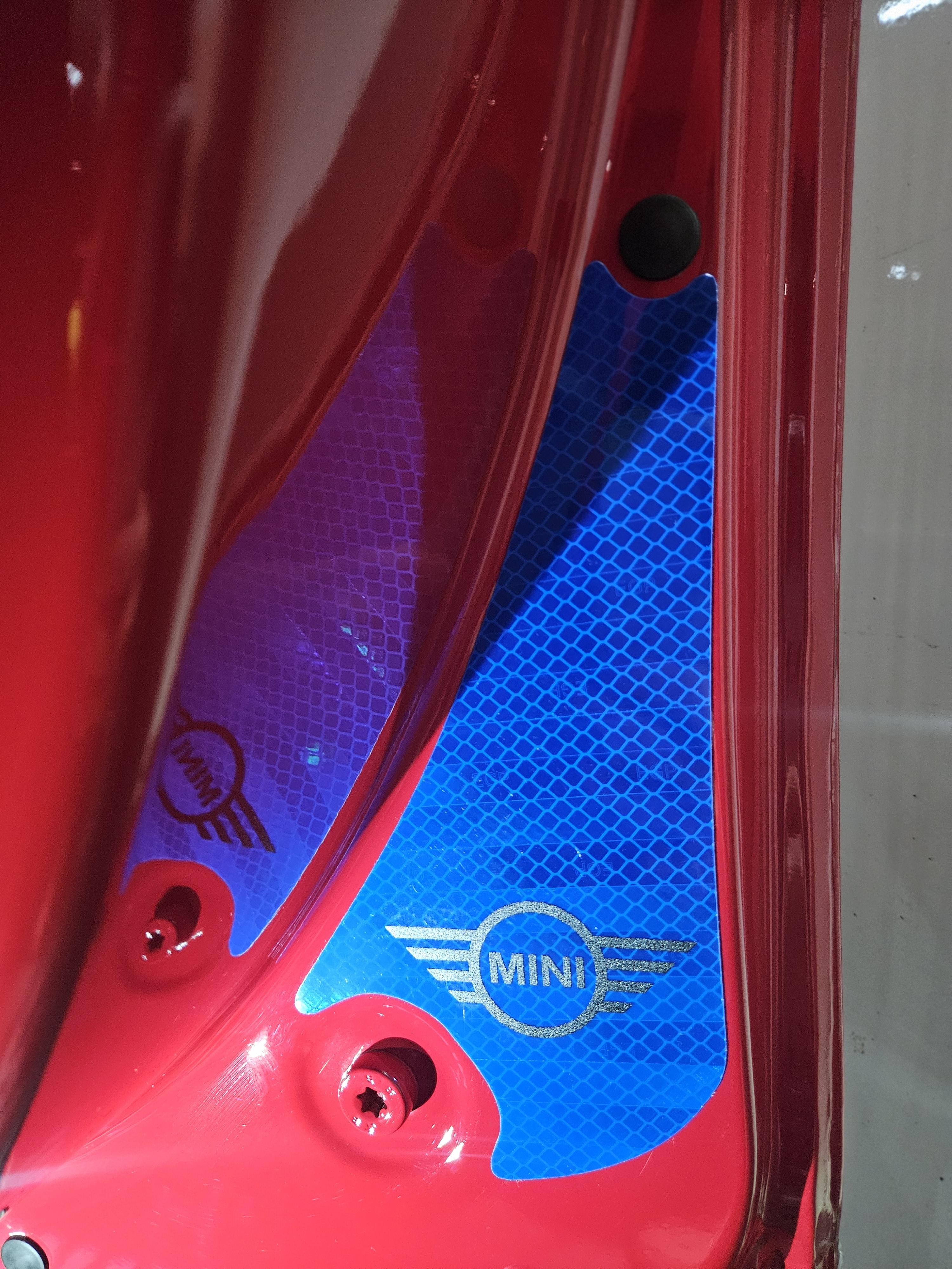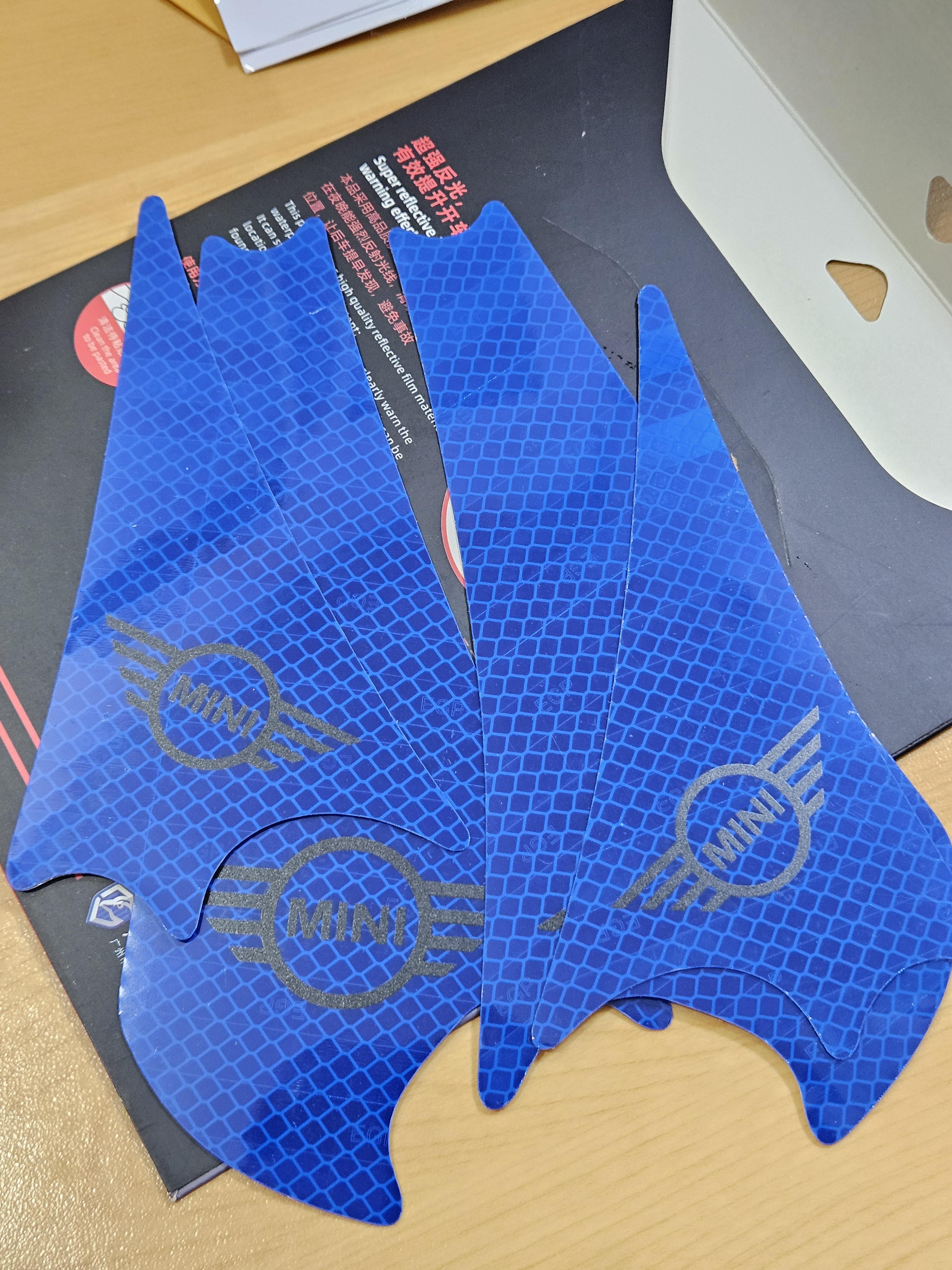 야광 스티커는 4개 문 하단에 모두 부착함. 컬러가 노란색 하고 블루가 있는데 노란 건 품절이라 블루로 주문했는데 빨간 문짝과 잘 어울림. 이건 안전을 위함이라 밤에 어두운 데서 잘 보이는지 확인 필요.