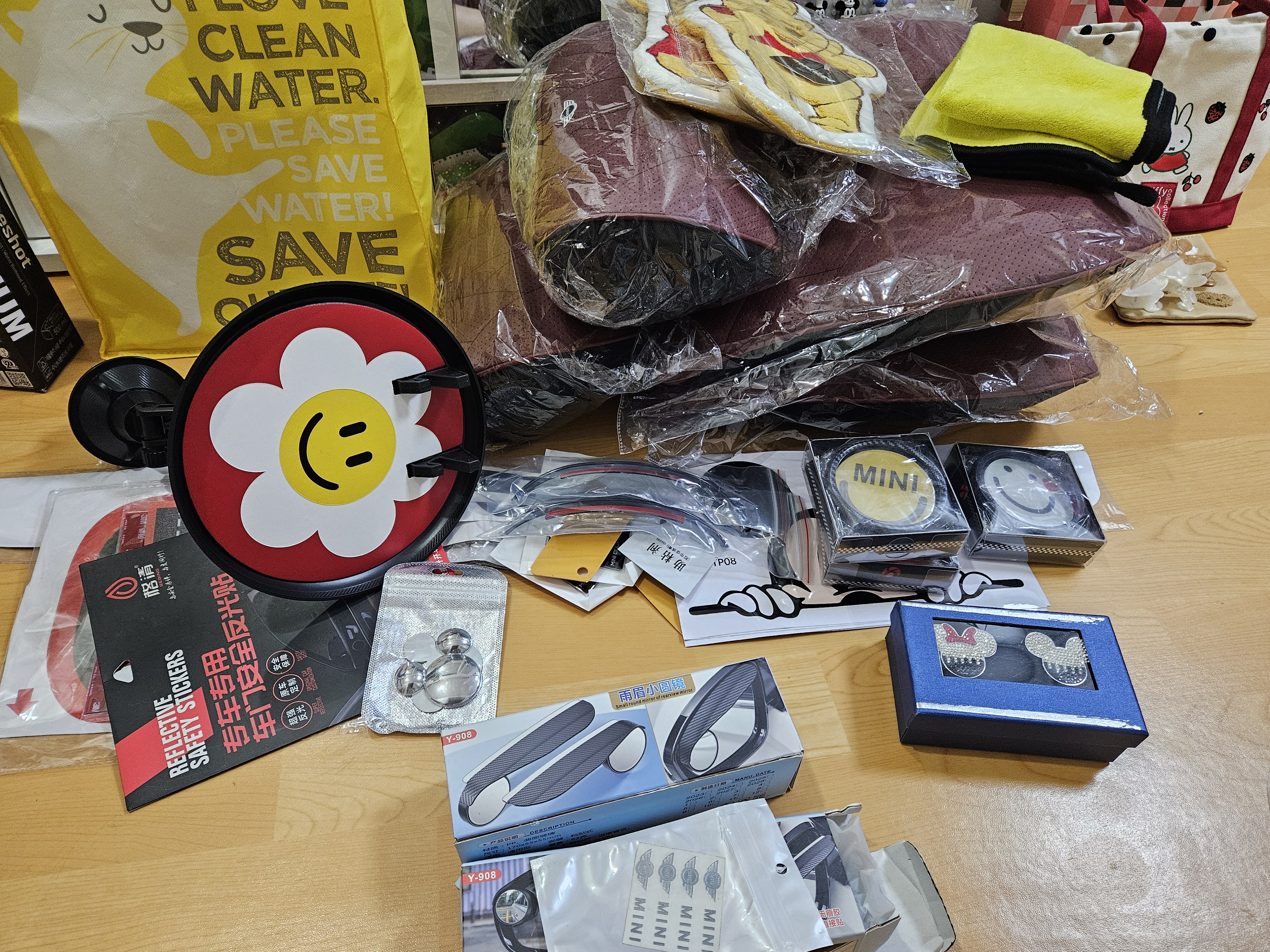 차량용품 액세서리로 고뱃지, 데칼스티커, 주유구 스티커, 야광 스티커, 컵홀더 트레이, 브레이크 등 스티커, 발판 스티커, 극세사 캐릭터 수건, 등쿠션과 목쿠션, 데칼용 태그 스티커, 번호판 나사, 사이드미러 빗물커버 등 구입했는데 구입한 목록 보니 거의 스티커라 이번엔 지난번 후미등 구입과는 달리 제약 없이 꾸밀 수 있다는 점이 좋았다.