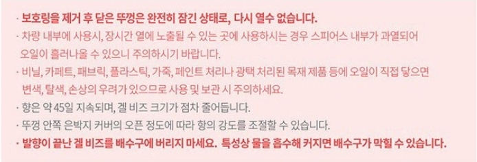 밀봉된 은박 커버를 벗긴 후 뚜껑을 딸깍 소리 날때까지 돌리면 되는데 여기서 은박은 다 뜯을 경우 향에 민감하다면 너무 강한 향에 머리아플 수도 있다.