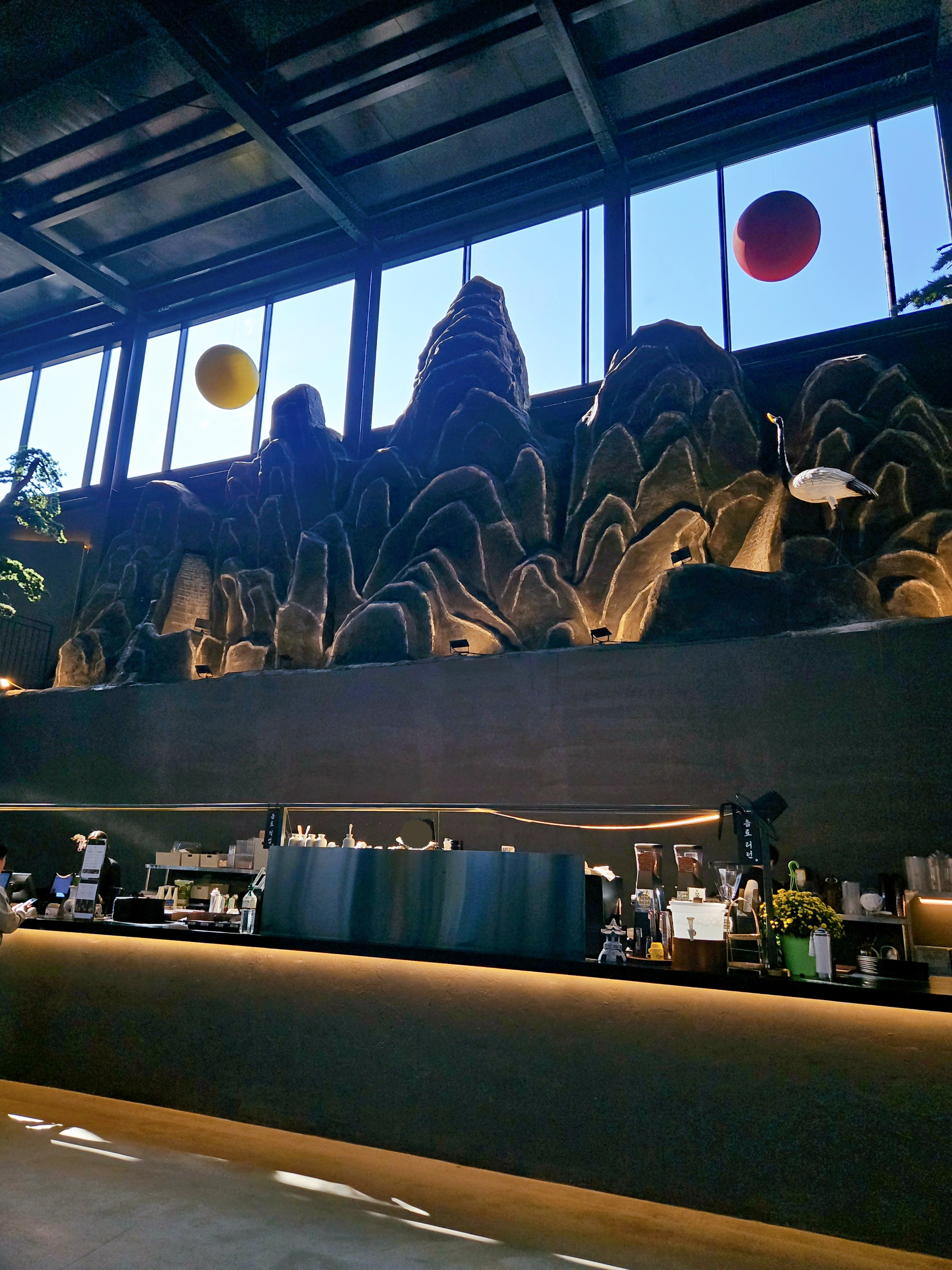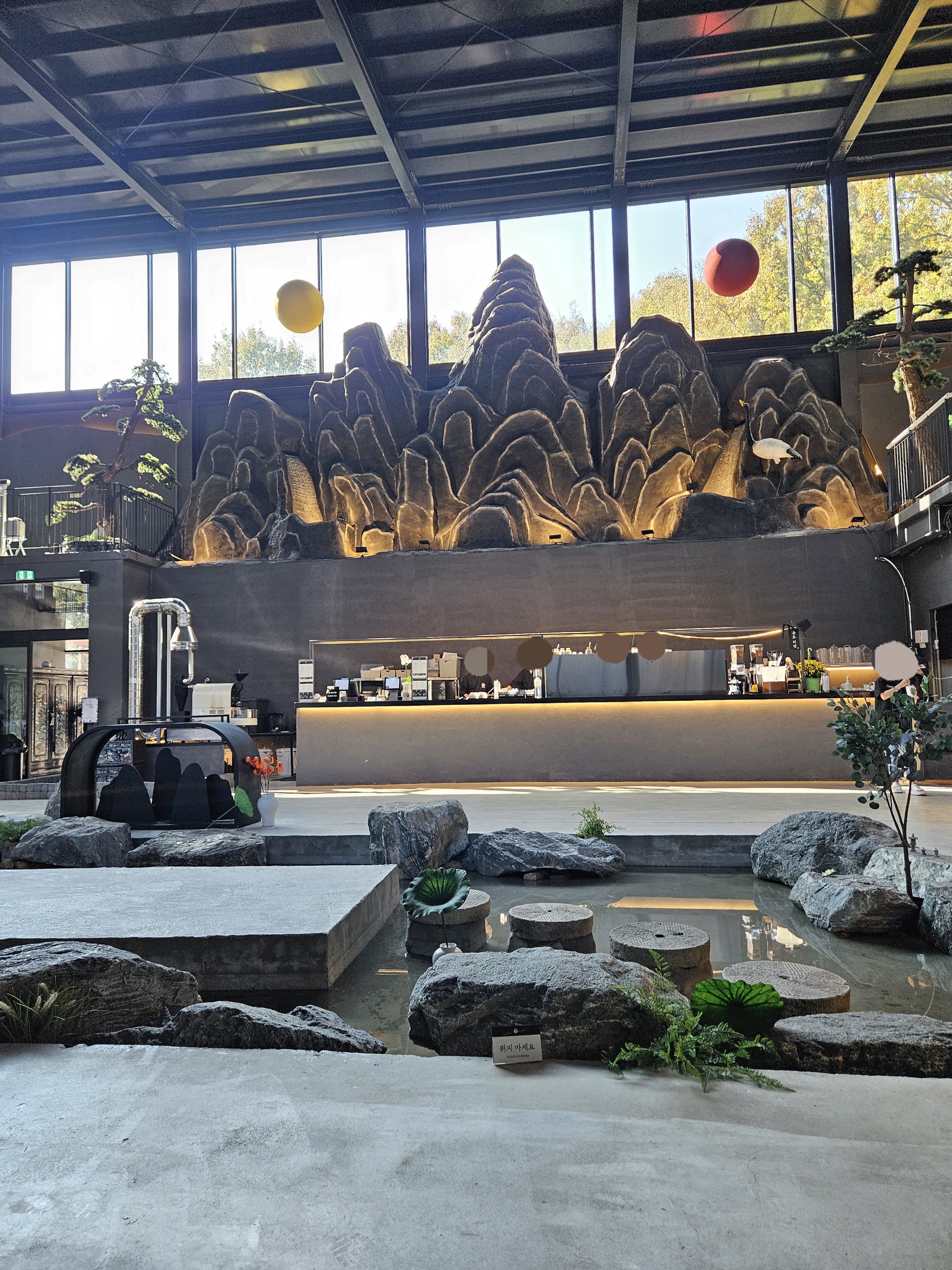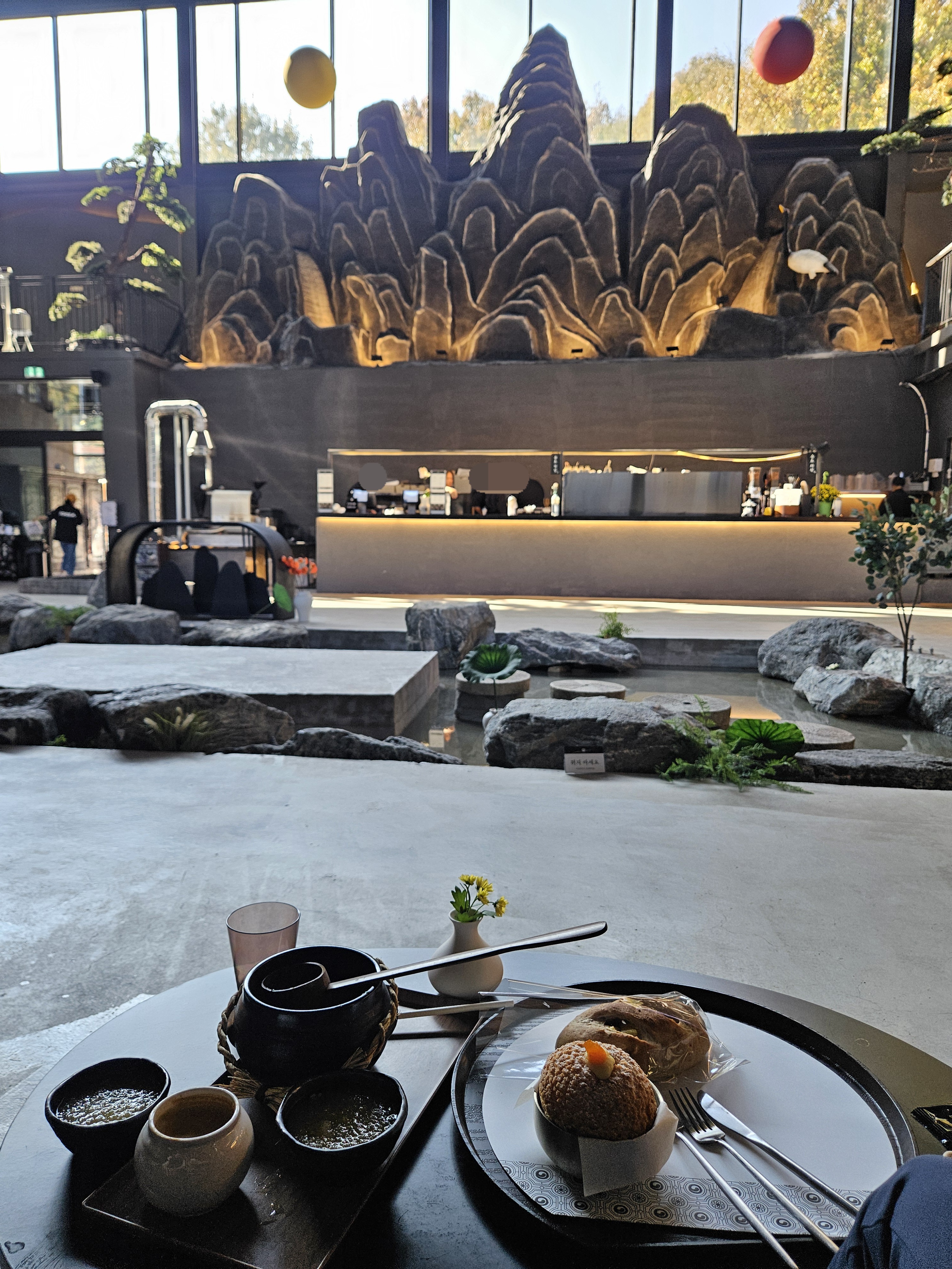 카페 내부로 들어가면 중앙이 확 트여있고 개울 같은 곳에 징검다리랑 나룻배, 카운터 벽면에 산, 해, 달 모형으로 꾸몄고 그 위에 창을 내어 하늘과 단풍 진 나뭇잎이 한눈에 들어오니 수묵담채화가 따로 없었던.