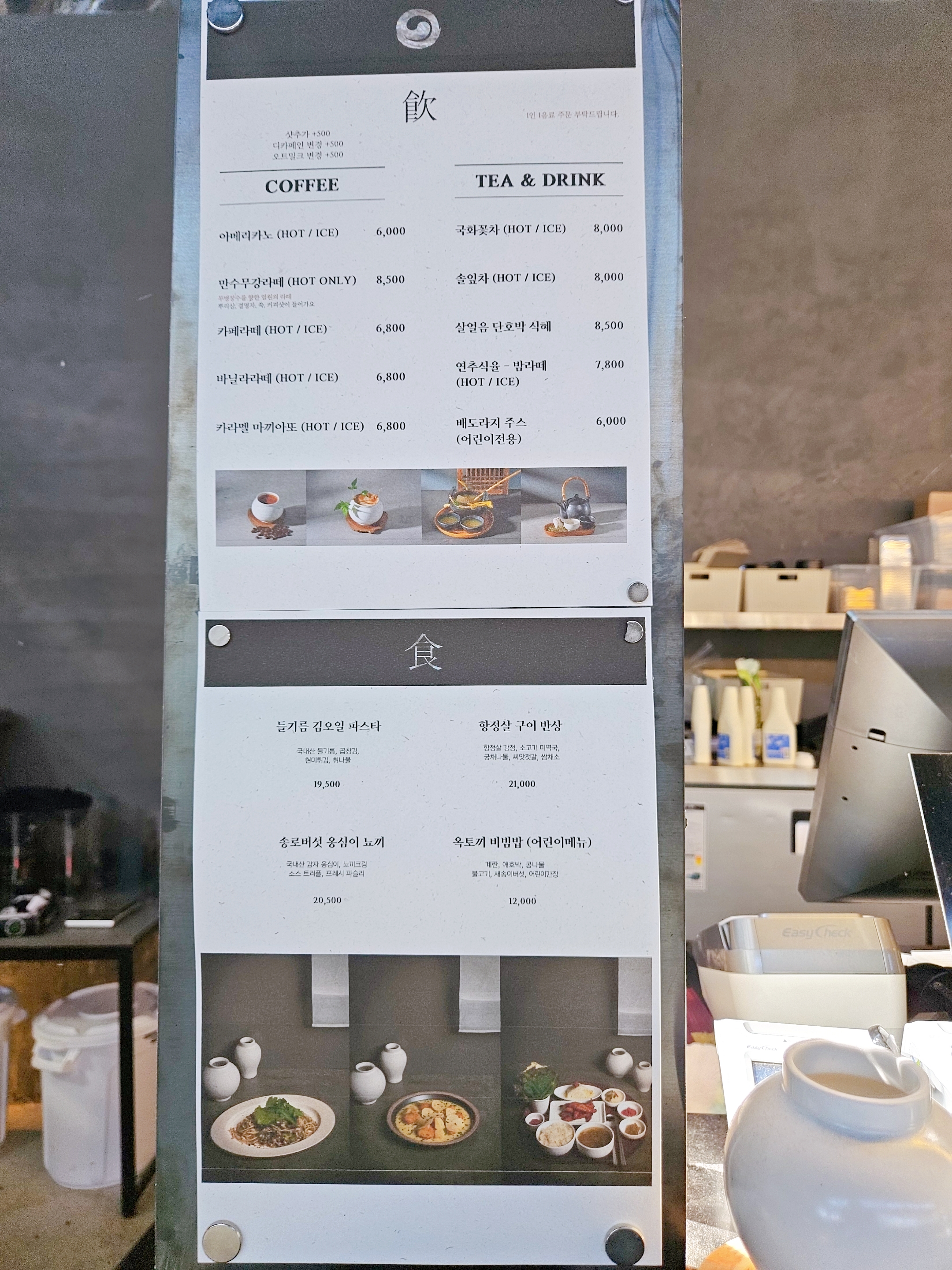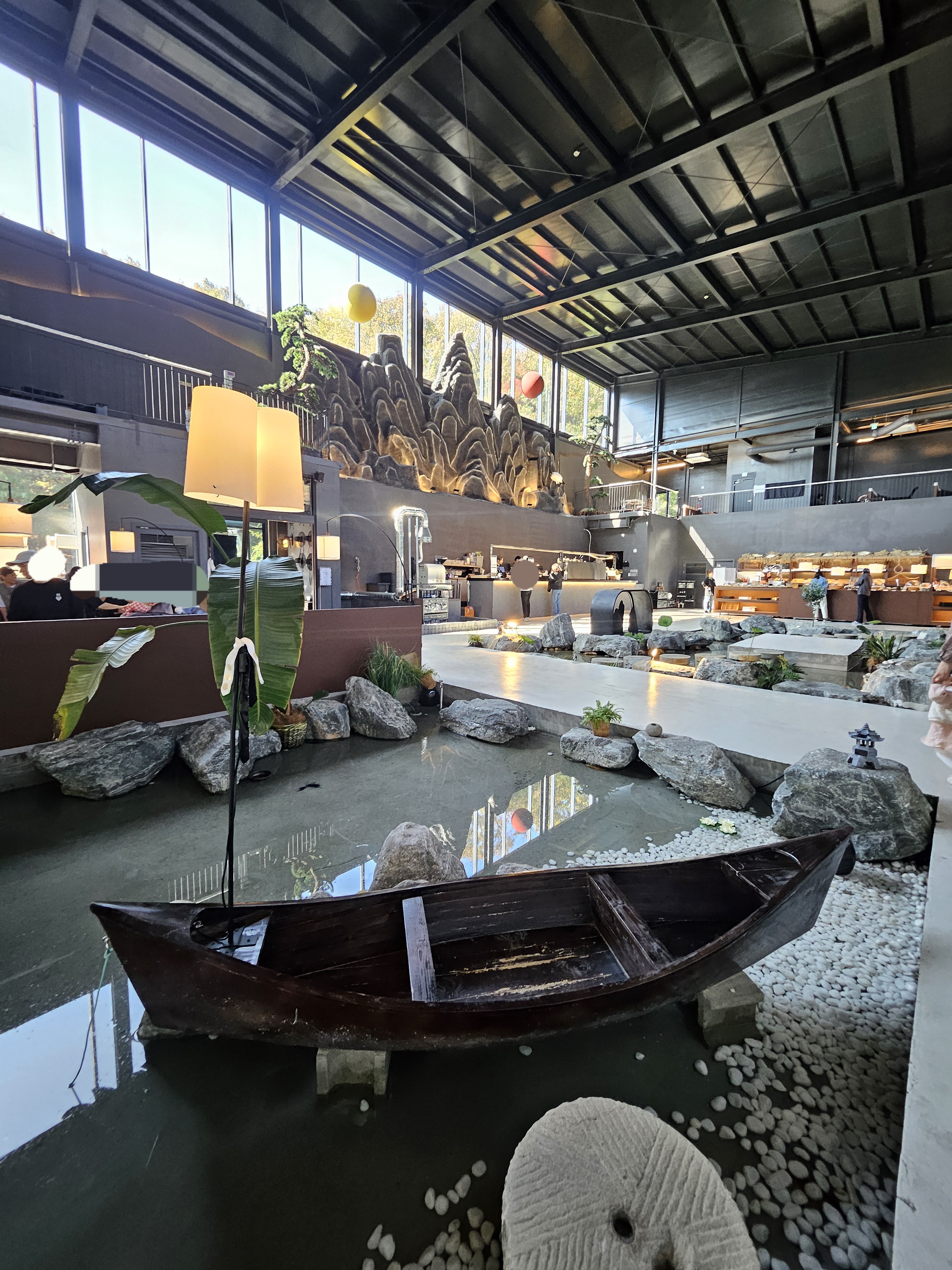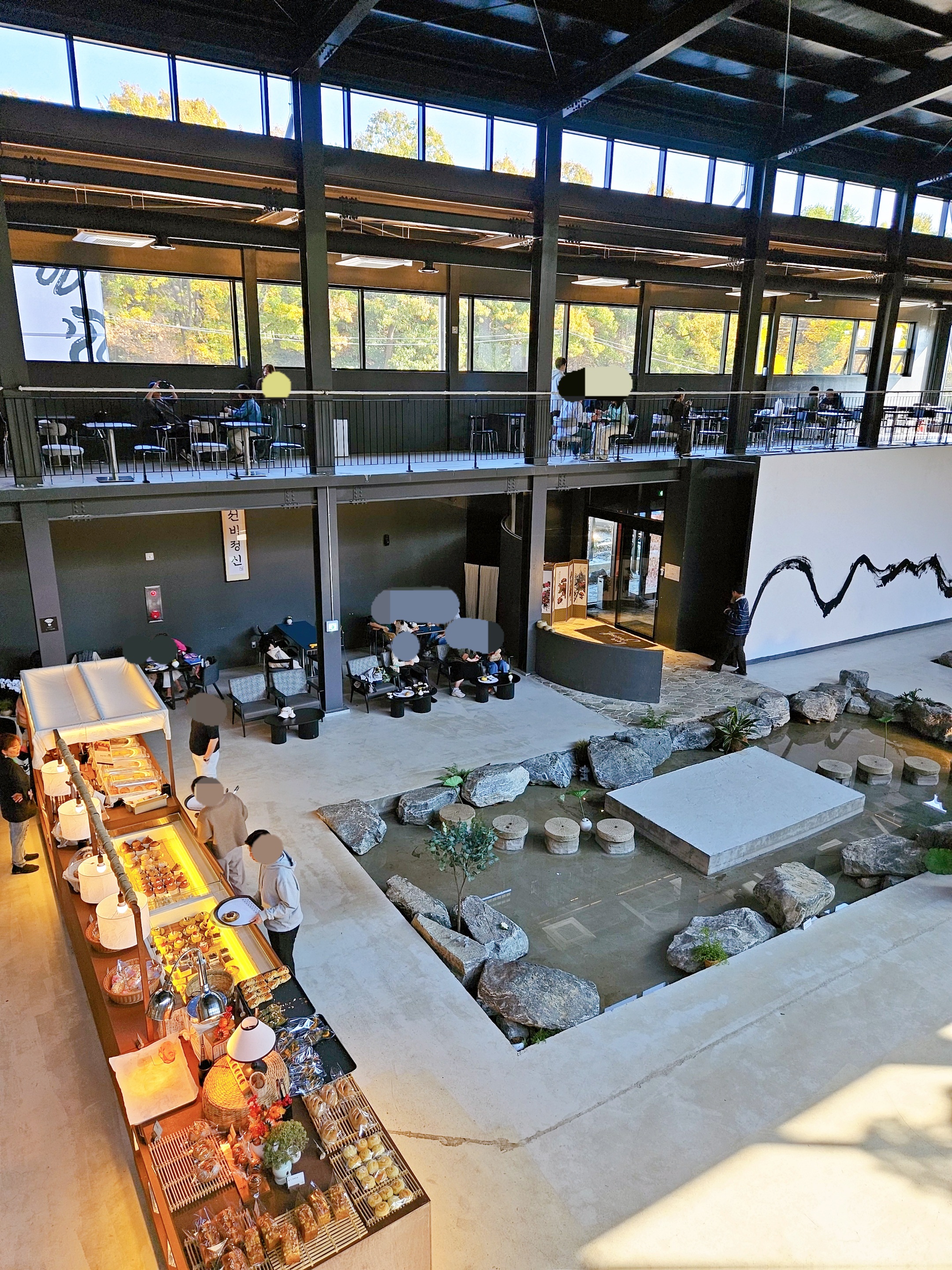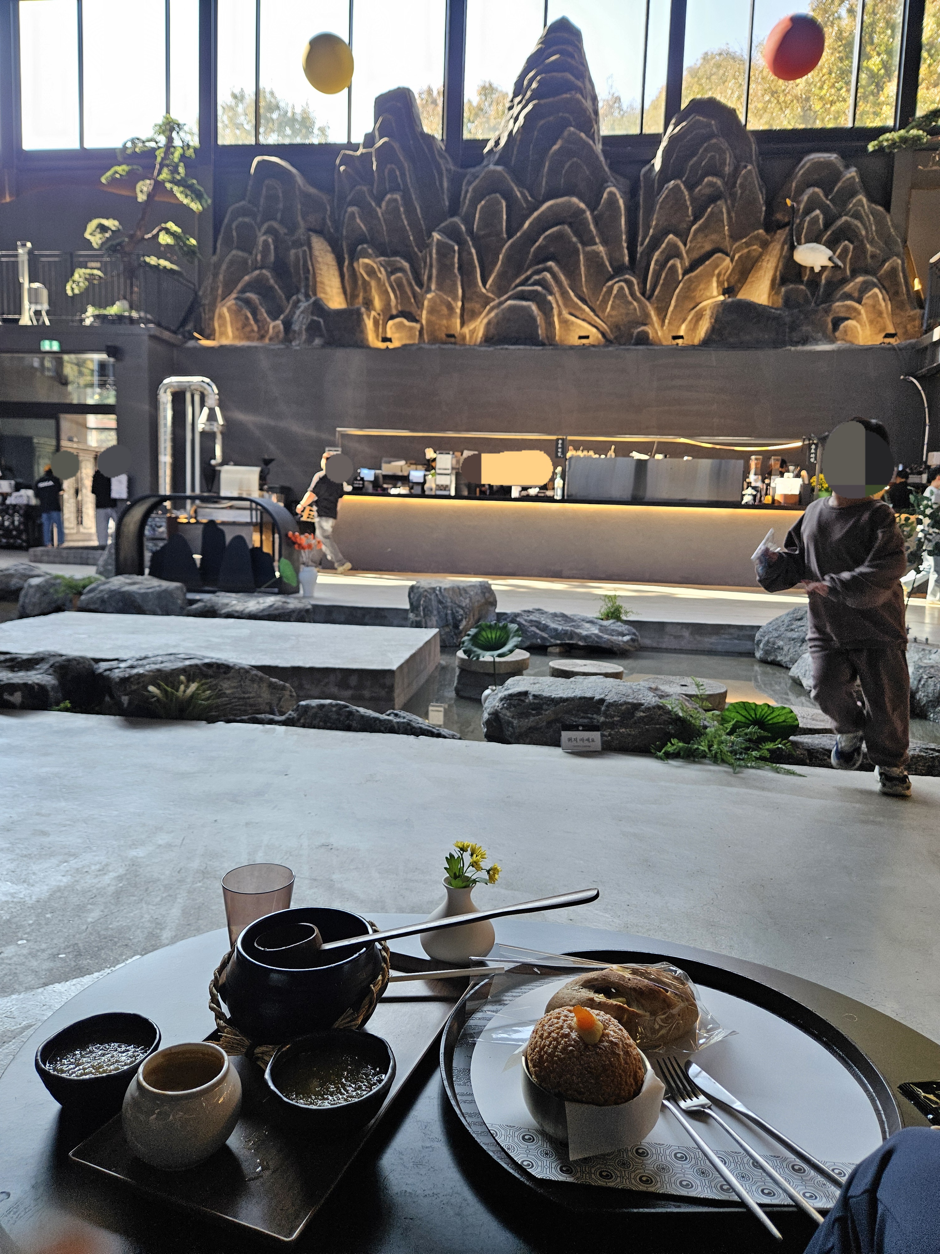 카페 내부로 들어가면 중앙이 확 트여있고 개울 같은 곳에 징검다리랑 나룻배, 카운터 벽면에 산, 해, 달 모형으로 꾸몄고 그 위에 창을 내어 하늘과 단풍 진 나뭇잎이 한눈에 들어오니 수묵담채화가 따로 없었던.