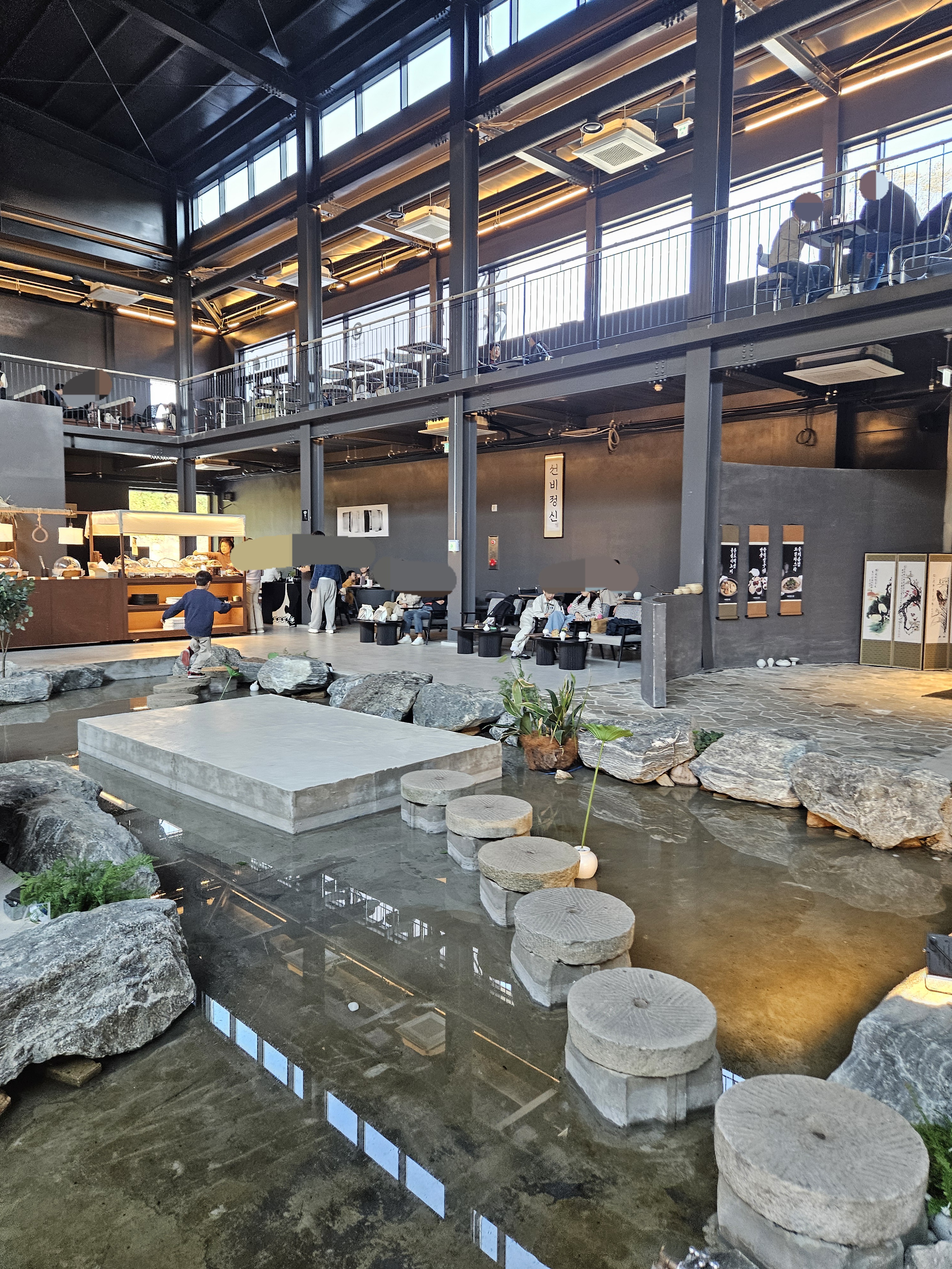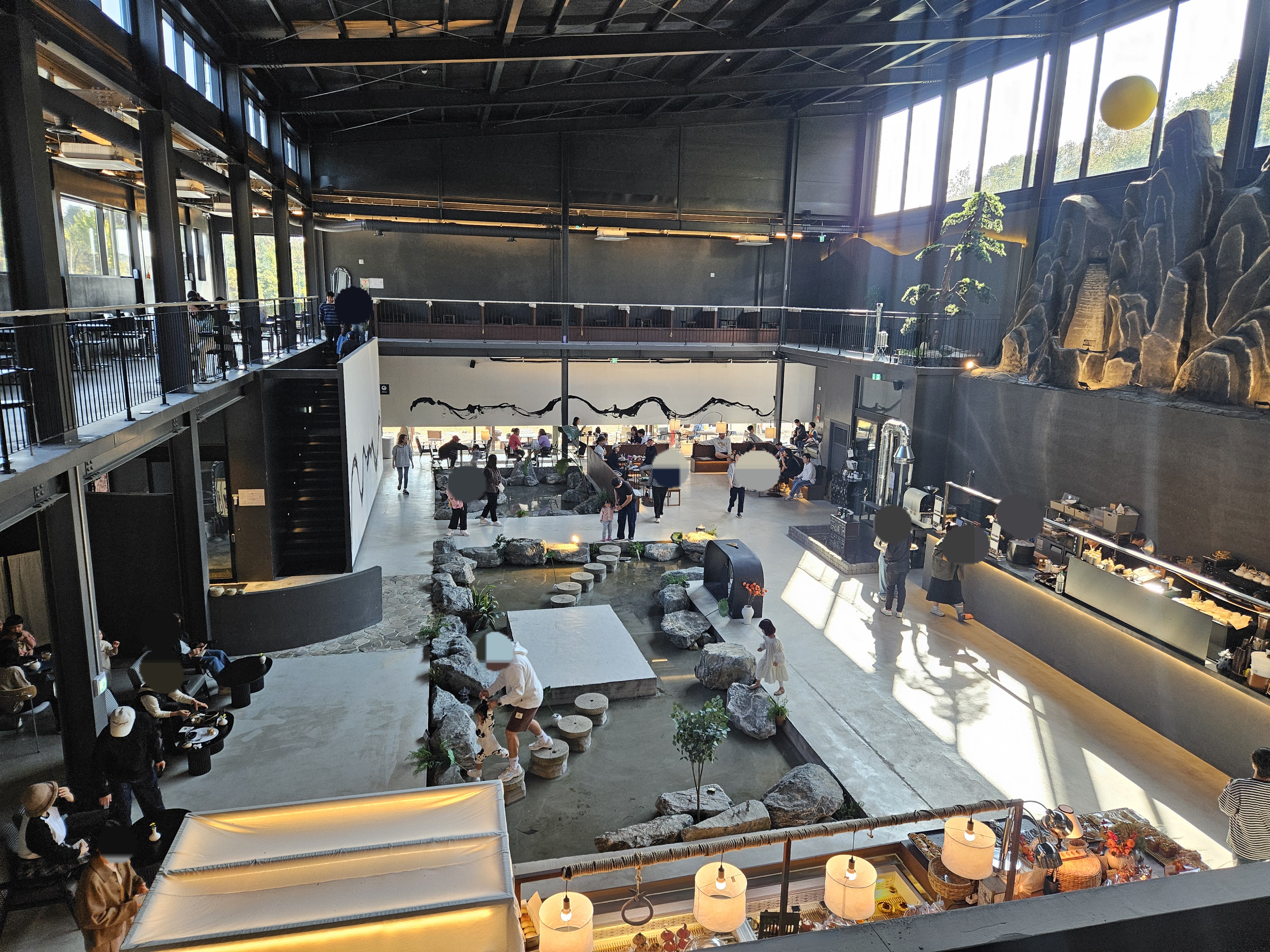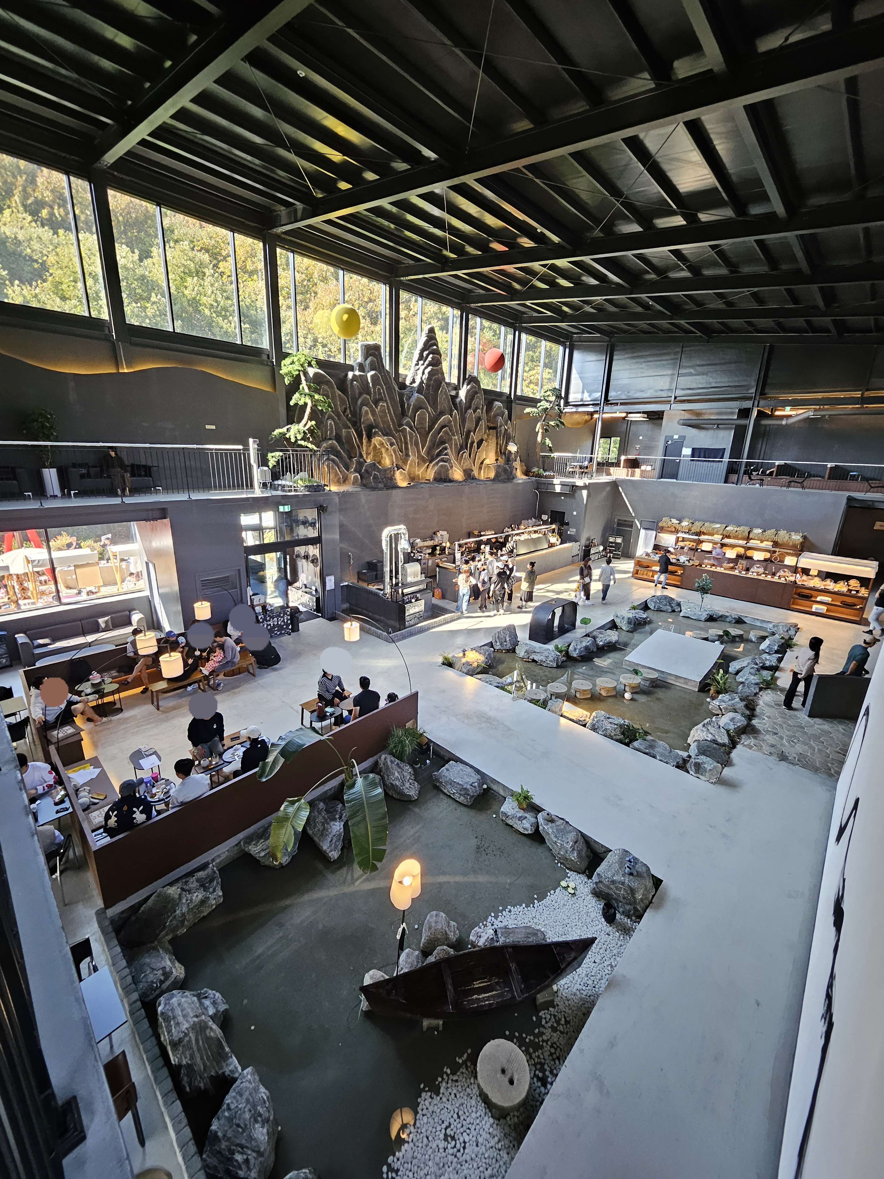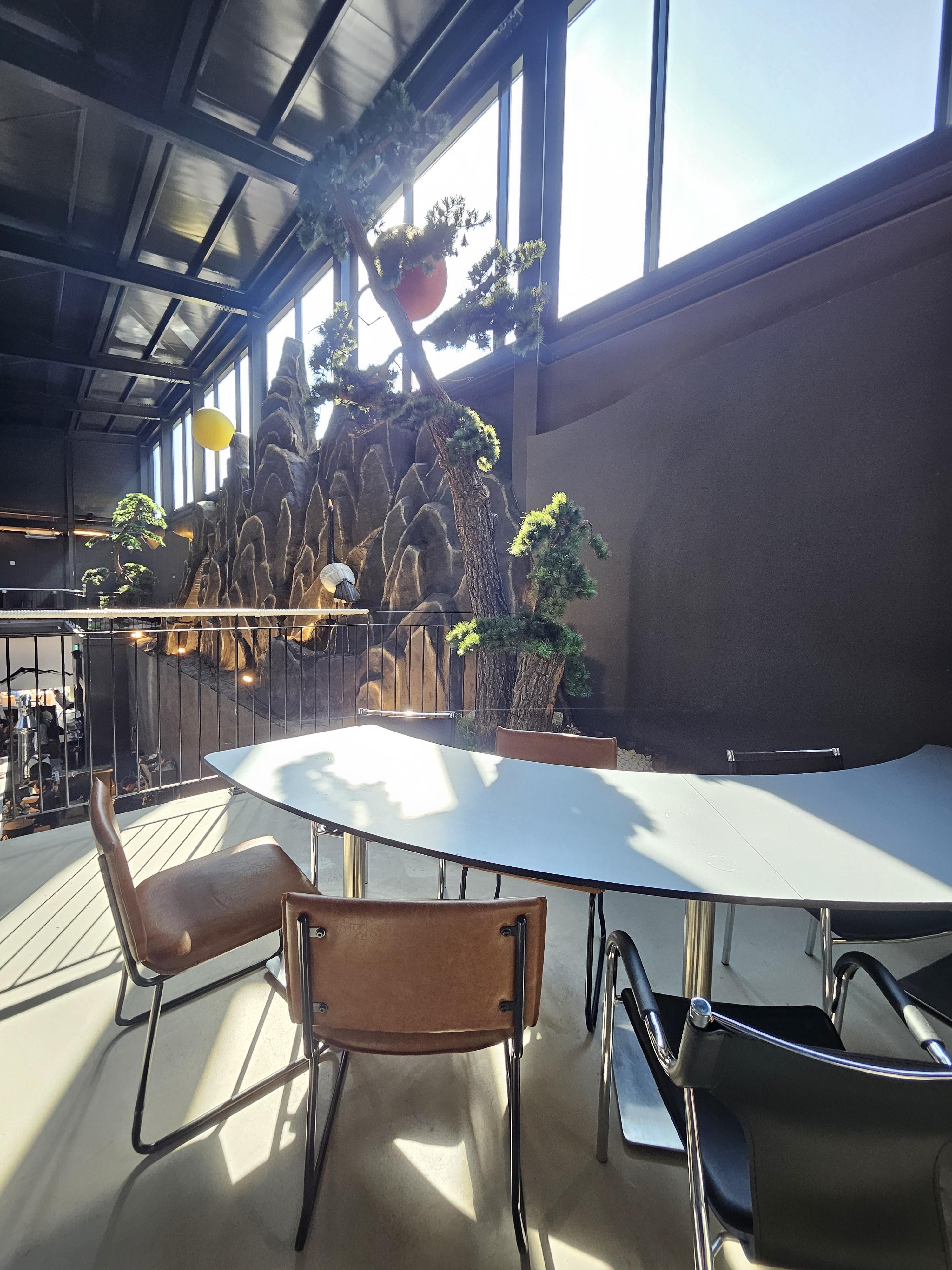 중앙엔 좌석 없이 조형물 등으로 꾸며놓았고 가장자리와 테라스에 좌석을 마련해 뒀다.