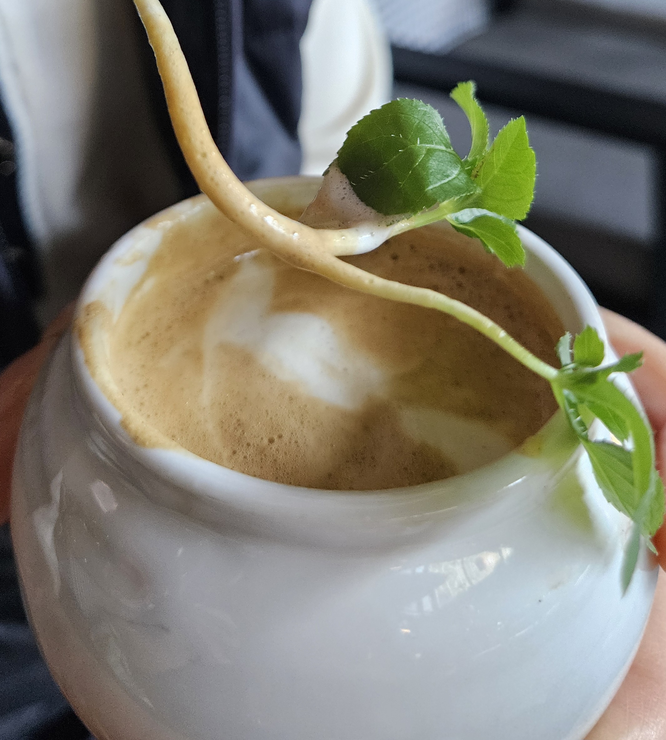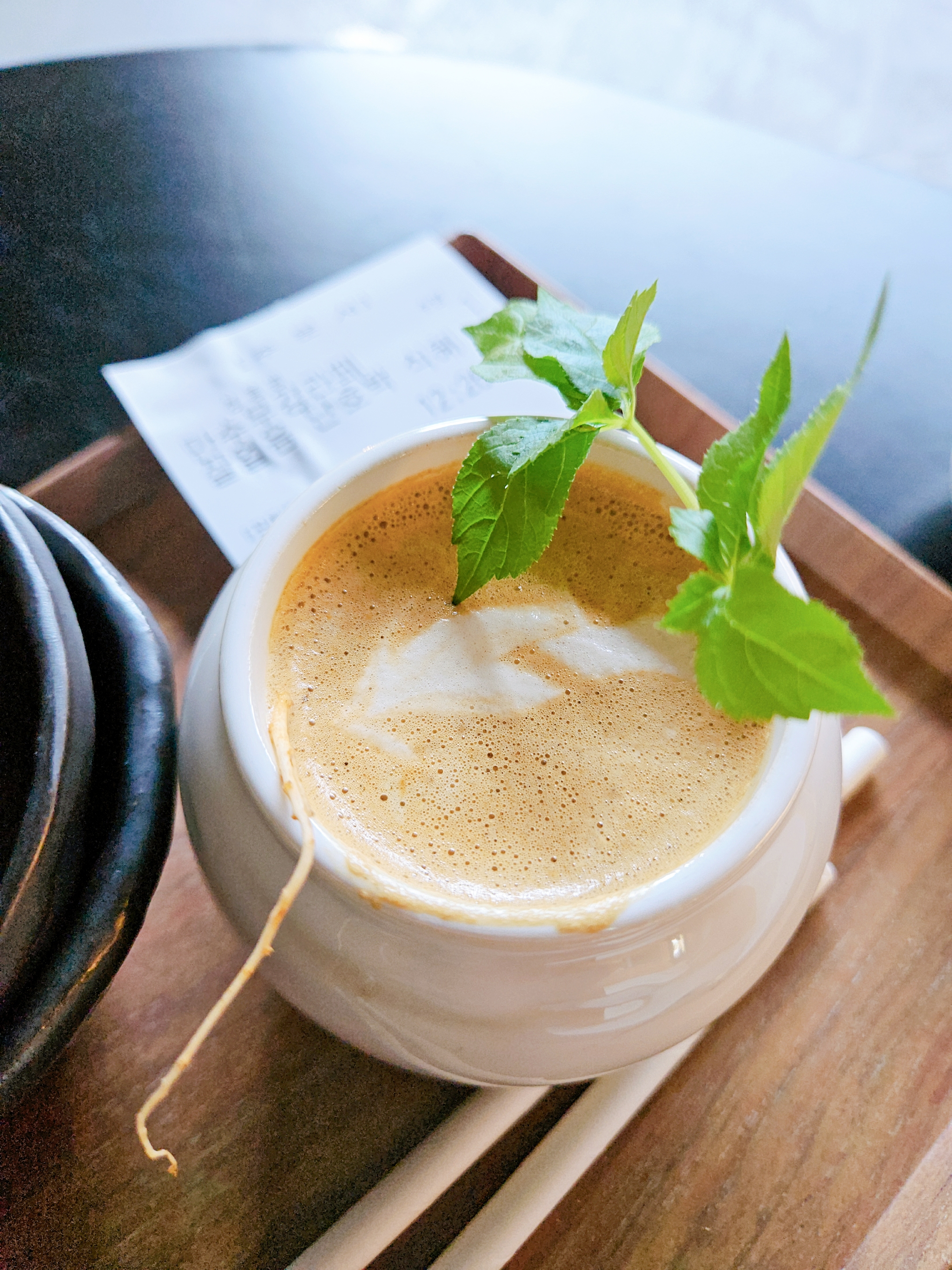 만수무강라테는 백자 같은 컵에다가 뿌리삼 올려서 담아줬는데 건강한 느낌 물씬.