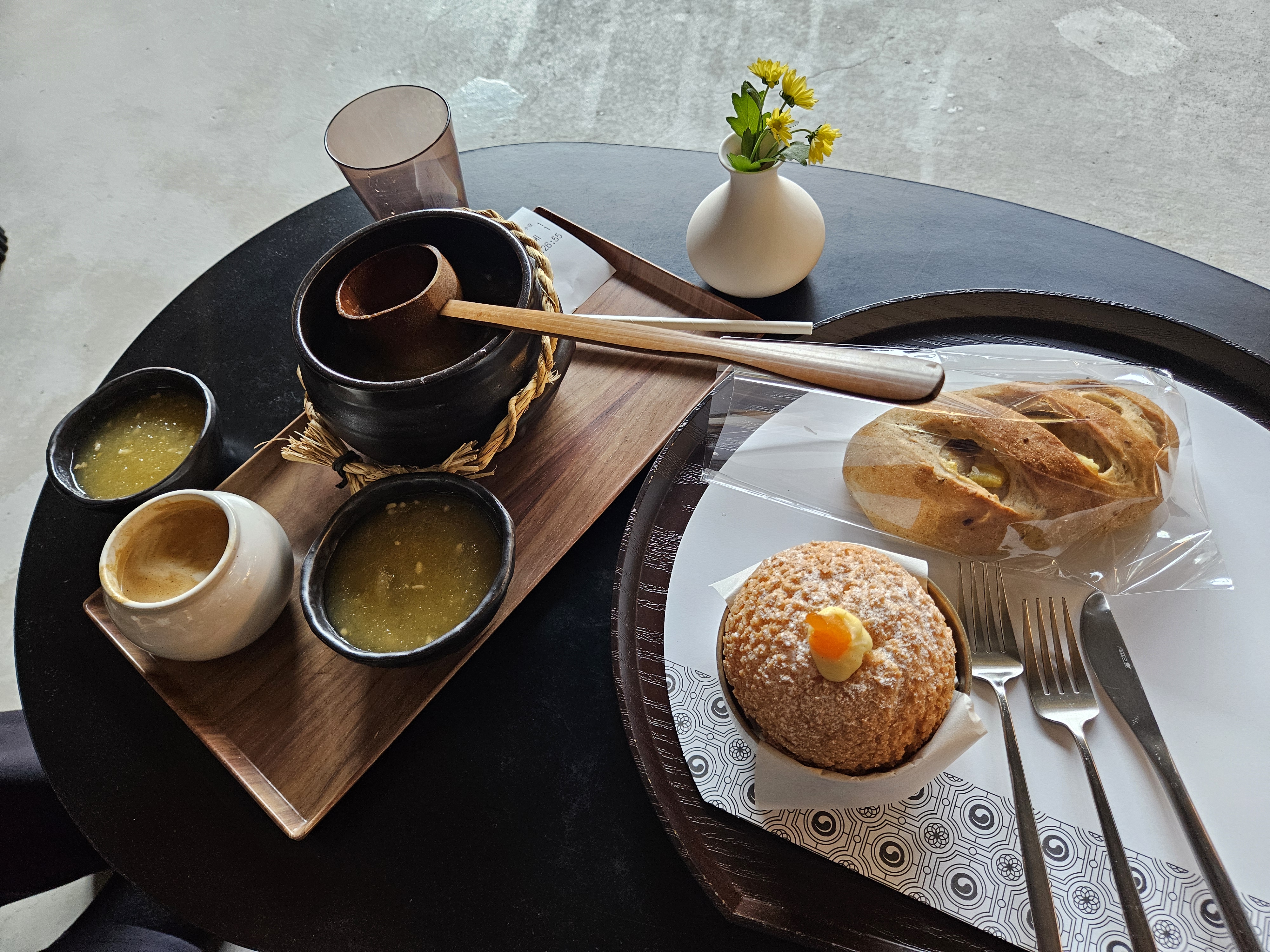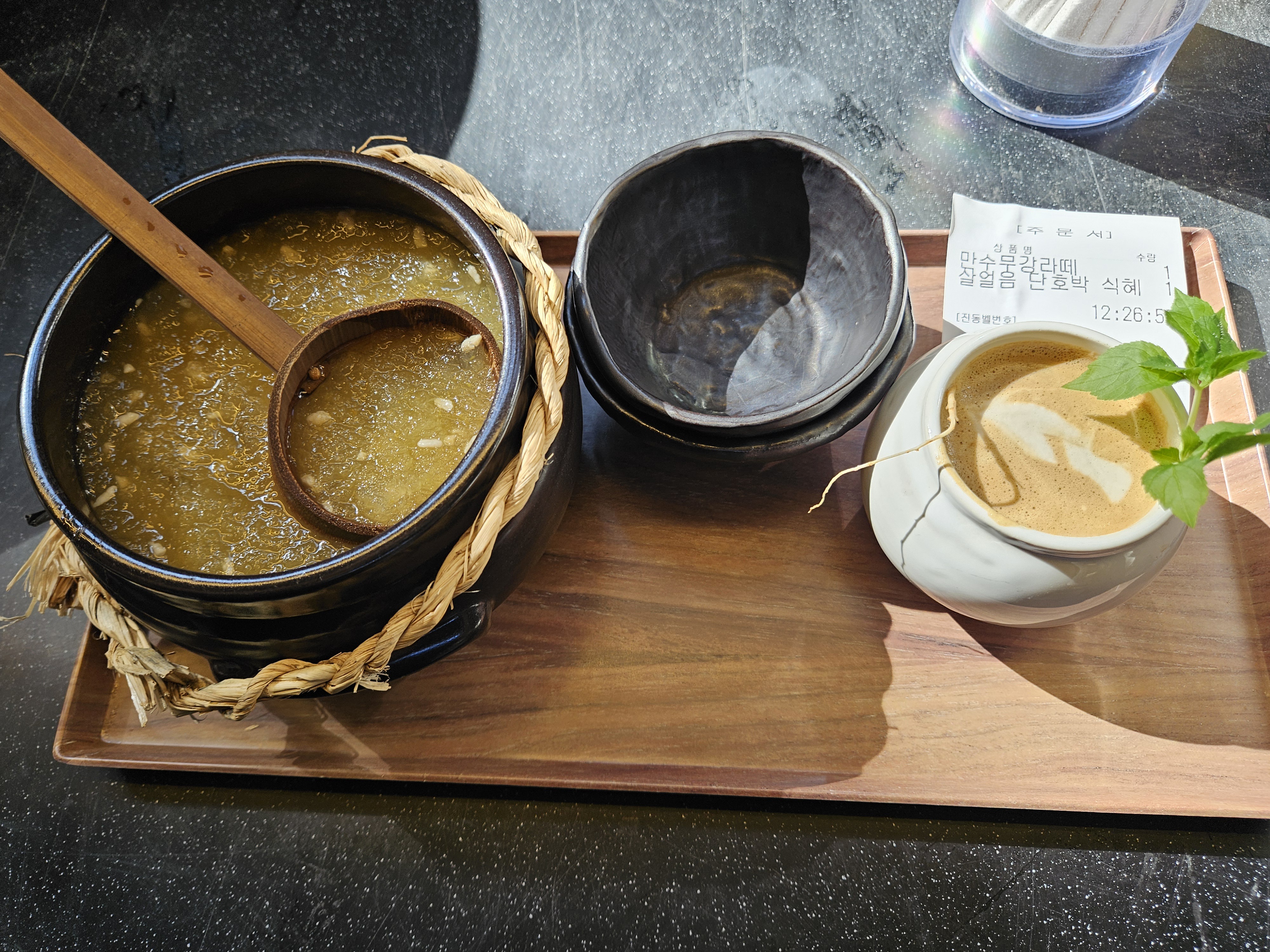 막걸리 담겨있을 것 같은 항아리 같은데 나무 국자랑 같이 내어주니 더 느낌 있네.