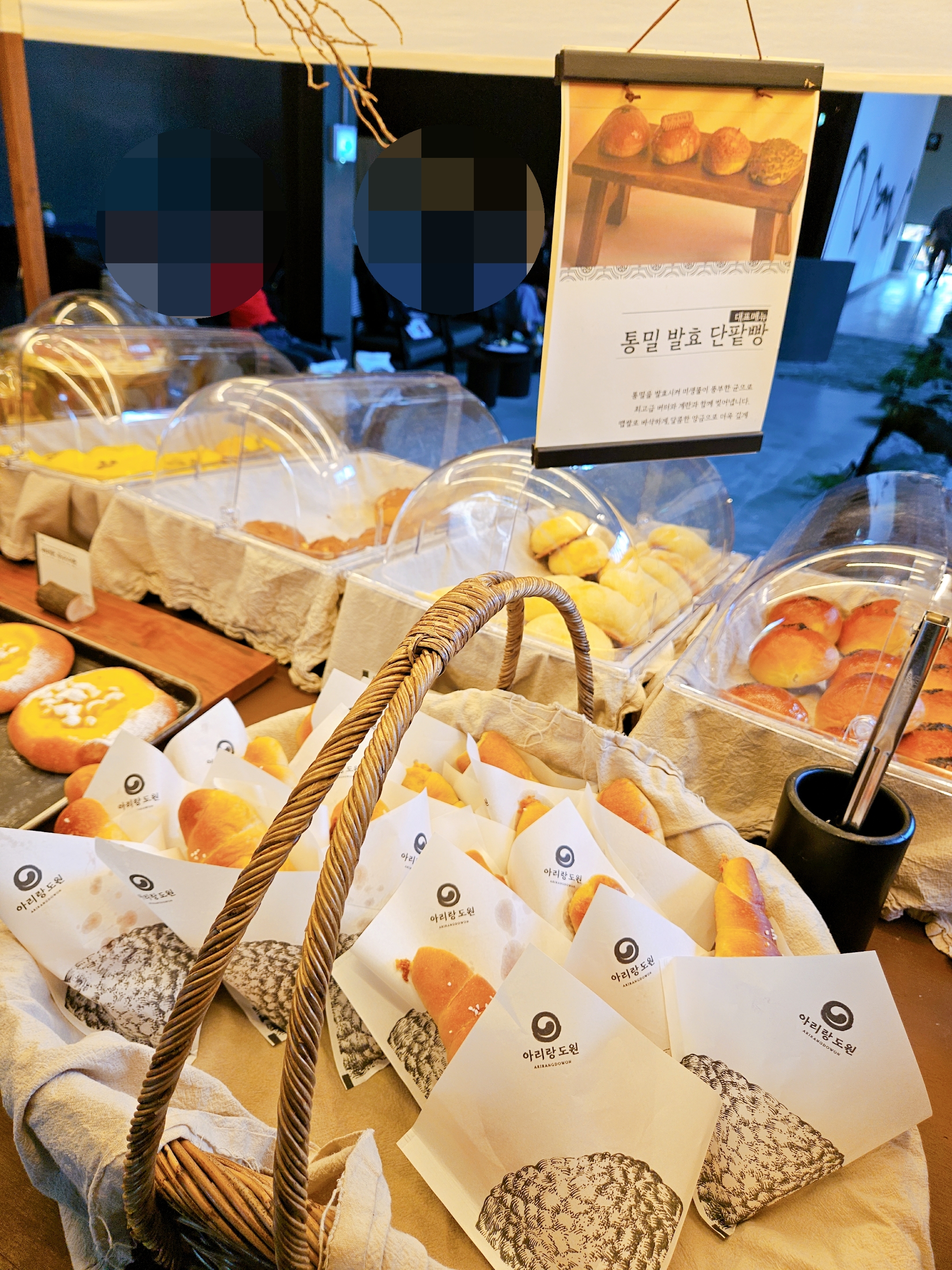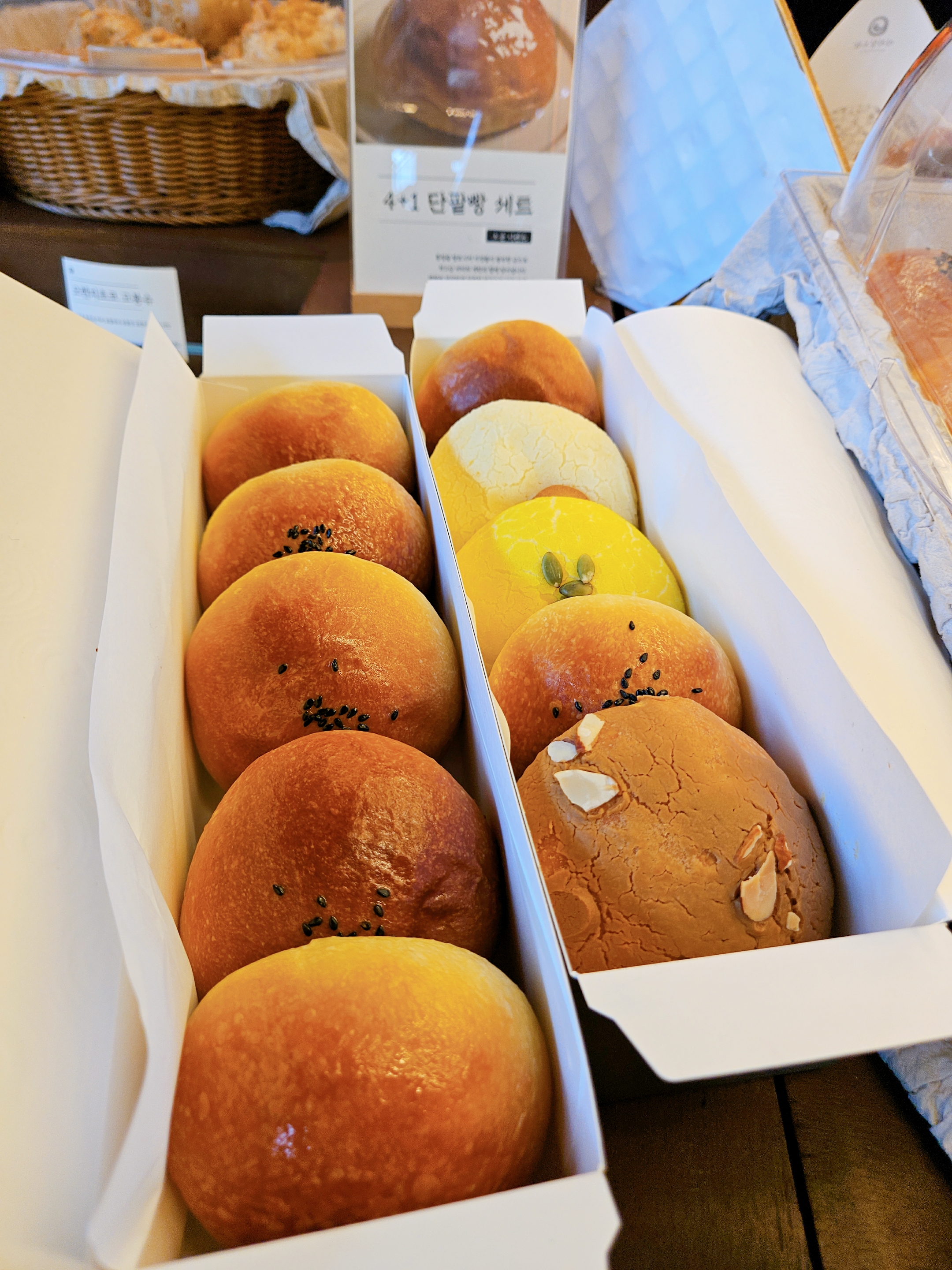 대표메뉴로 통밀발효 단팥빵은 최고급 버터와 계란, 맵쌀을 이용해서 만든다고 한다 오픈 이벤트가 아직도 진행 중이었던 거 같은데 4+1 단팥빵세트 구입 가능.