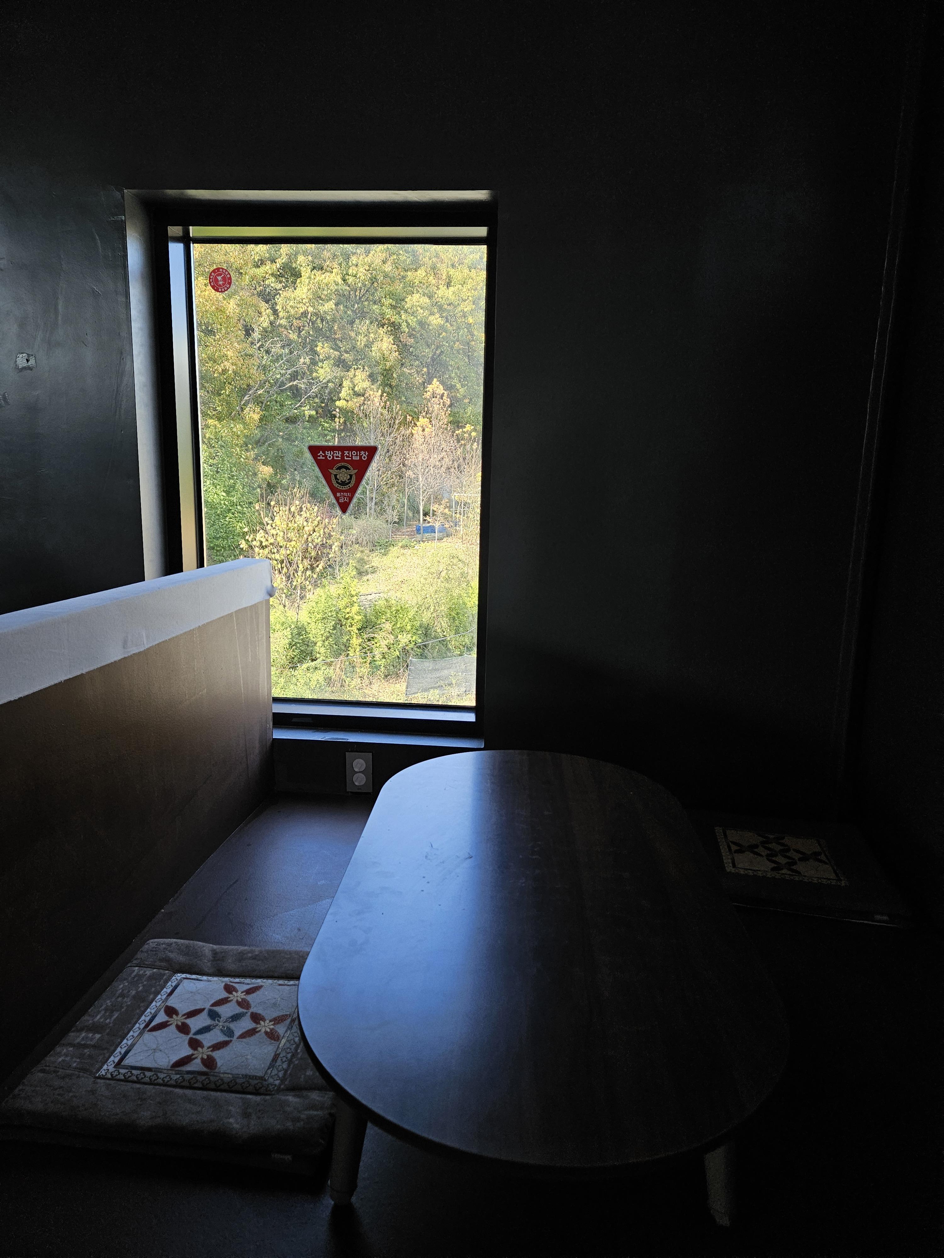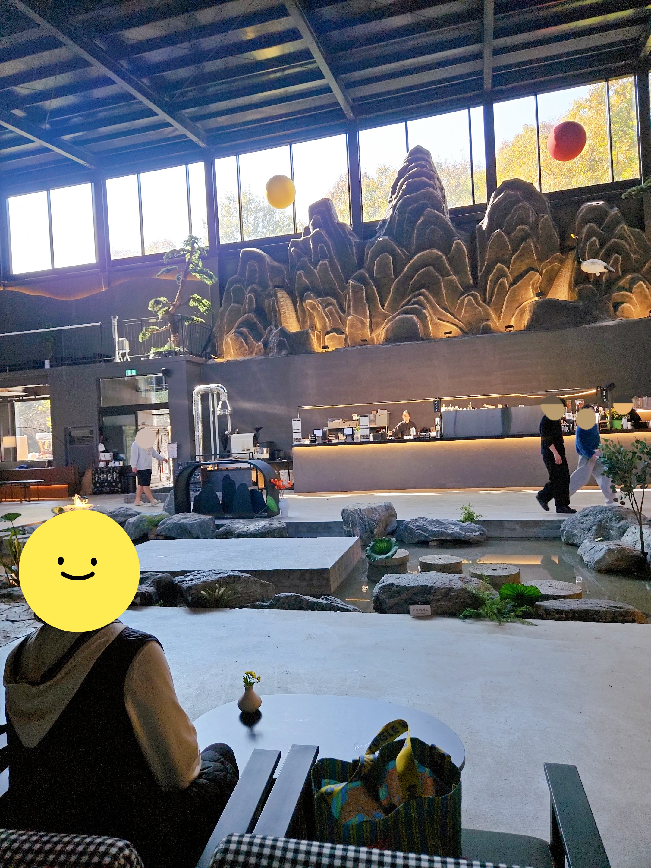 1층은 카운터 쪽 산, 해, 달 조형물을 볼 수 있는 2인석 자리가 있었는데 어디 자리할지 고민하다가 테이블은 좀 낮고 아담했지만 의자가 편해 보여서 이 자리로 찜했다.