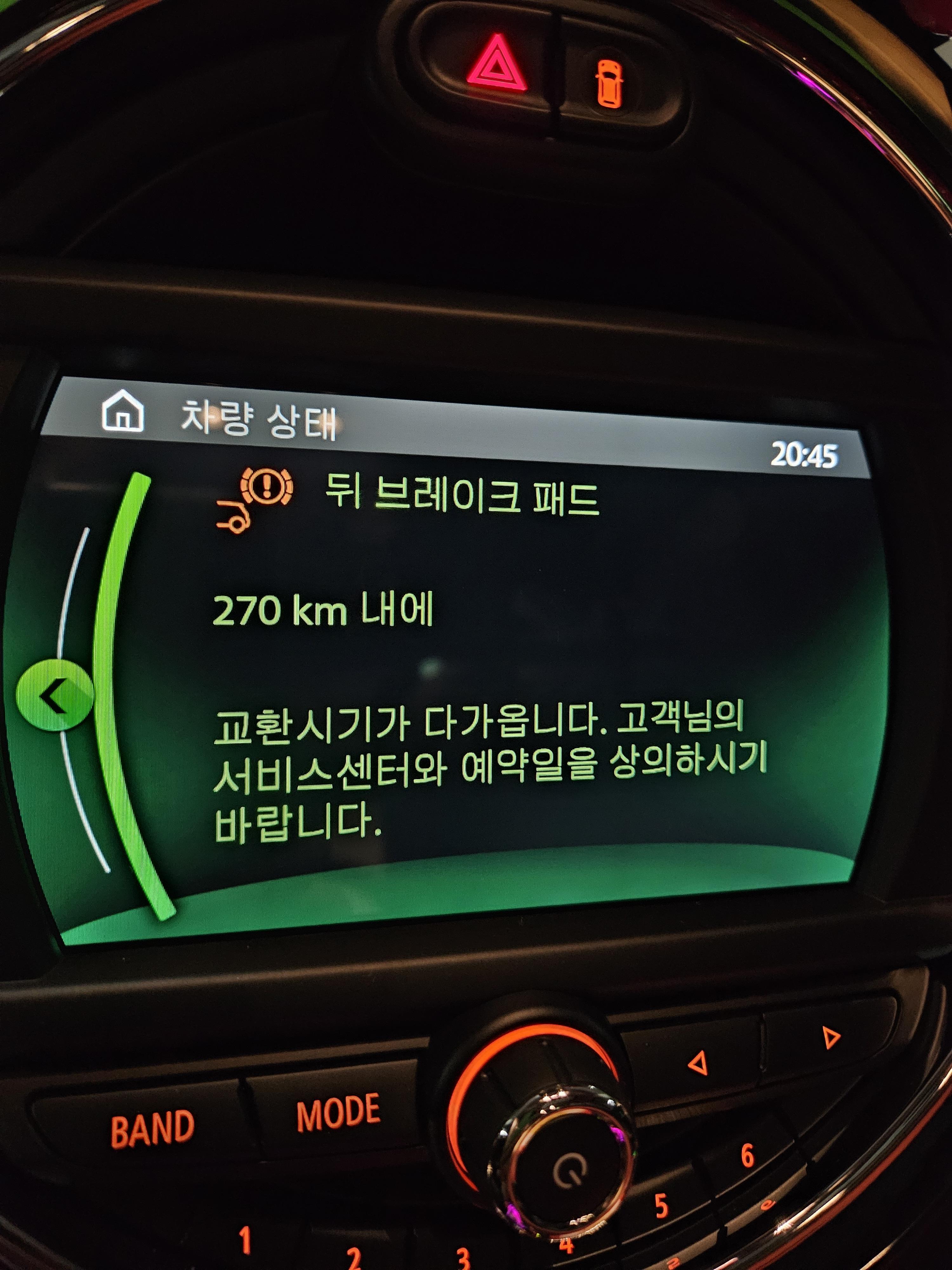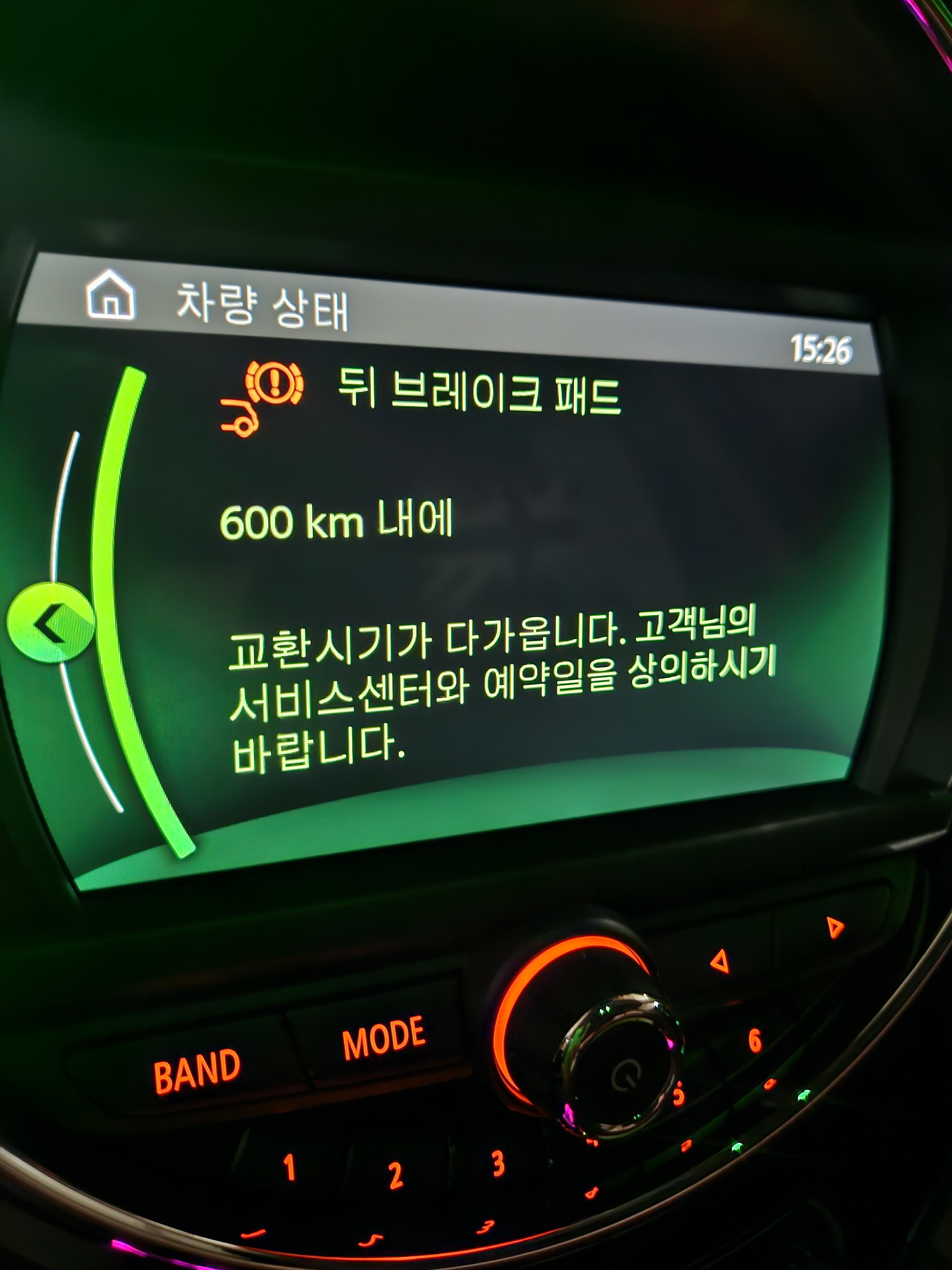 8월에 앞 브레이크 패드, 브레이크 오일, 엔진 오일 교체하고 3달 지나고 나니 며칠 전에 경고등이 떠서 보니까 뒤 브레이크 패크 교환 시기가 다가온다는 알림이었다.