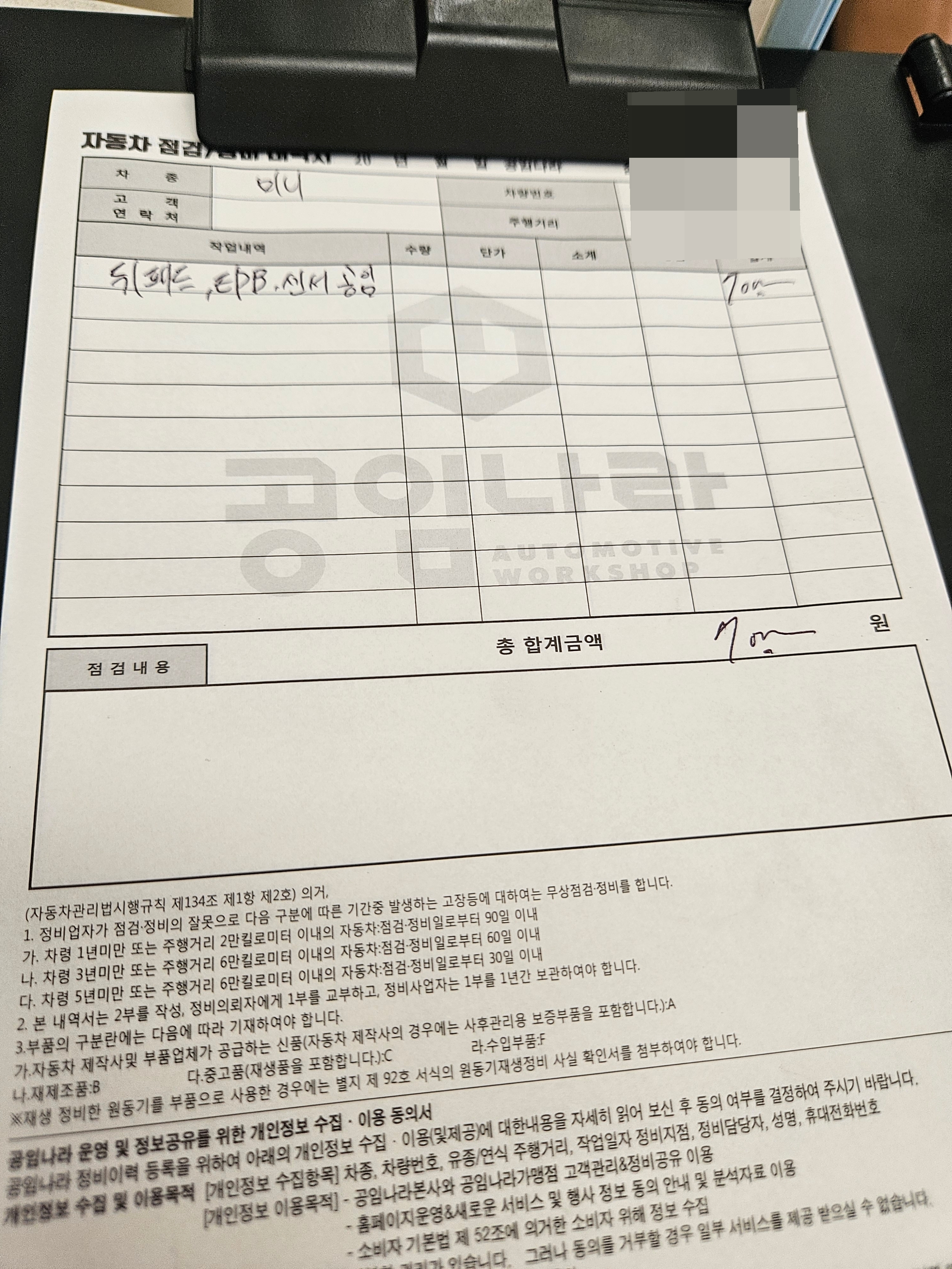 뒤패드 교환, EPB, 센서 공임 총합이 7만 원.