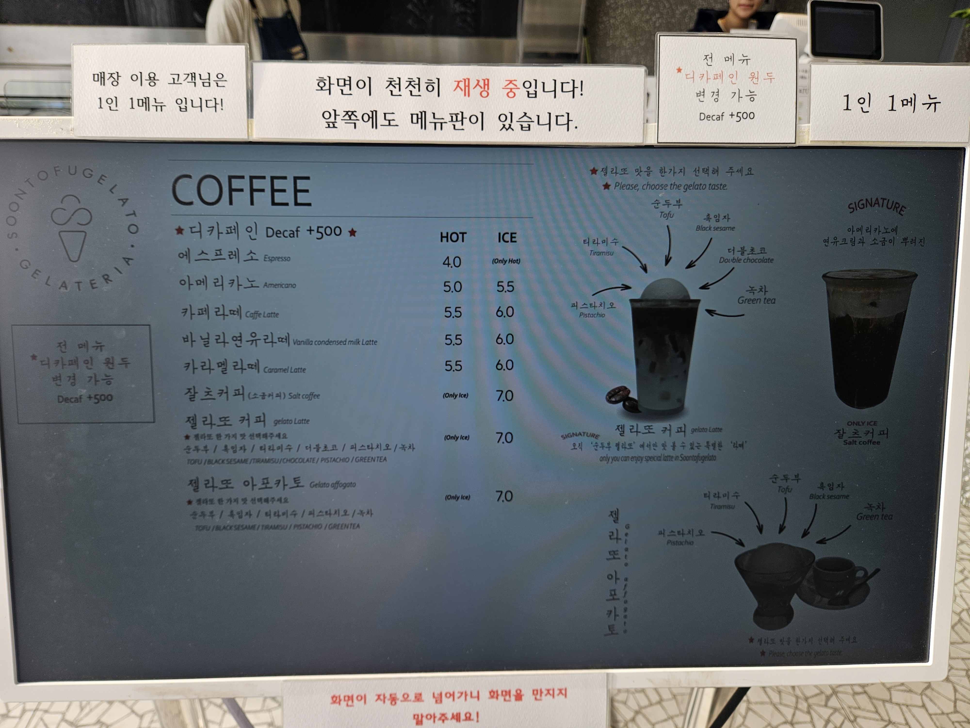 젤라또는 1컵당 1 스쿱씩이라 아쉬움. 맛을 2 ~ 3가지 선택 가능하면 혼자 가더라도 다양하게 먹을 수 있어 좋은데 1컵당 1 스쿱이라 나는 대부분 한라녹차로 주문하게 된다.