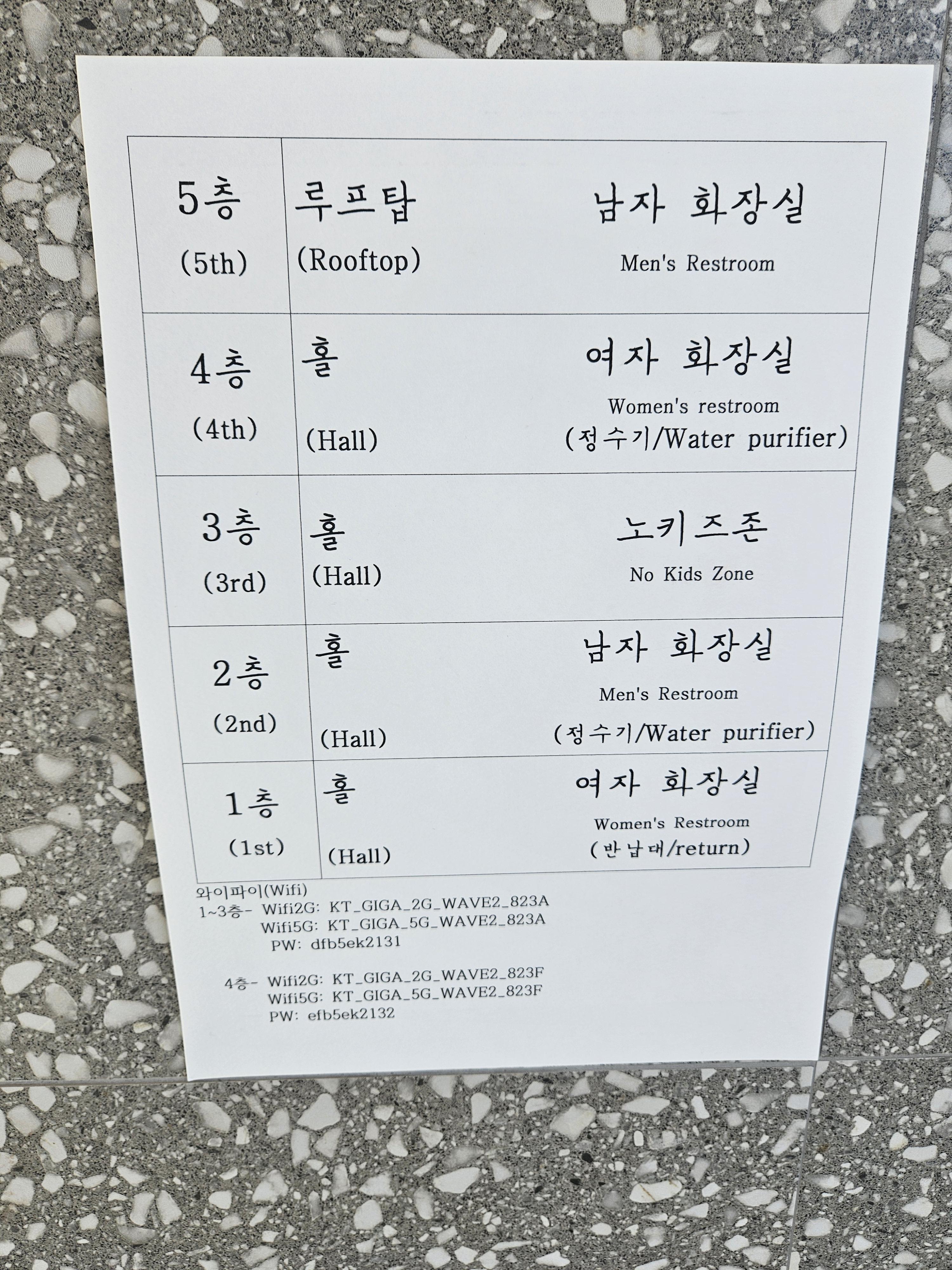 남녀 화장실을 층별로 구분되어 있는데 1,3 여자, 2,4 남자화장실이고 3층 홀은 노키즈 존이다.