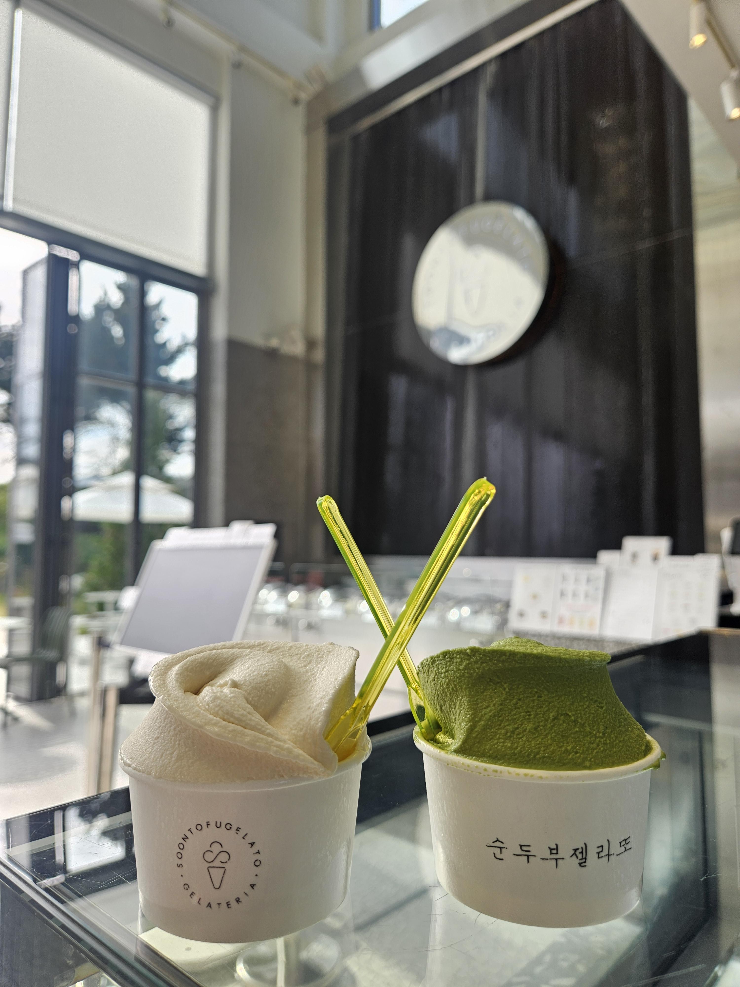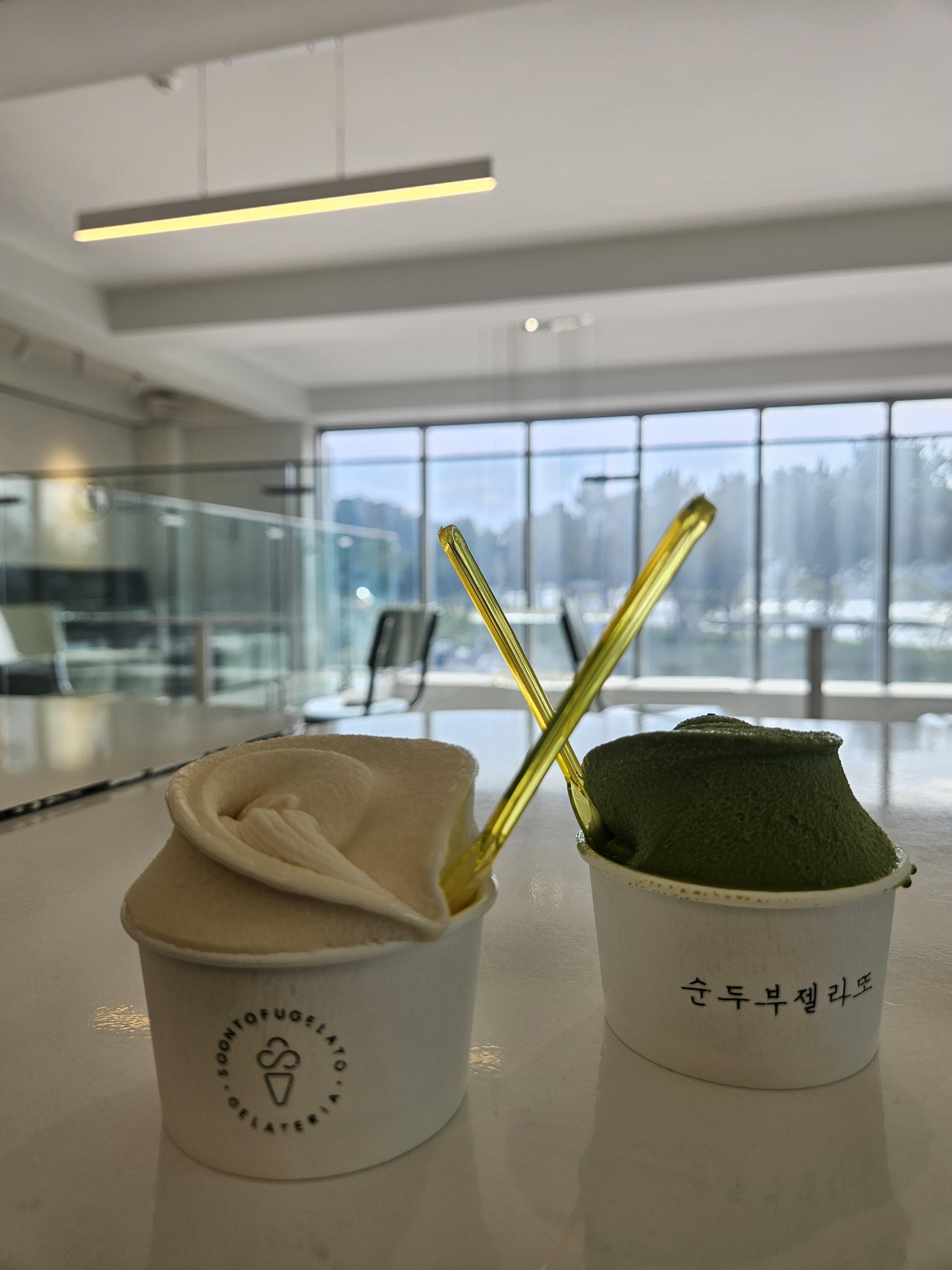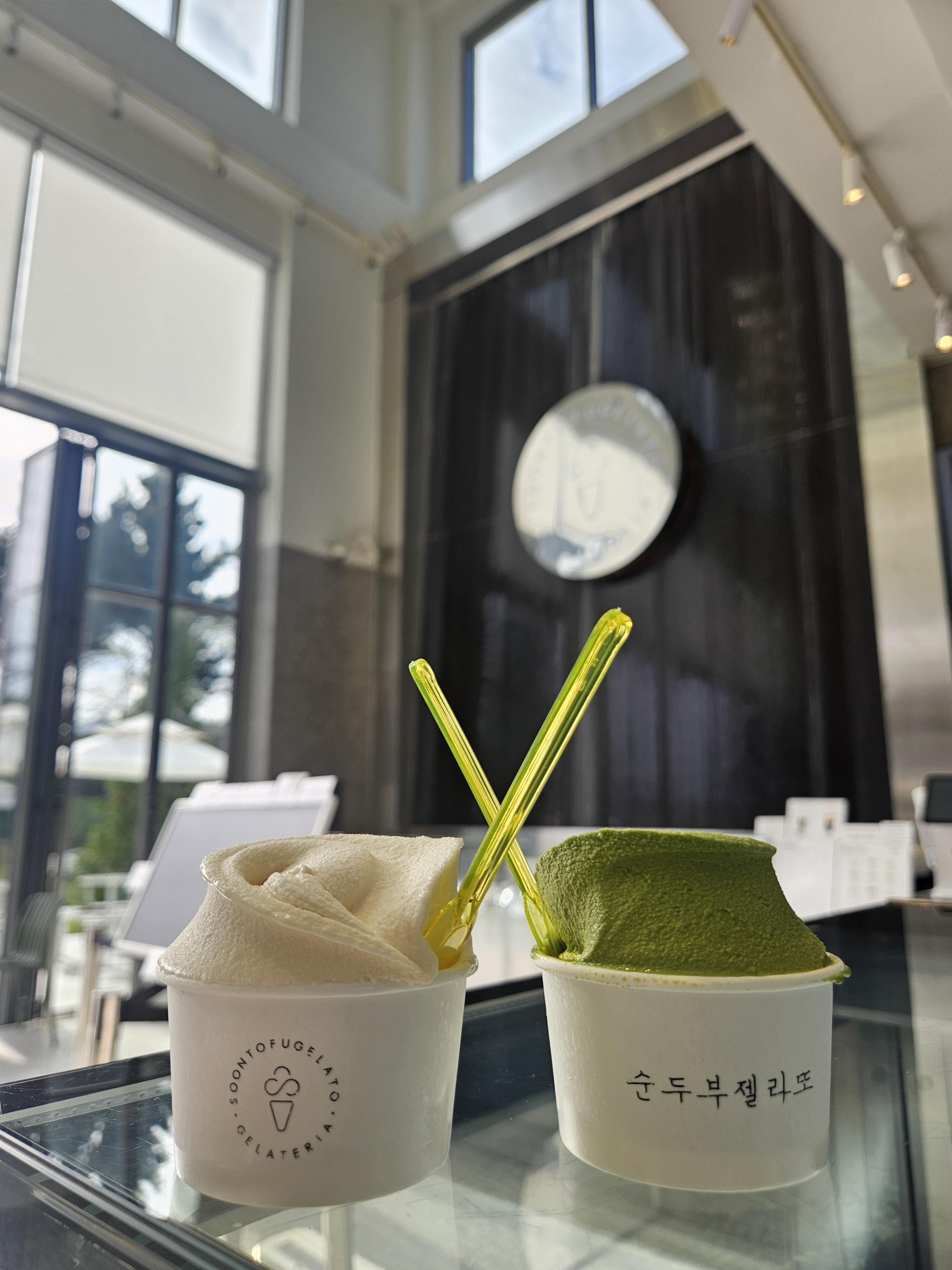 녹차맛이 진한 편은 아닌데도 녹차가 좋아서 고집하고 있는데 두유맛나는 기본 순두부젤라또도 고소하니 맛있다.