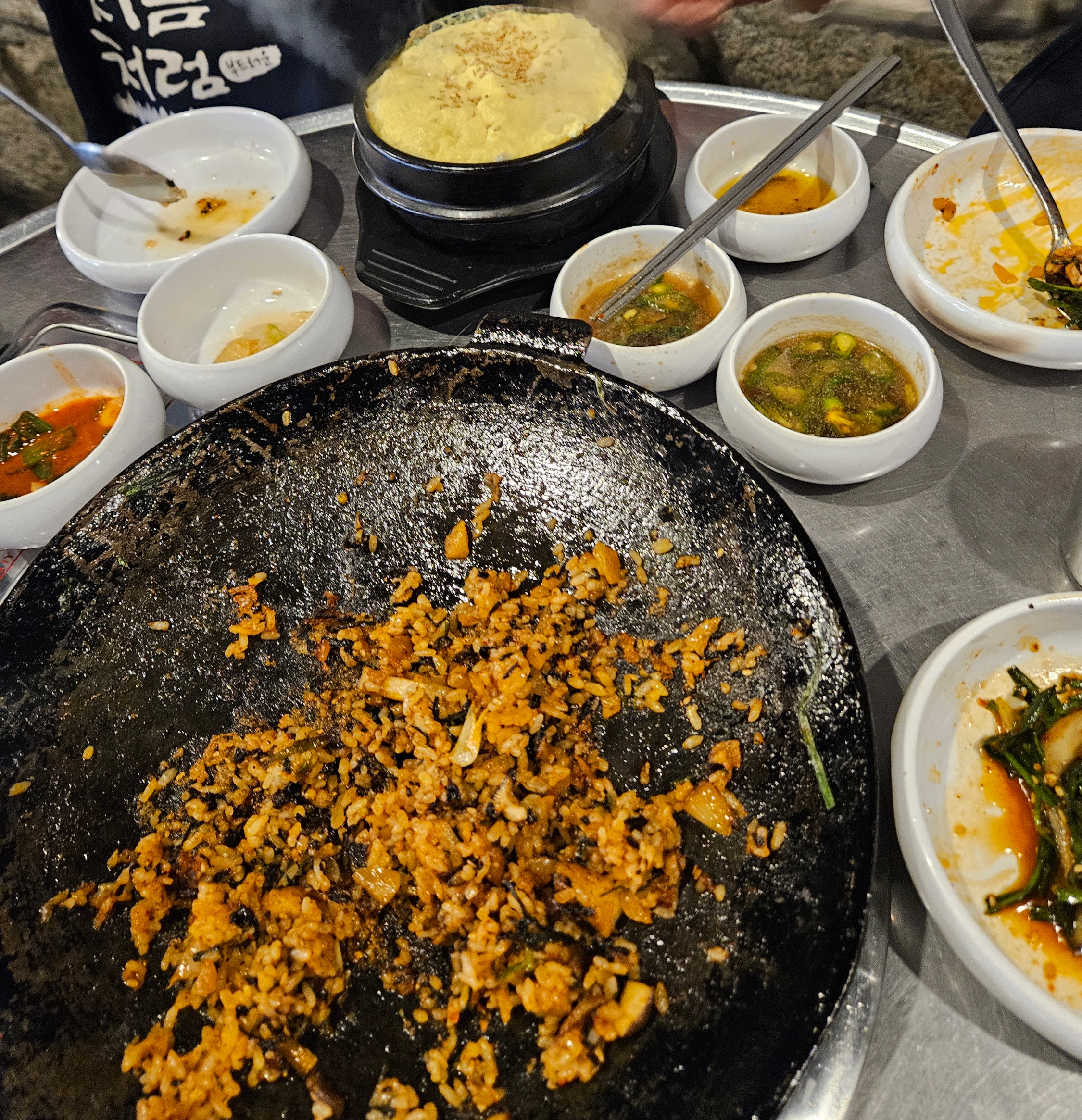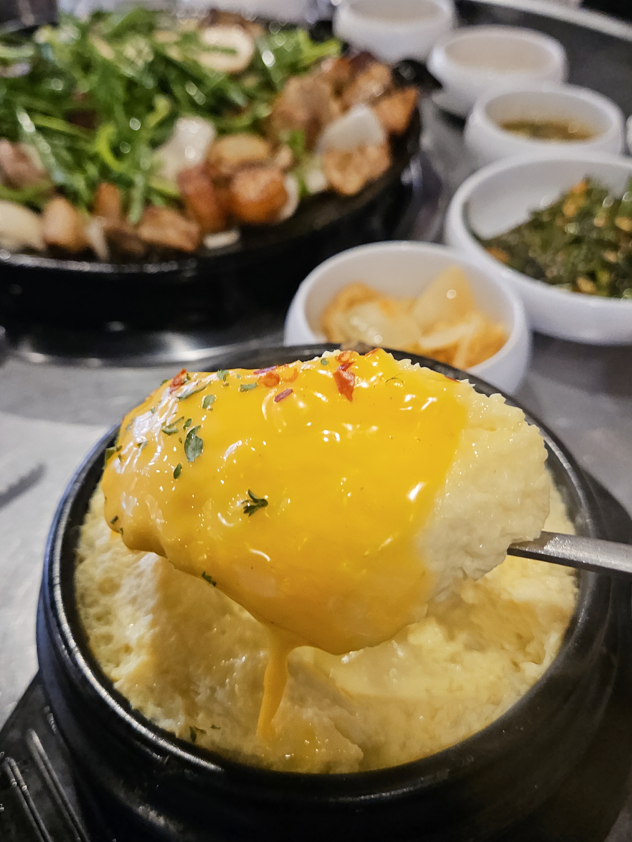 팬 달궈질 때쯤 치즈계란찜도 나왔는데 뚝배기에 보글보글 아주 맛있는 비주얼로 부드럽고 맛있더라.