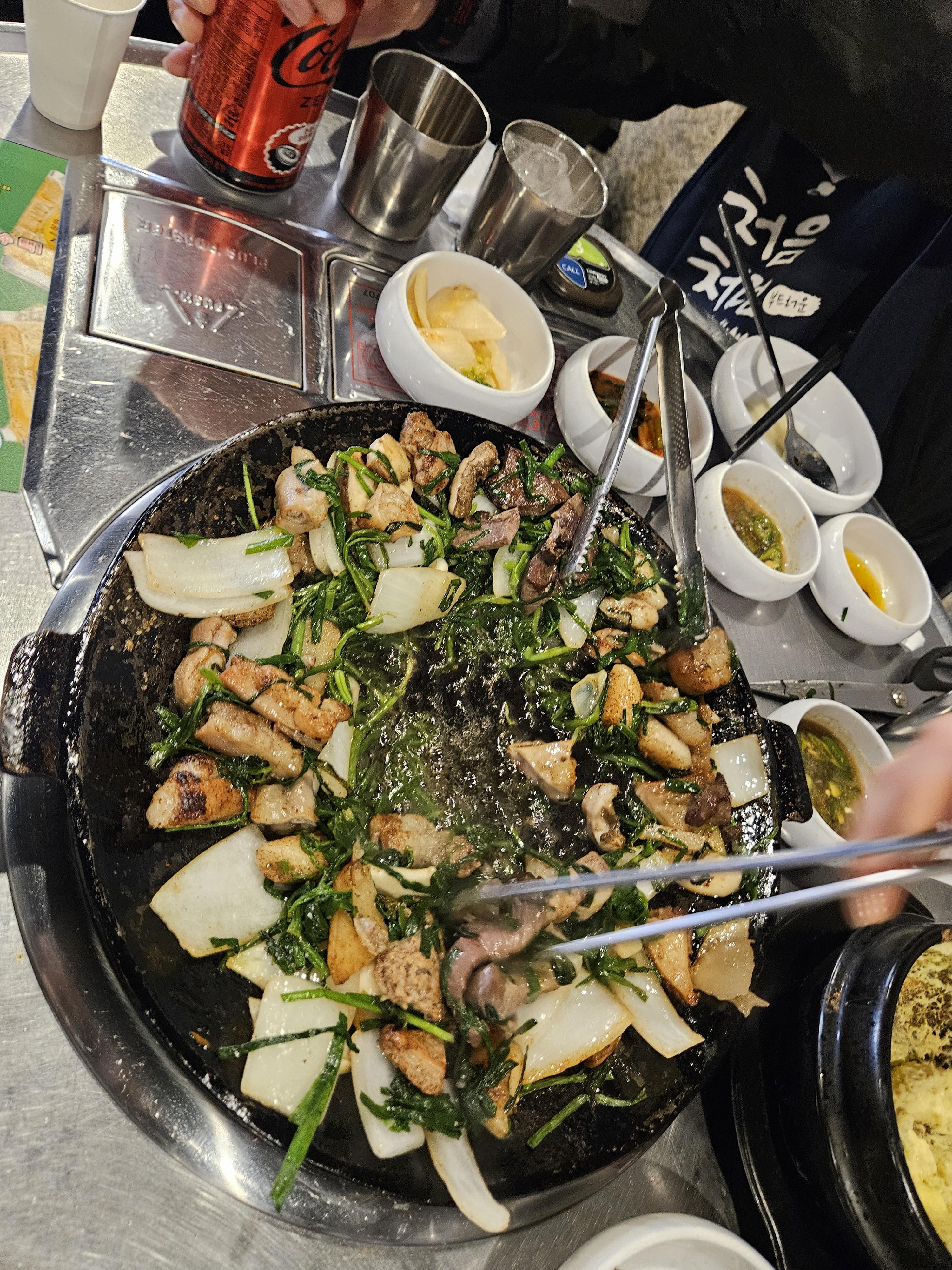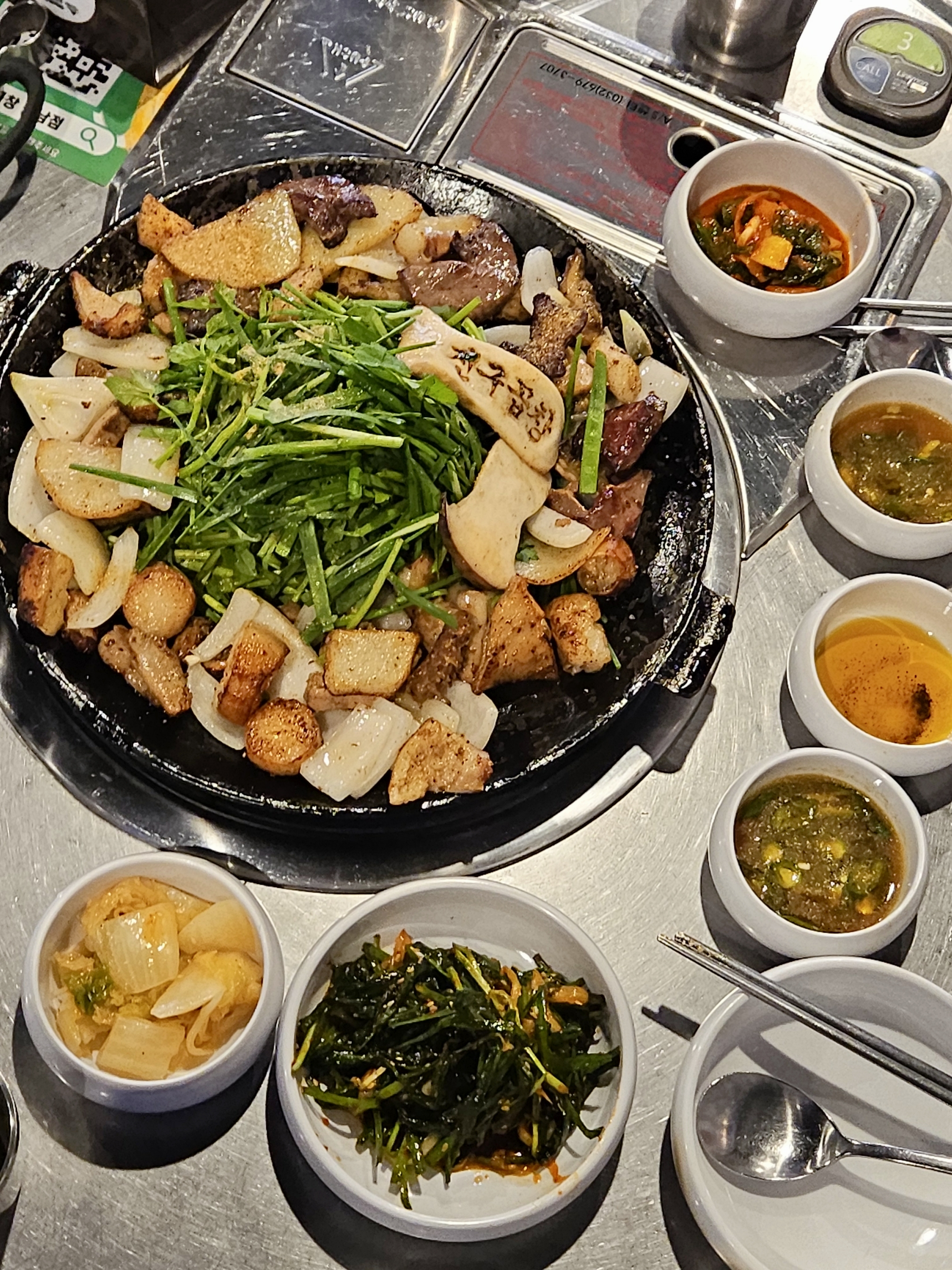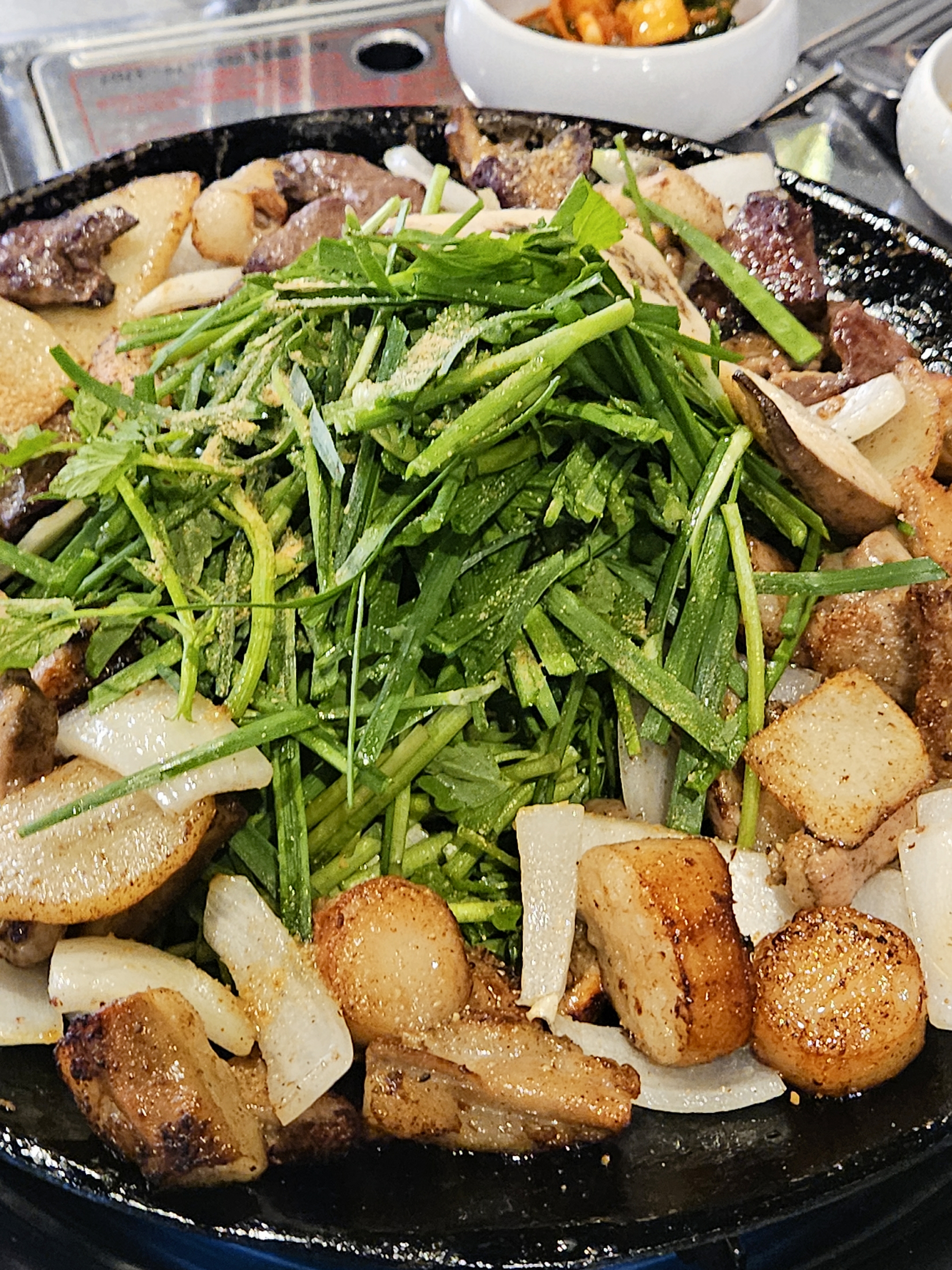 곱창모둠은 #곱창 #대창 #막창 #양 #염통 모두 제공되어 #감자 #양파 #미나리 가 수북하게 담겨 모두 익혀 나와서 팬만 달궈지고 바로 먹을 수 있어 좋더라.
