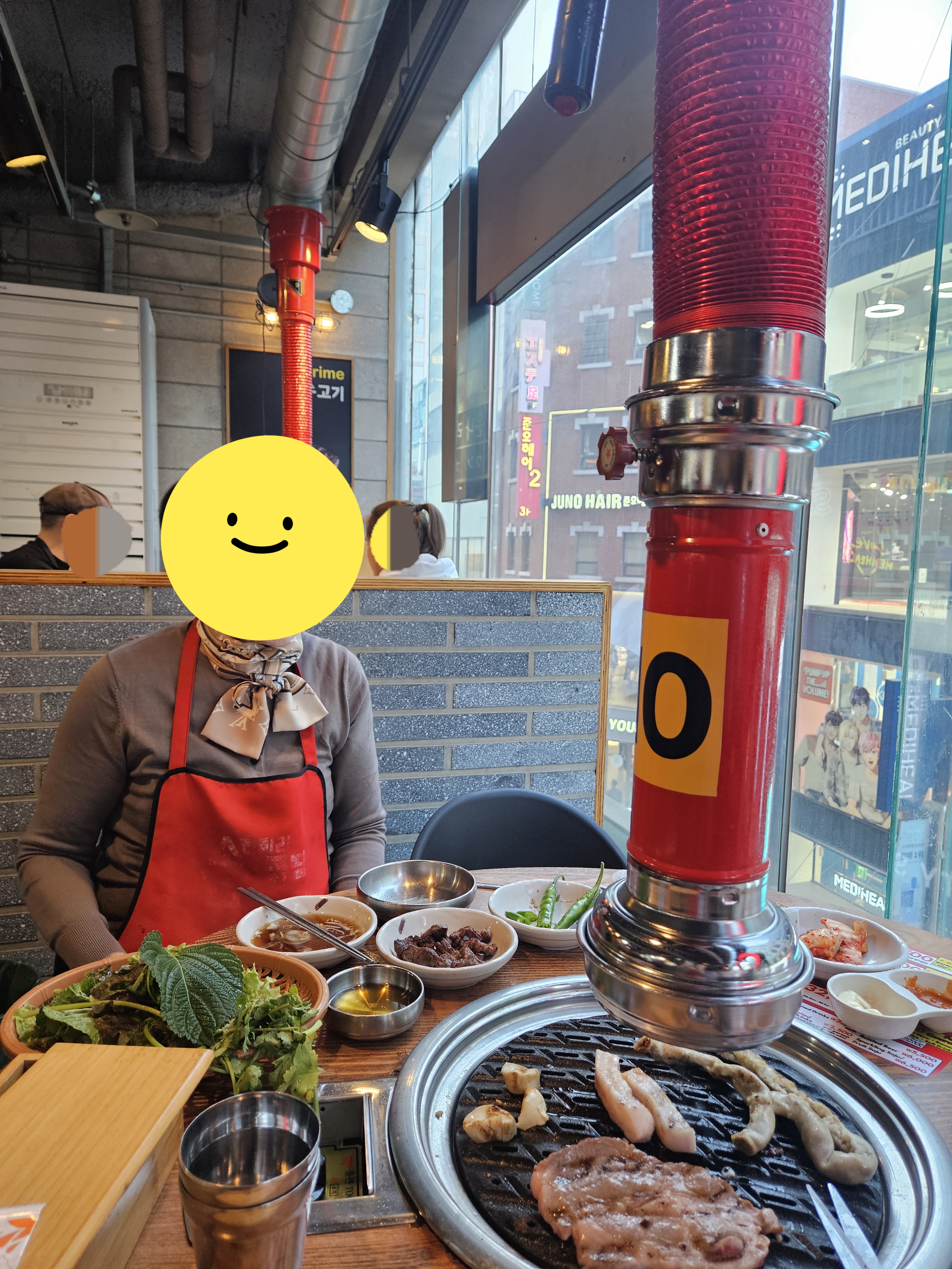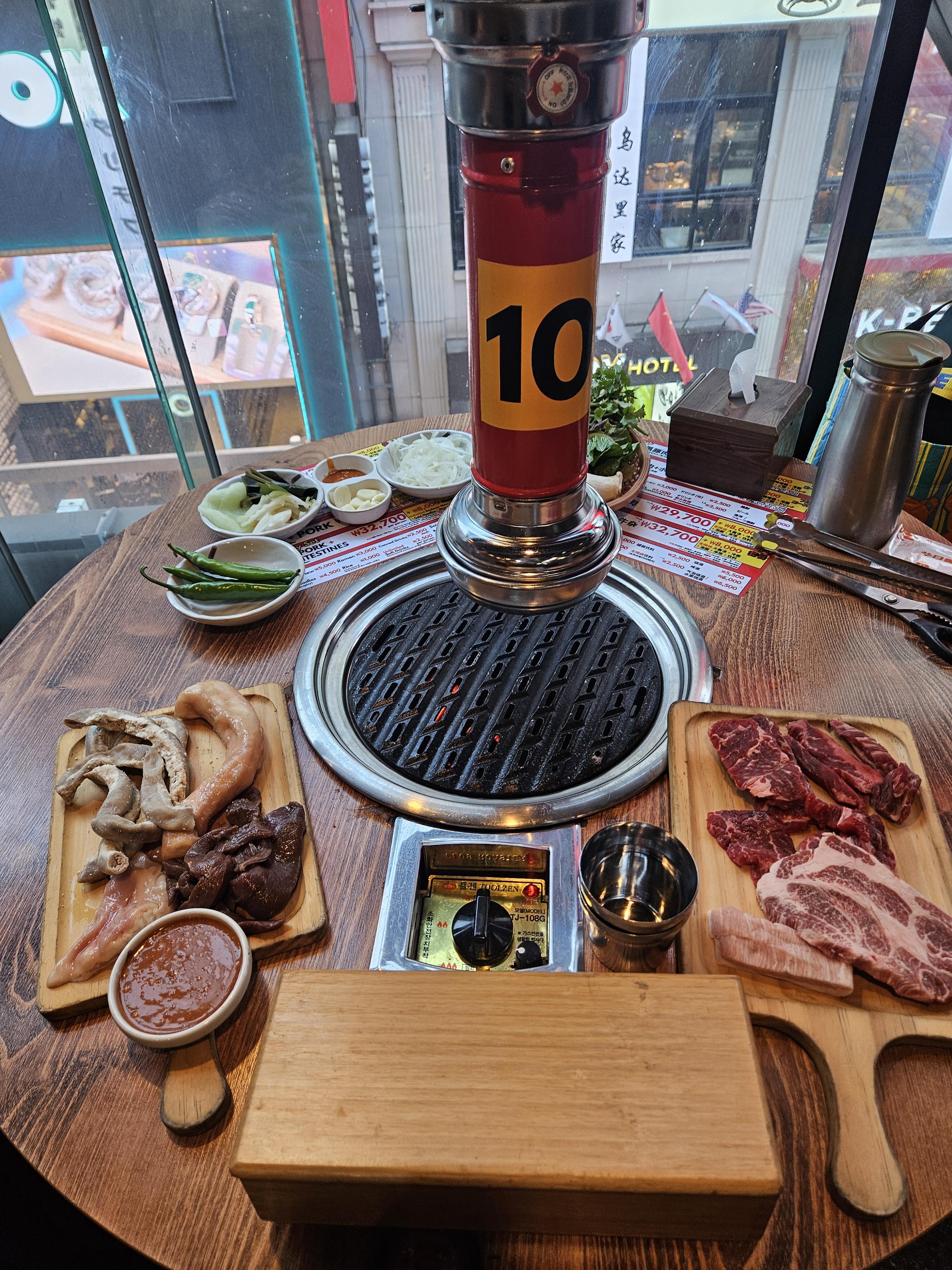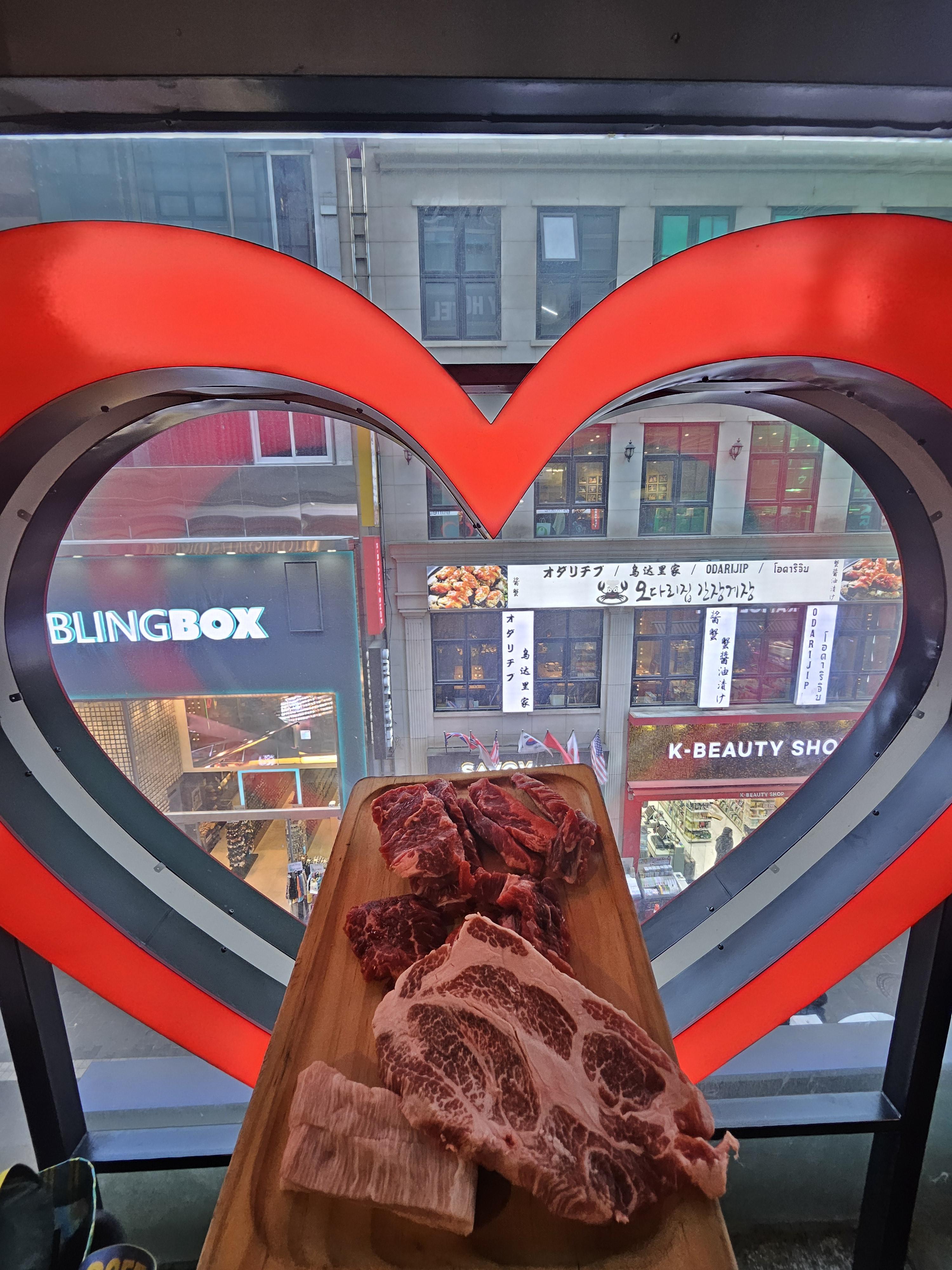 명동 중심에 있는 고기 뷔페인데 이용시간 2시간 동안 소고기, 돼지고기, 소내장과 모둠 채소, 셀프바를 무한리필로 이용할 수 있는 가성비 식당.