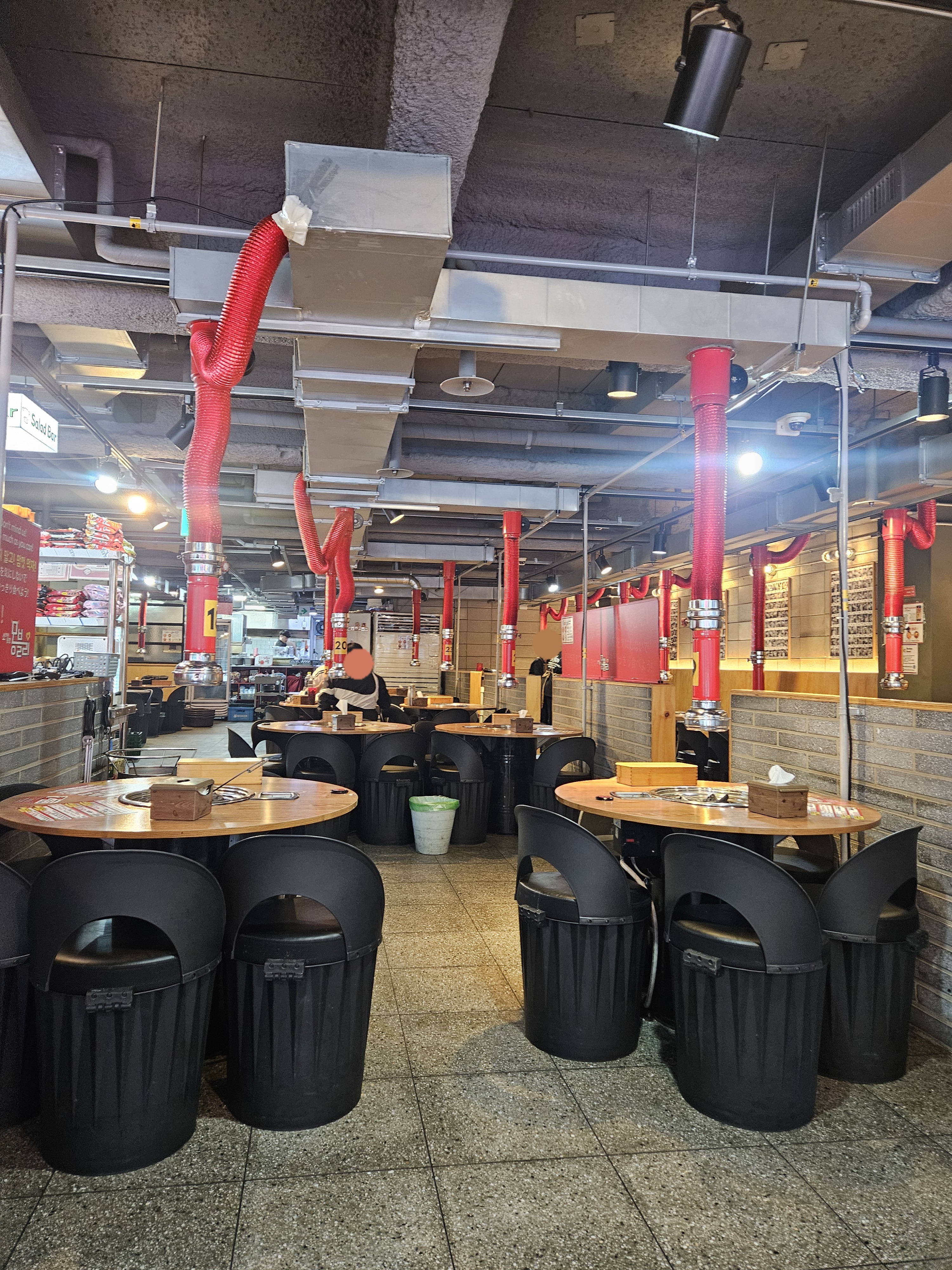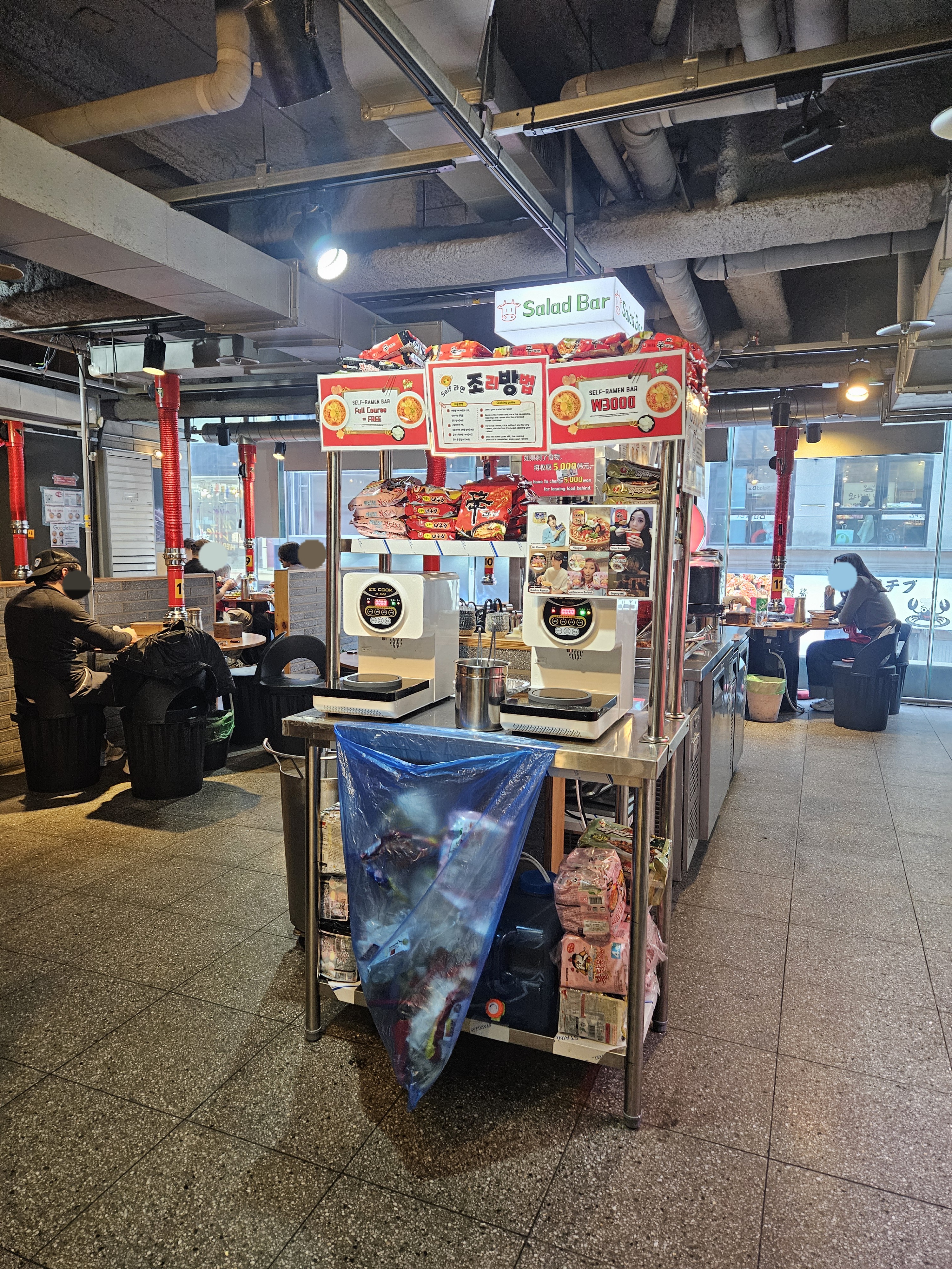 왼편은 주방, 오른쪽엔 창가 쪽에 테이블과 중앙에 셀프바가 마련되어 있는데 고기 냉장고와 샐러드 바, 라면도 셀프로 끓여 먹는 기계과 종류도 다양하게 준비되어 있었음.