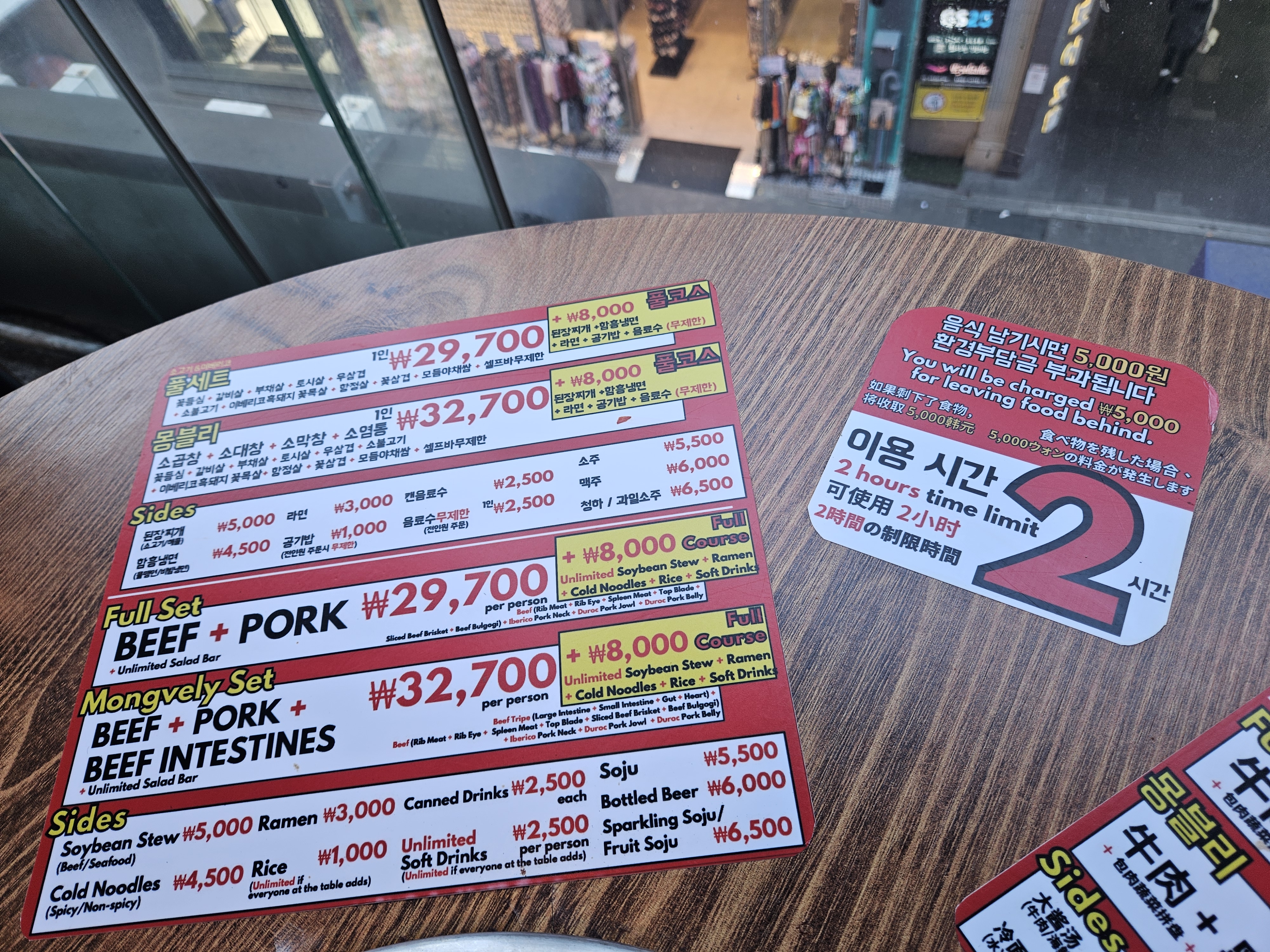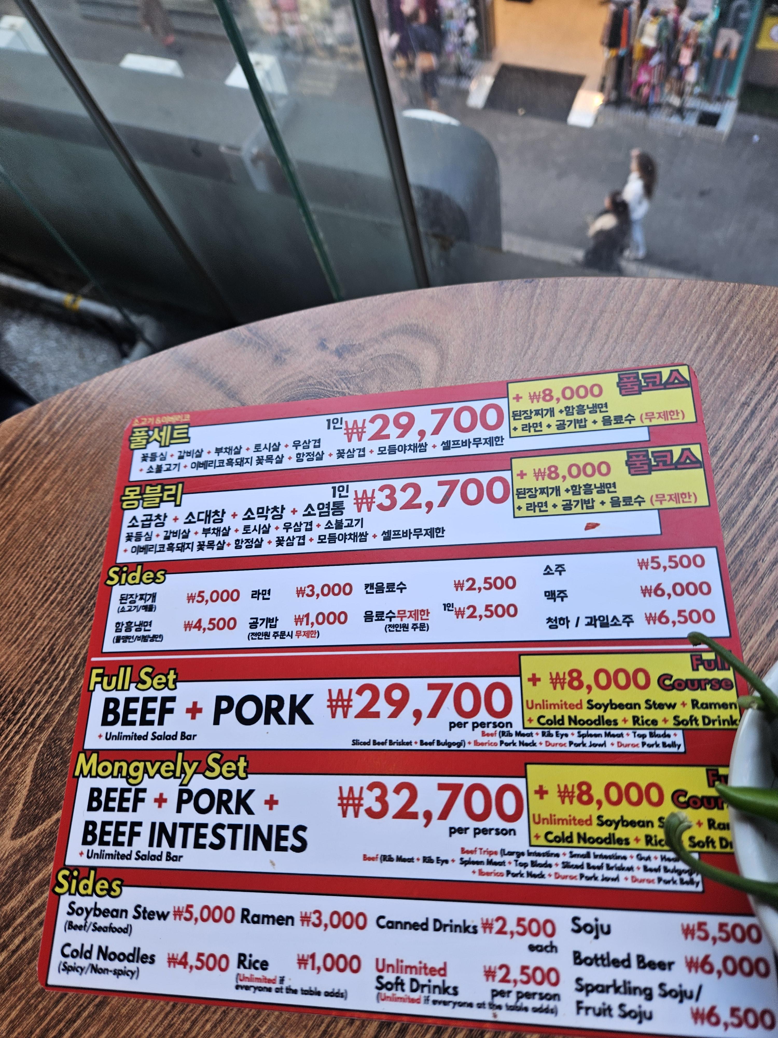 무한리필 메뉴는 1인 약 3만 원대의 풀세트와 소내장 추가로 즐길 수 있는 몽블리(3만 원 초반)가 있다. 이용시간은 2시간, 음식 남길 경우 환경부담금 5천 원 부과됨.