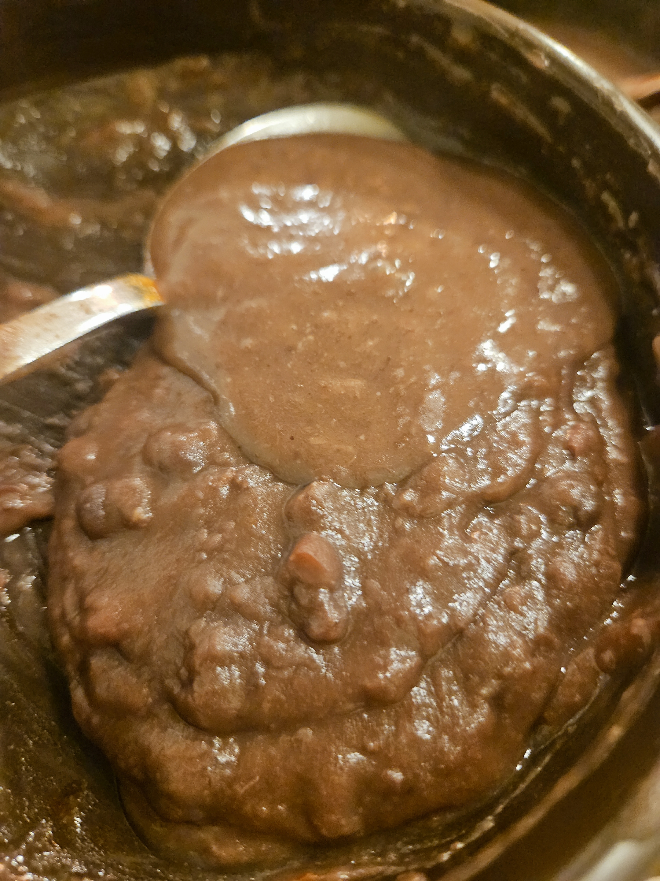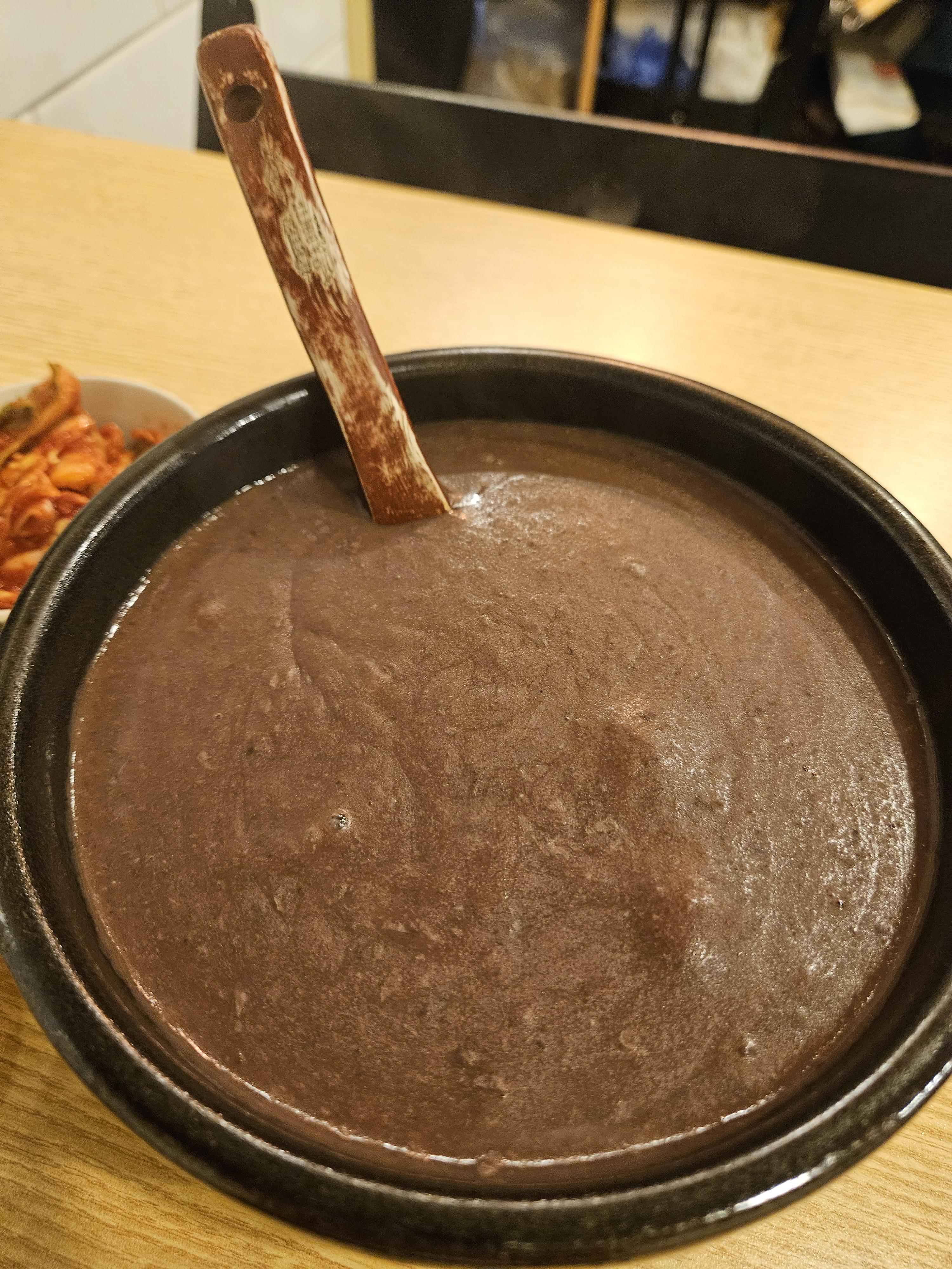 대형 뚝배기에 나온 새알 팥죽. 큼지막한 새알 듬뿍, 고운 팥죽 형태로. 팥알갱이가 없이 고운 스타일.