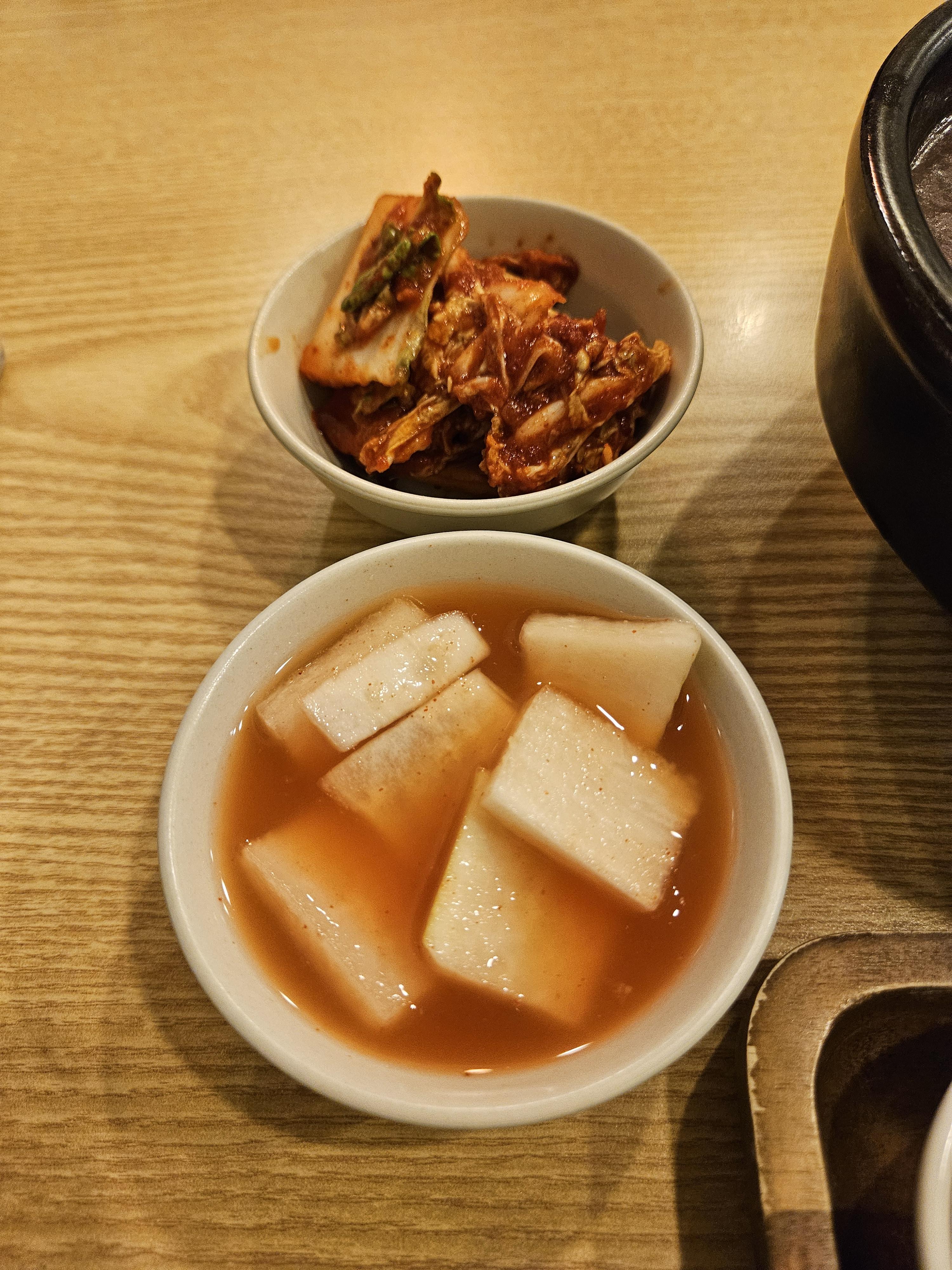 물김치랑 배추 겉절이 기본찬으로 주심. 테이블에 소금, 후추, 황설탕 비치되어 있어 팥죽이나 장칼국수 먹을 때 기호에 맞게 넣어 먹으면 된다.