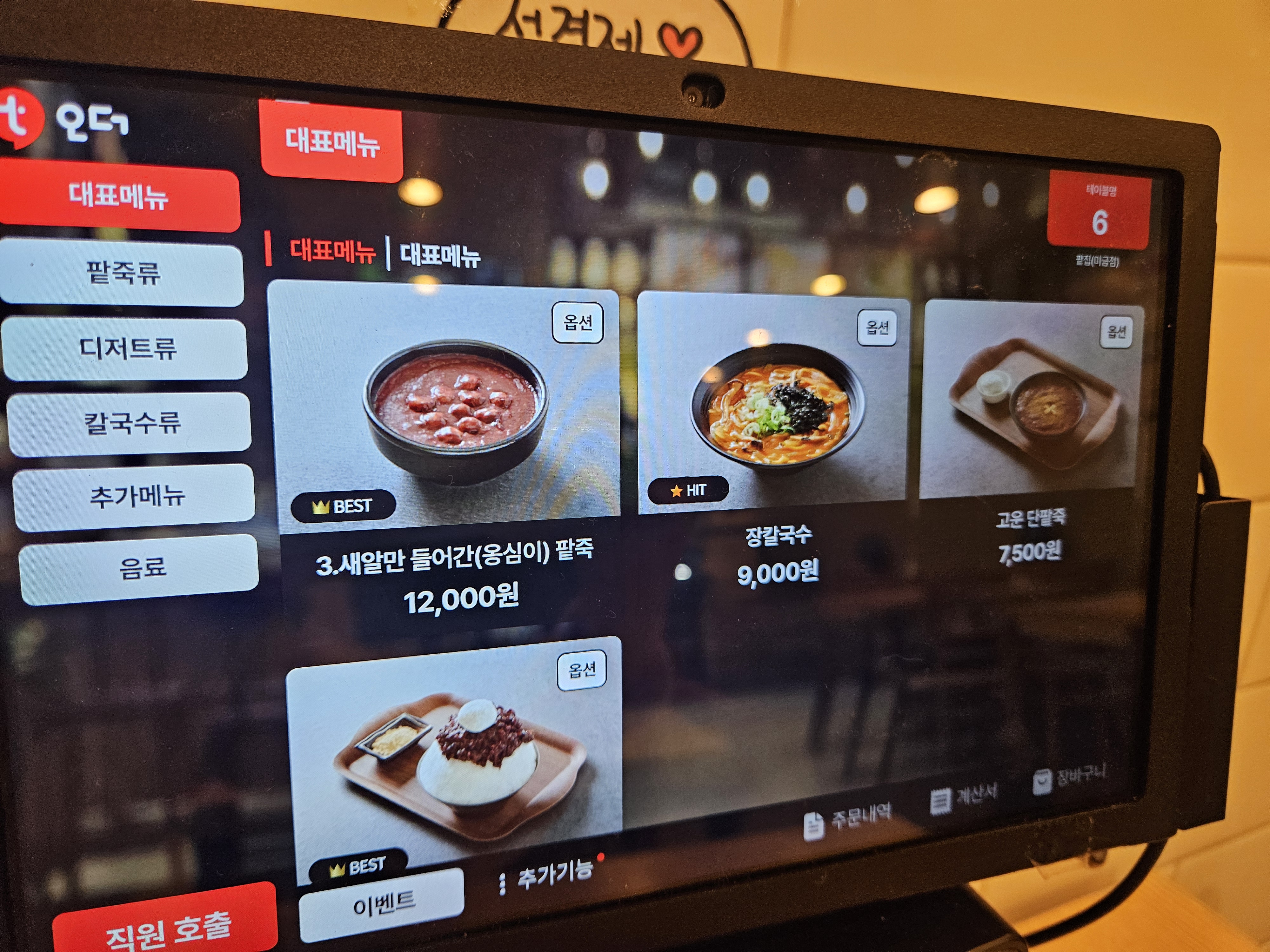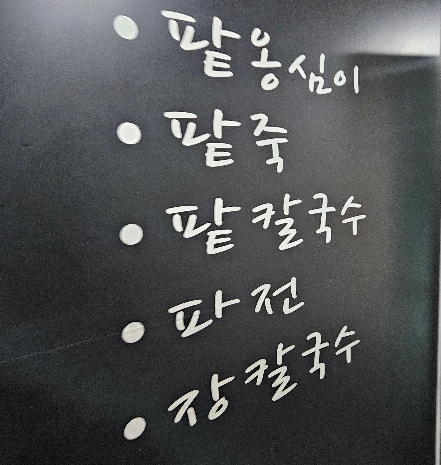 메뉴는 팥죽류 4가지, 국수류 3가지, 디저트류 3가지, 추가로 새알, 수제비, 공깃밥, 빙수팥, 찹쌀떡 가능하다.