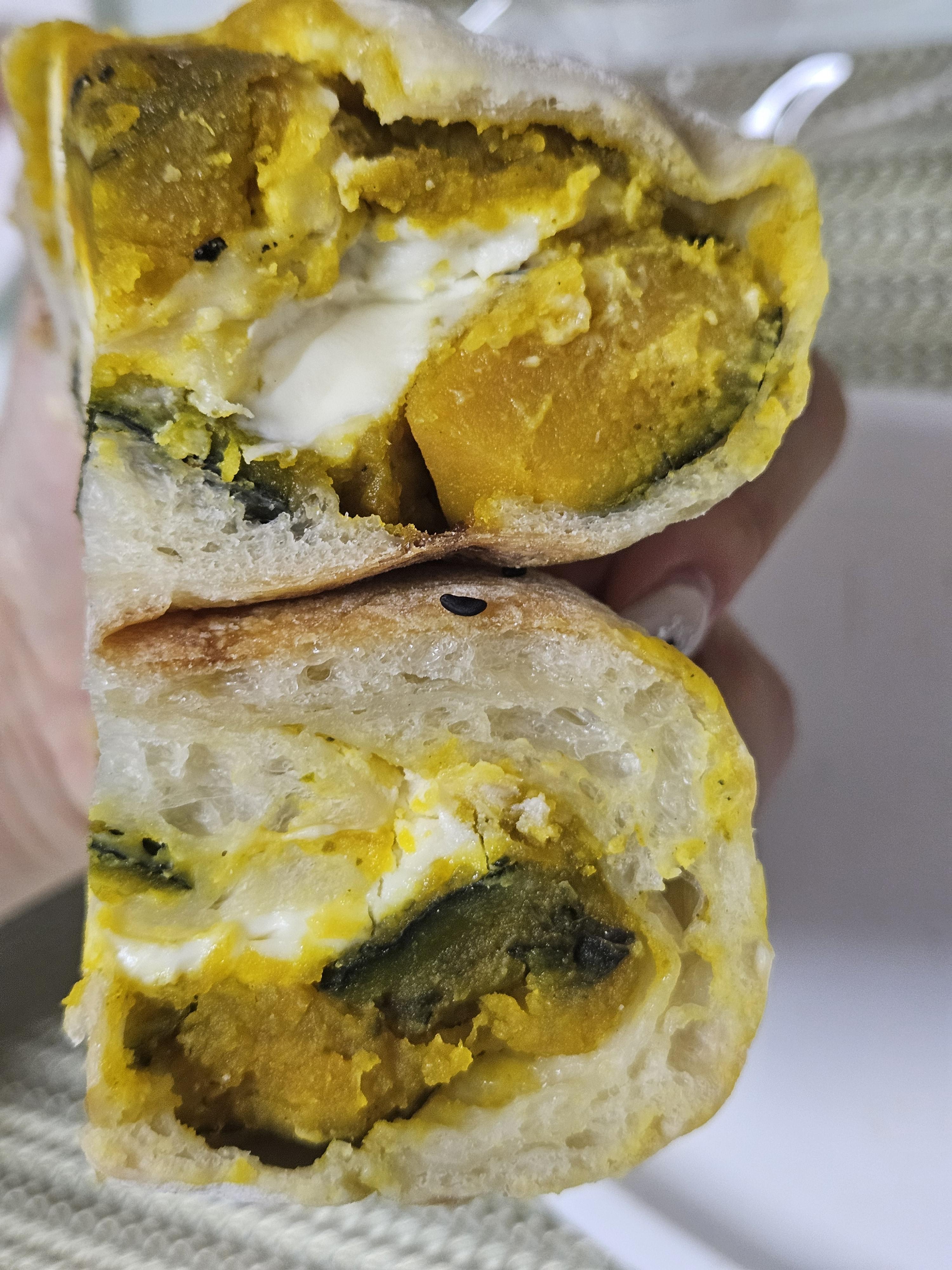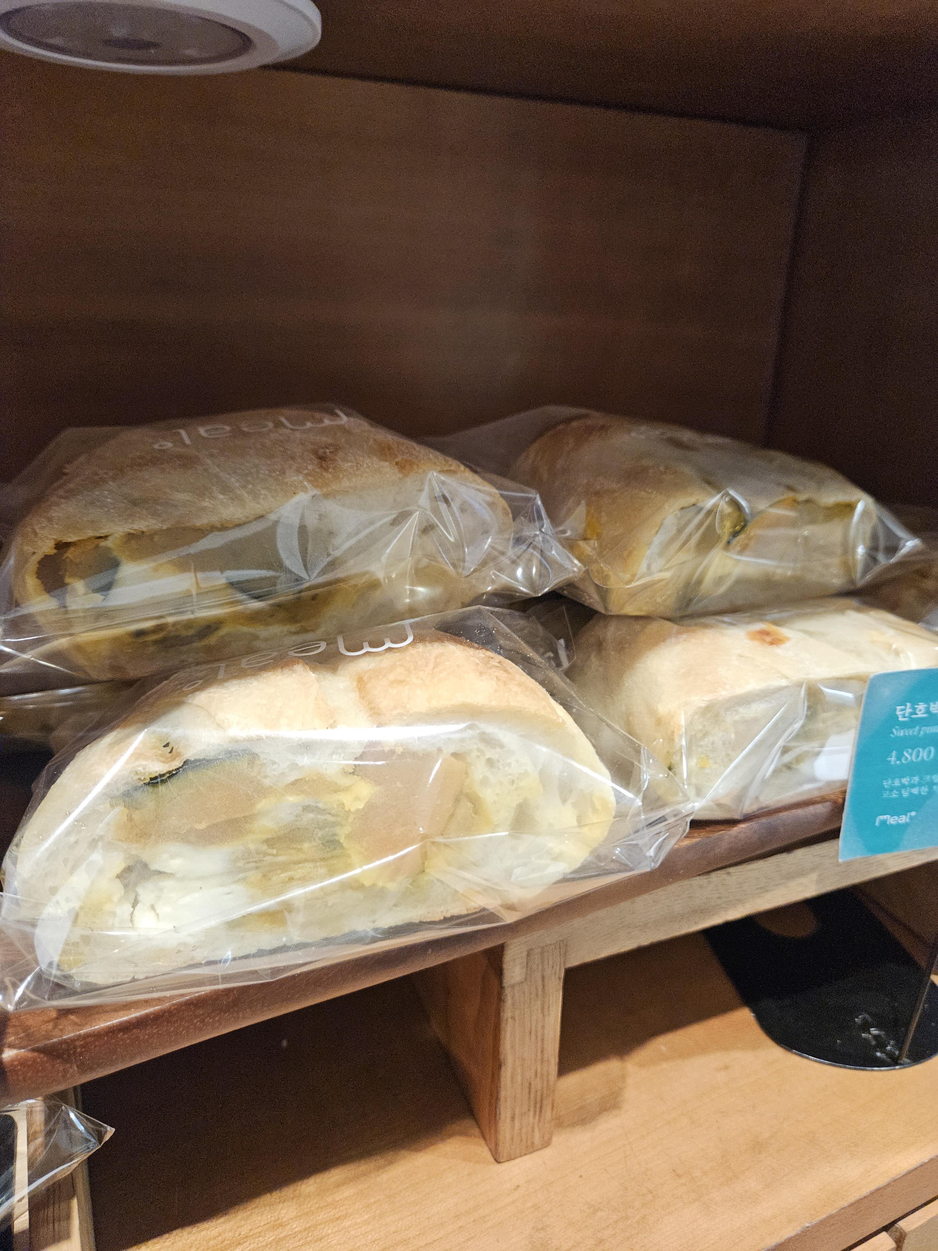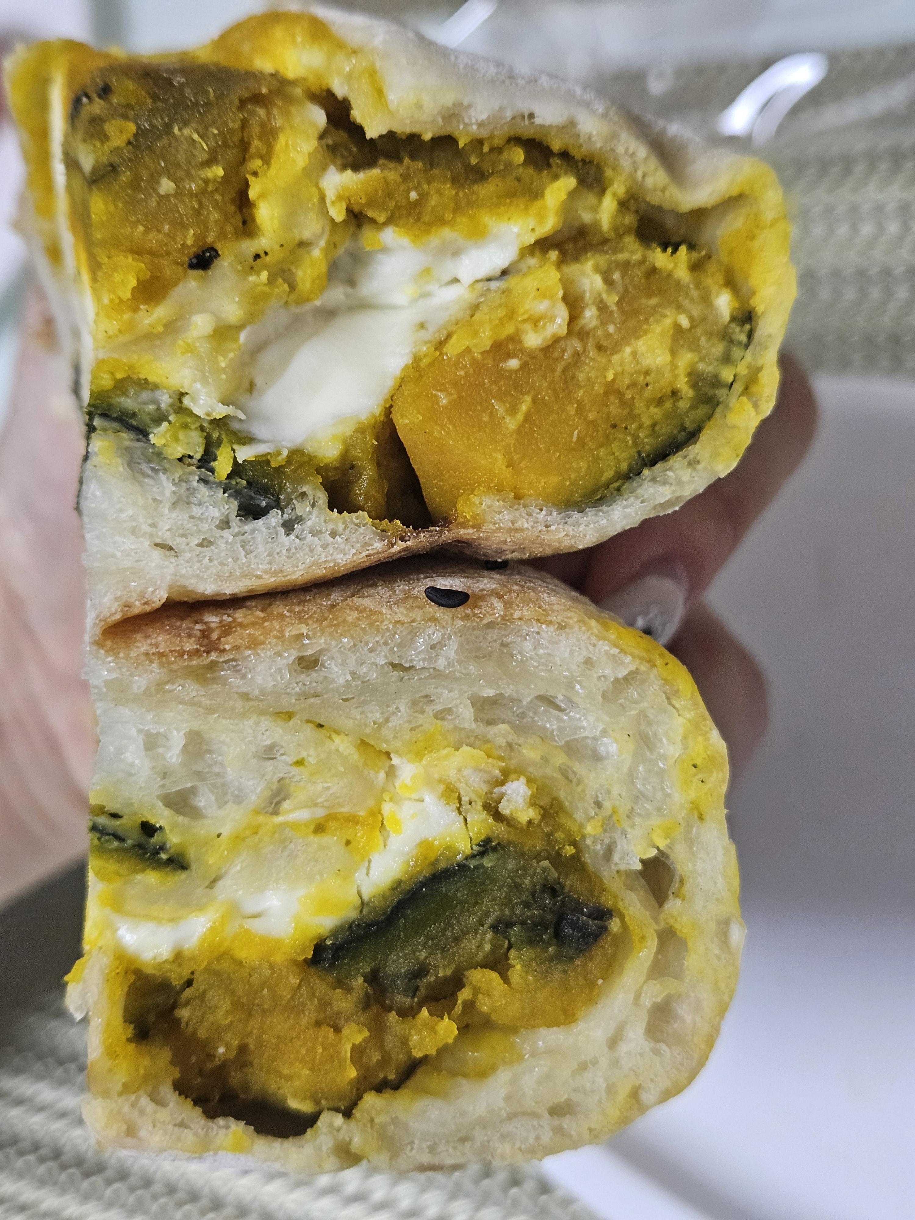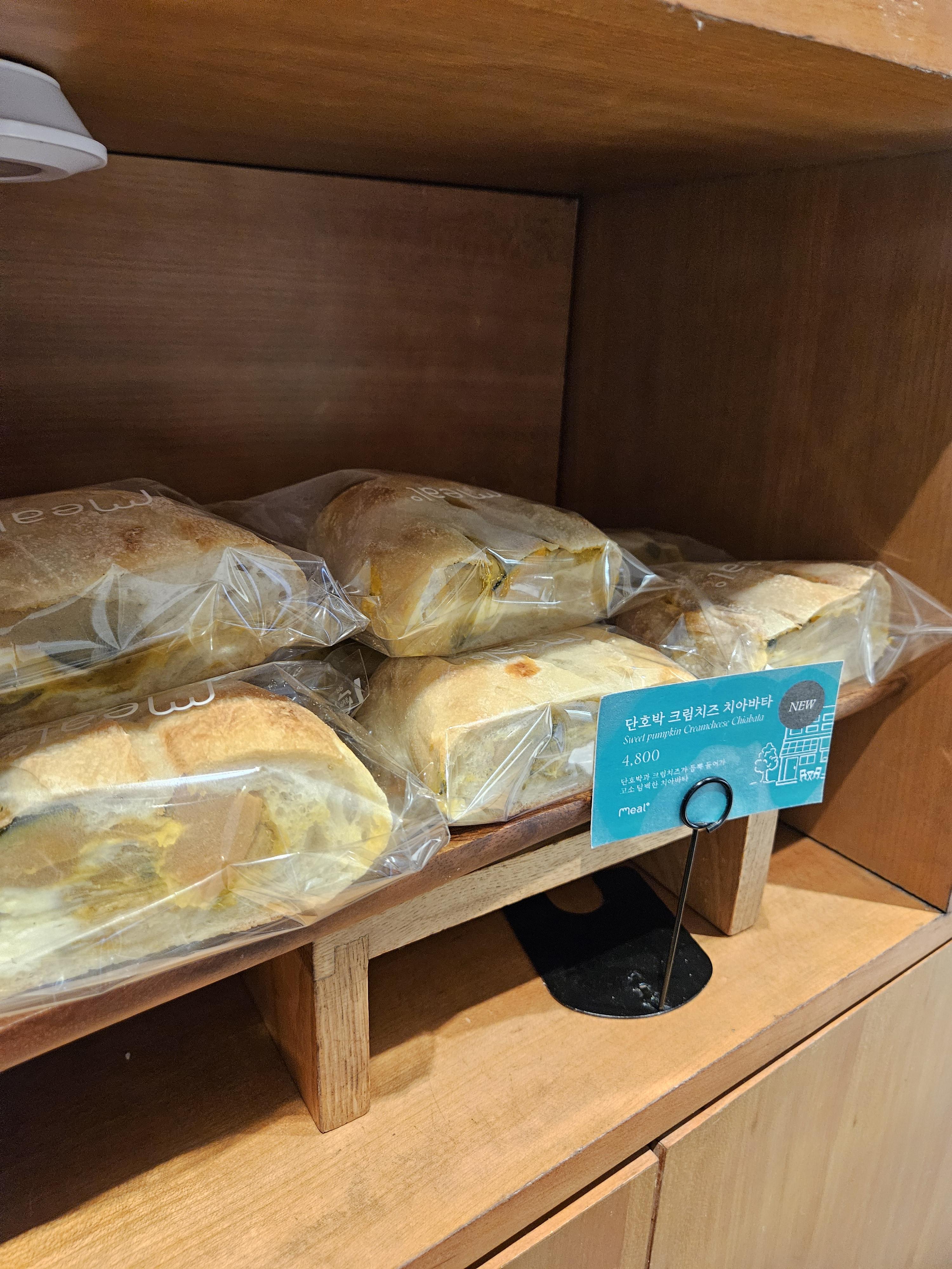 단호박 가득 넣고 크림치즈 들어가서 산미 있고 쫄깃한 치아바타 빵과 잘 어울리는 맛. 반 개 4,8원인데 혼자 순삭 하는 맛. 달지 않고 단호박 자연의 단맛에 치즈 풍미가 더해진 빵이라 맛 좋음.