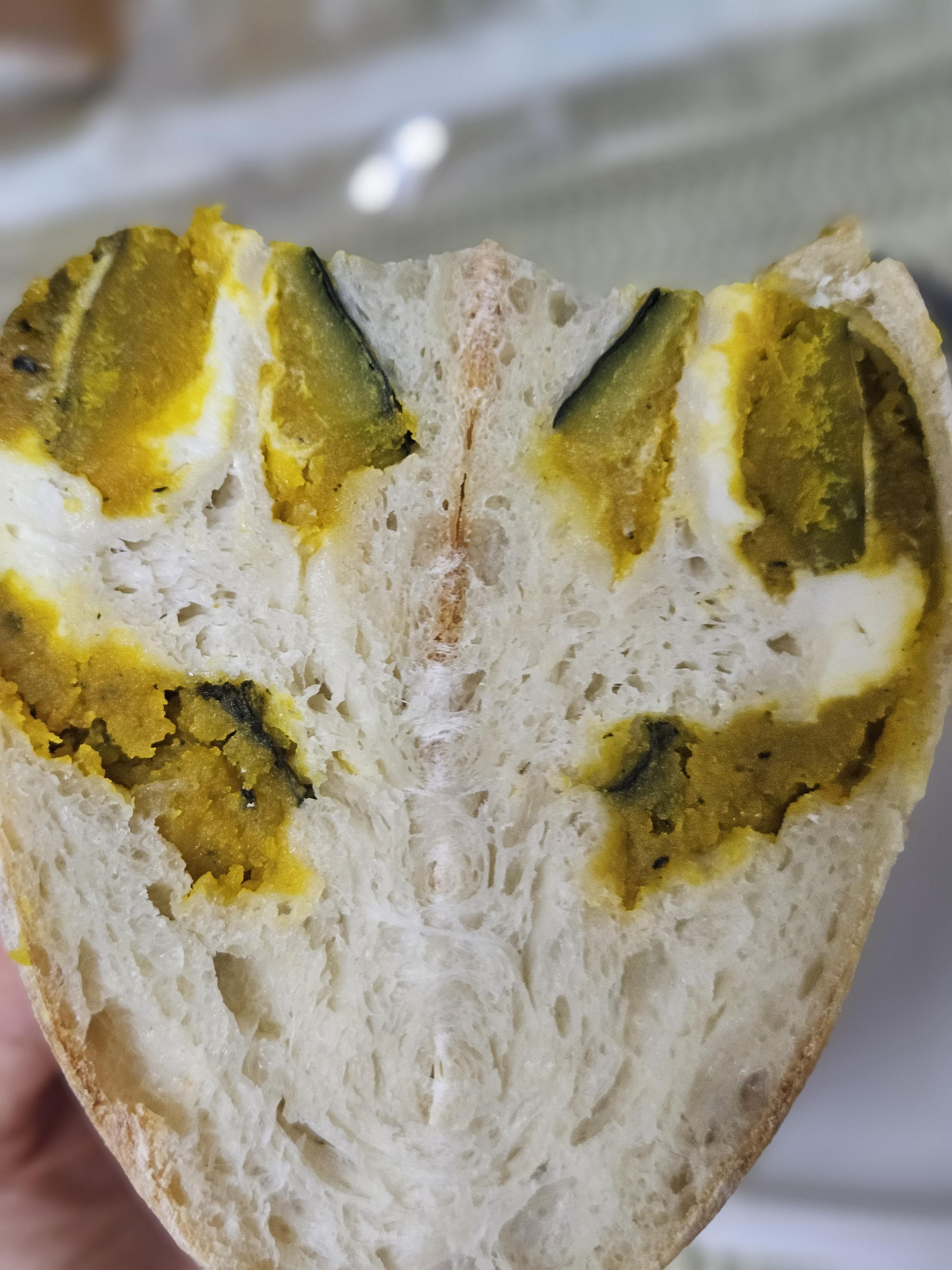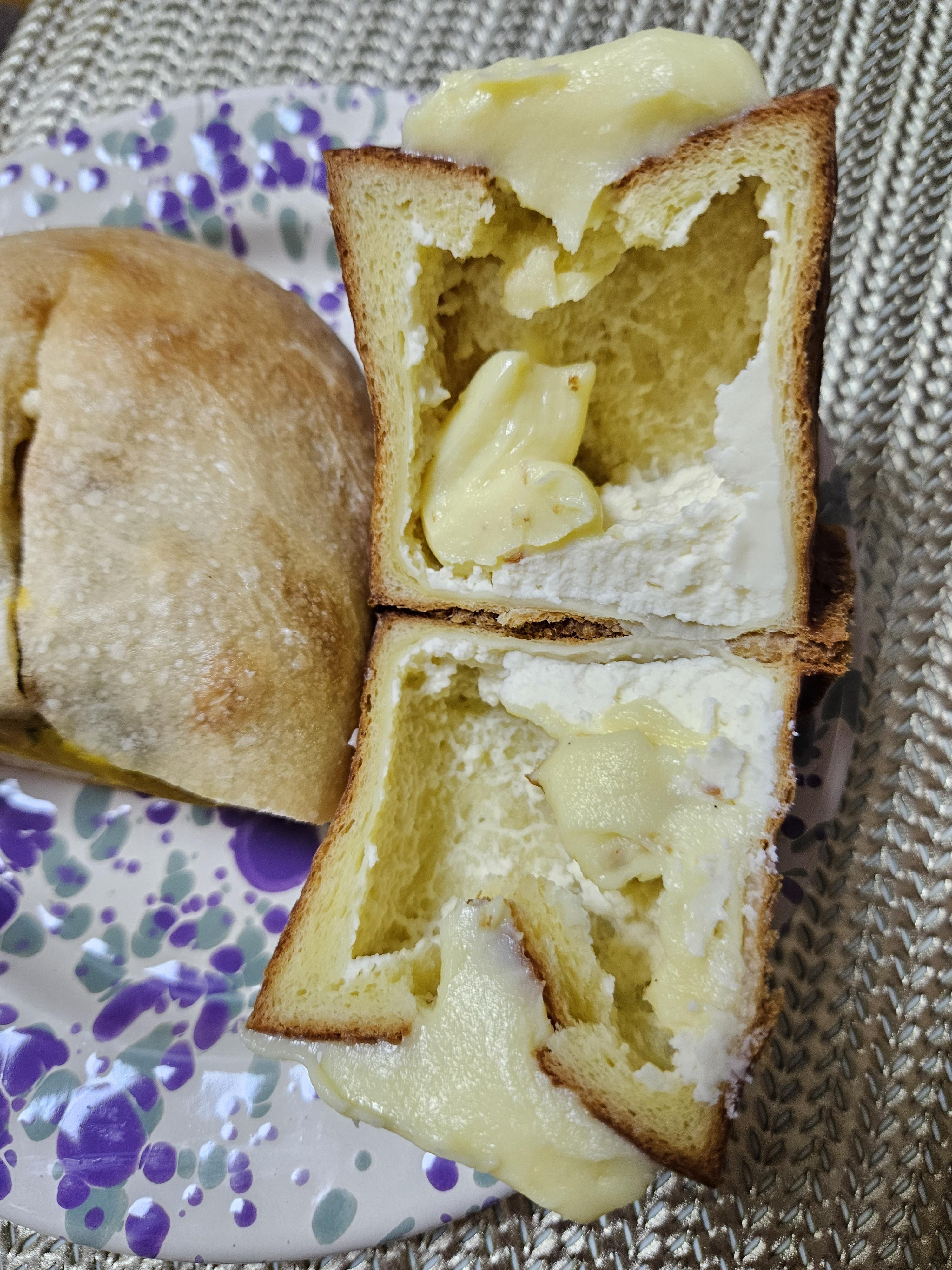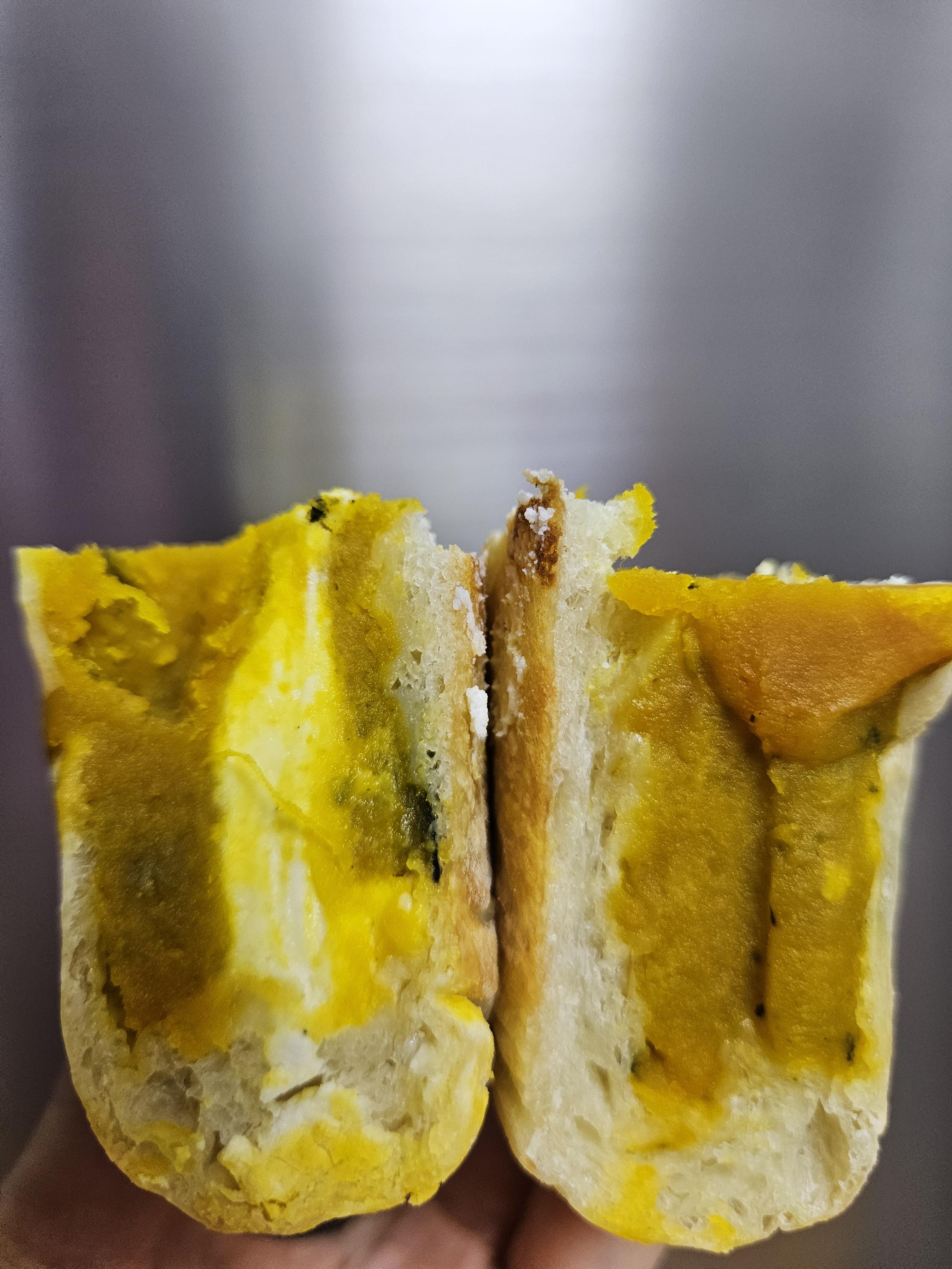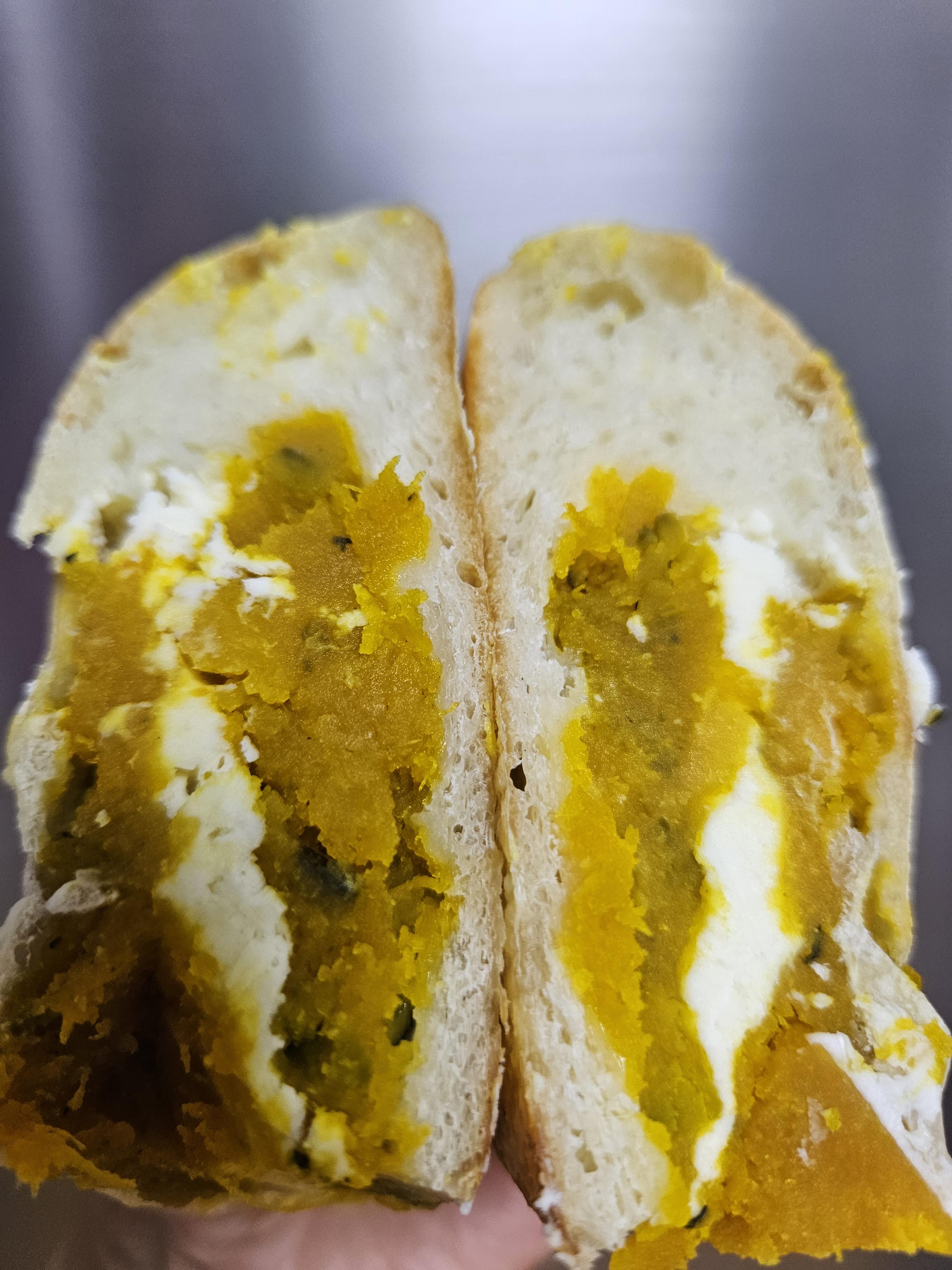 단호박 가득 넣고 크림치즈 들어가서 산미 있고 쫄깃한 치아바타 빵과 잘 어울리는 맛. 반 개 4,8원인데 혼자 순삭 하는 맛. 달지 않고 단호박 자연의 단맛에 치즈 풍미가 더해진 빵이라 맛 좋음.