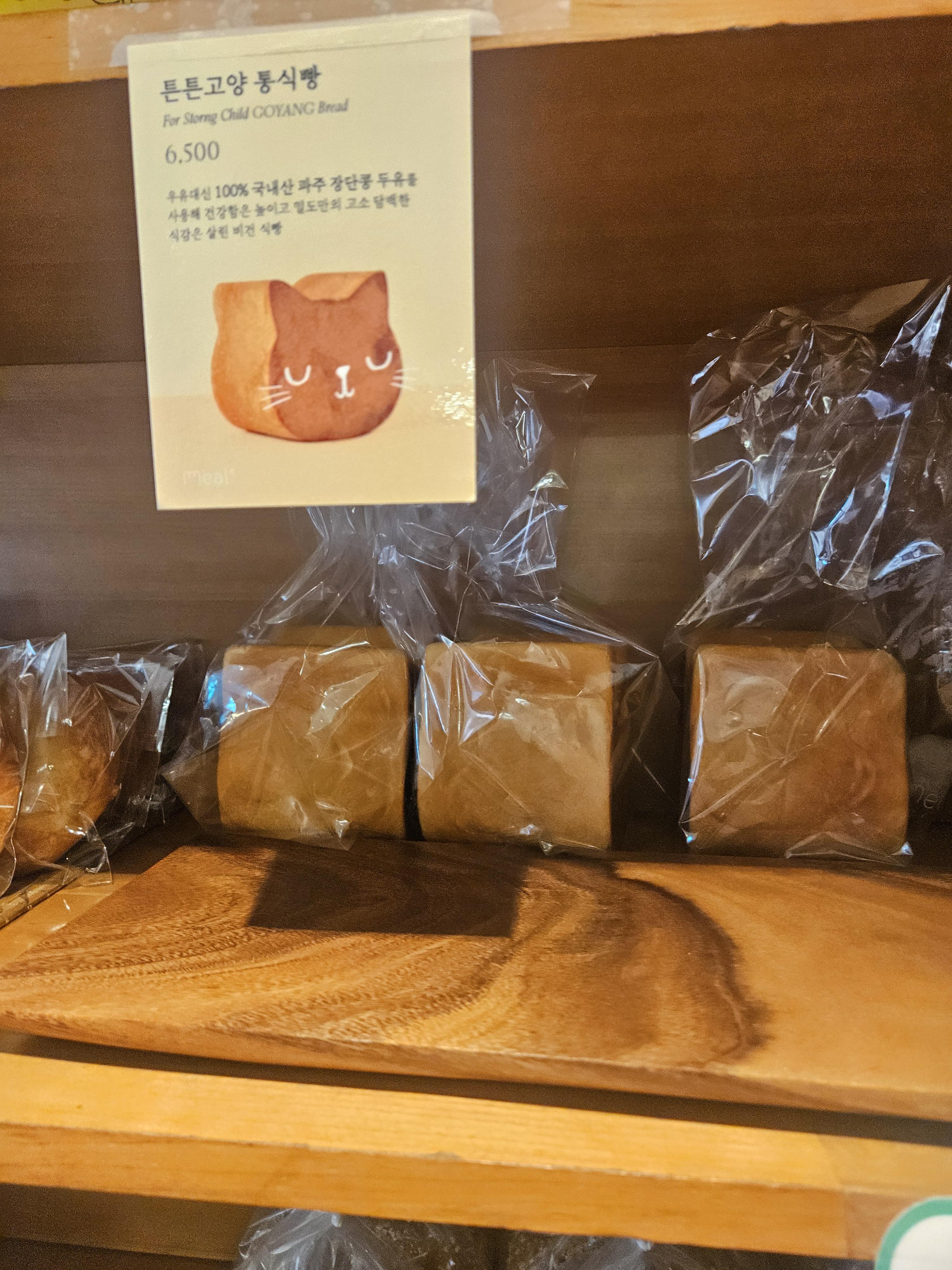 일반 식빵 별로 안 좋아하는데 이번에 가니 신상 식빵 종류가 늘어났고 두유 좋은데 우유대신 100% 국내산 파주 장단콩 두유로 만들었다는 귀여운 모양의 비건 식빵인 튼튼 고양 통식빵(6,5) 😺