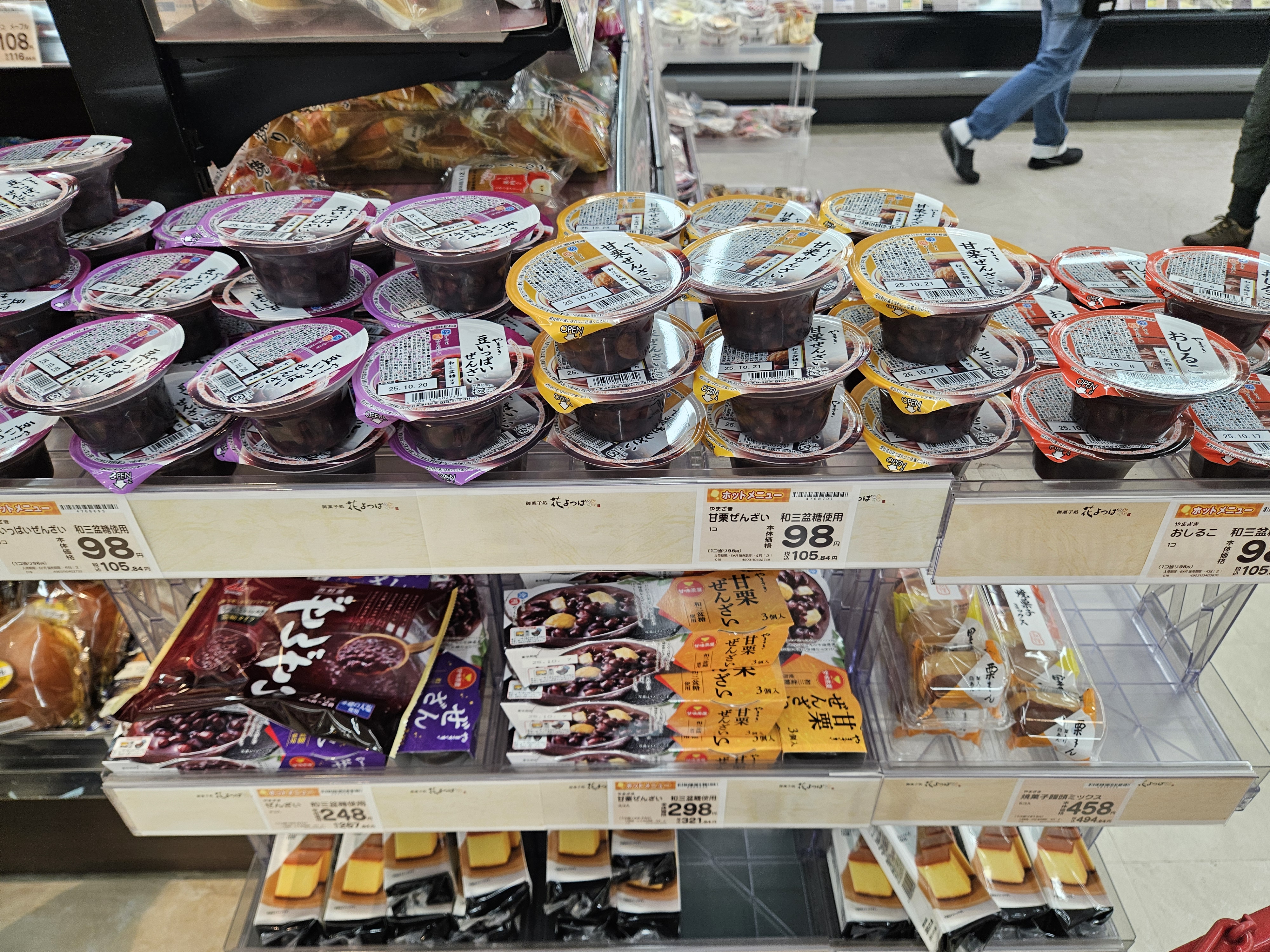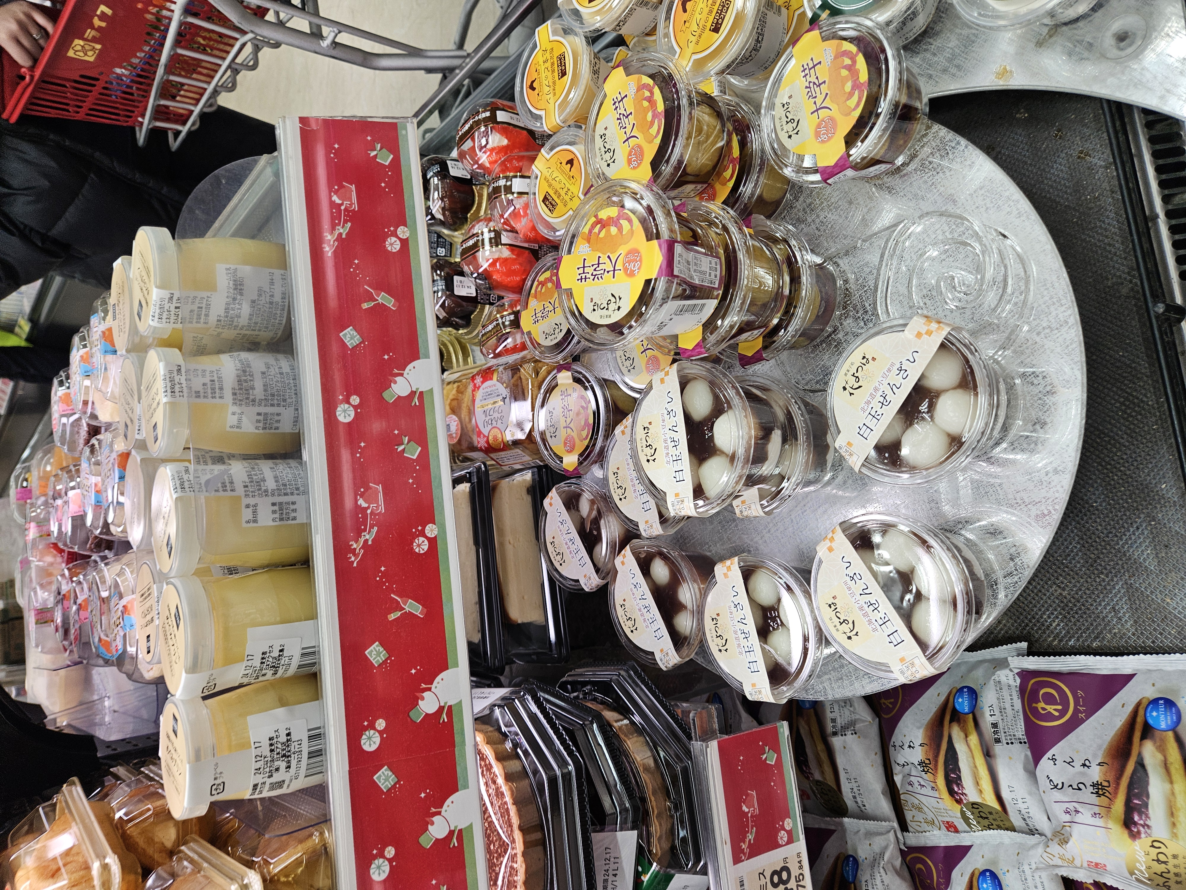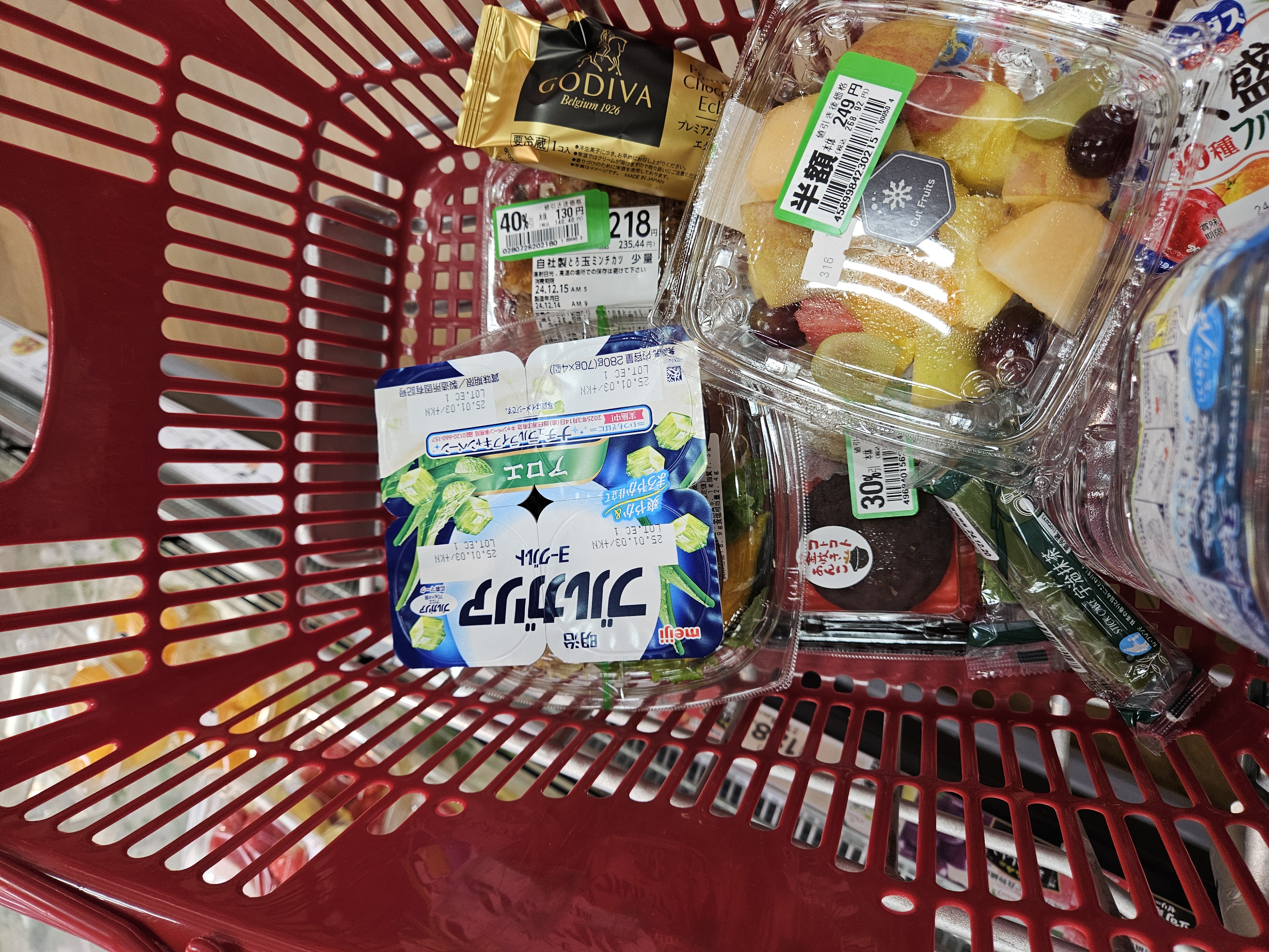 좋아하는 톳샐러드, 두부 샐러드, 앙금, 콩고물 모찌랑 요거트, 계란 돈카츠, 물, 과일 모둠, 스틱 말차치즈케이크, 고디바 에클레르까지 푸짐하게 샀는데 2208엔 약 2만 원 정도 ~