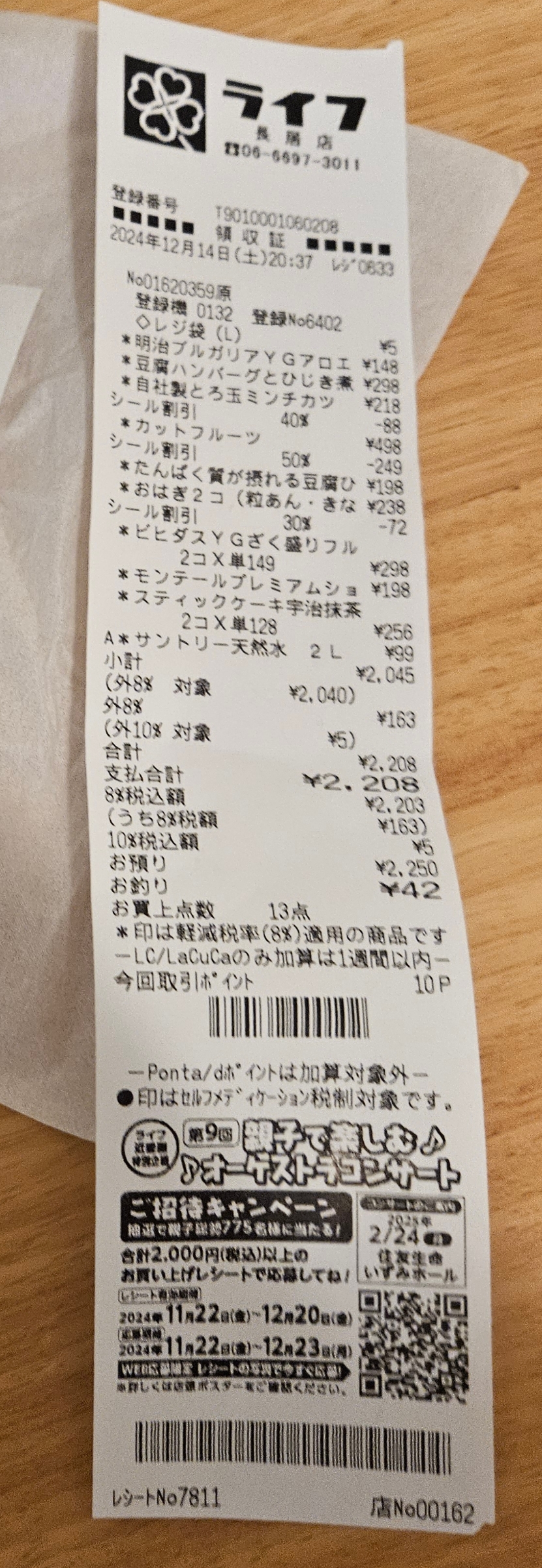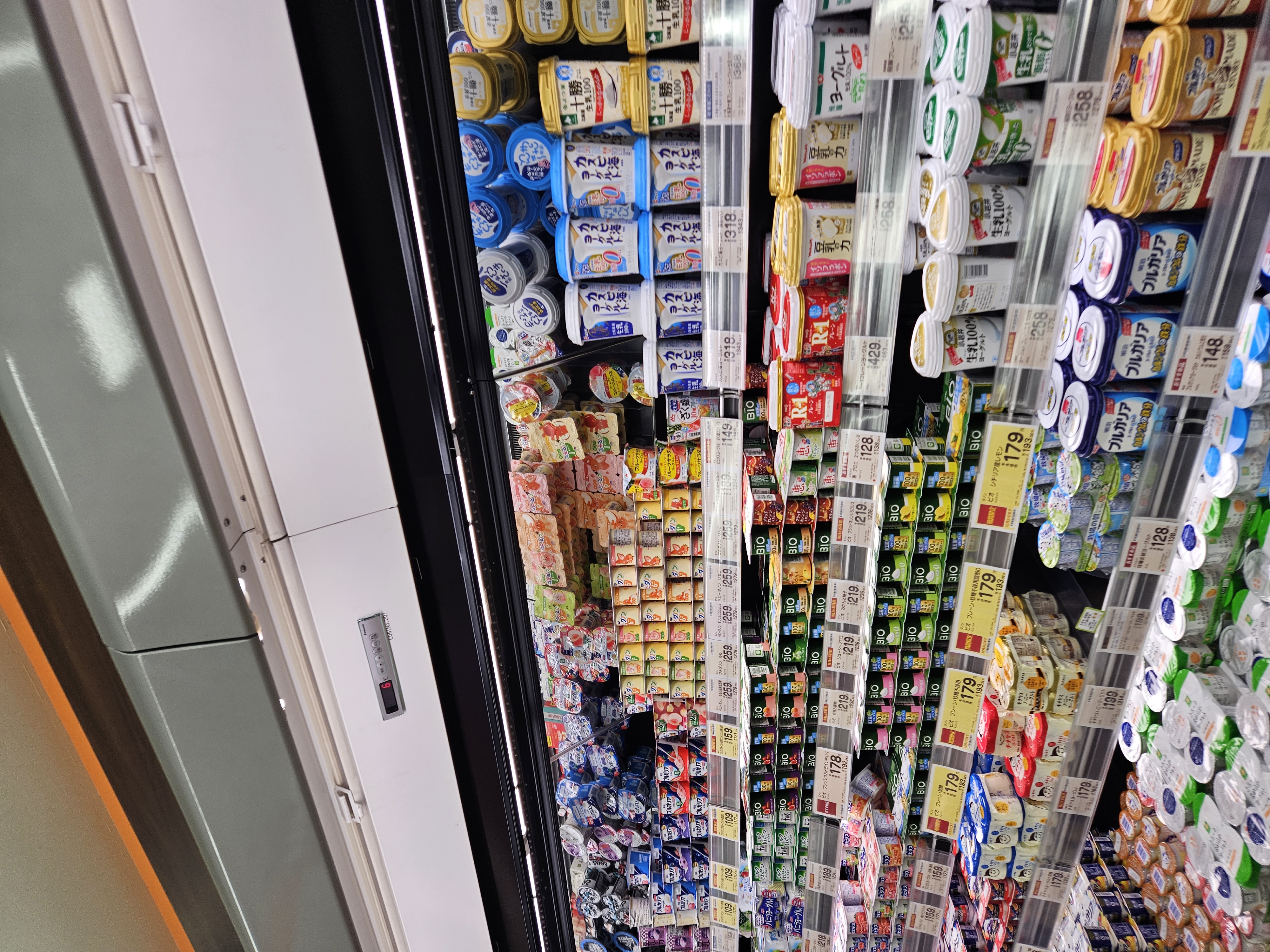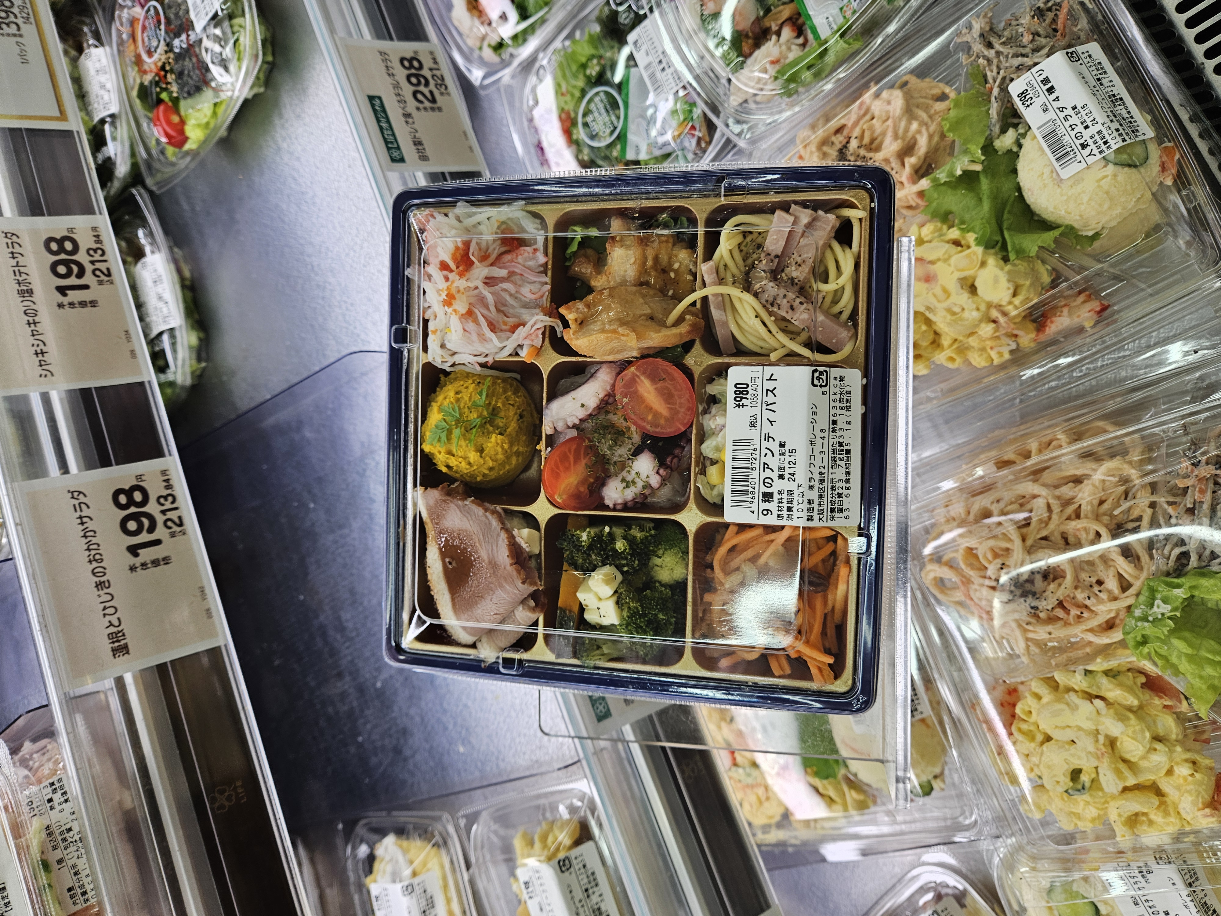 좋아하는 톳샐러드, 두부 샐러드, 앙금, 콩고물 모찌랑 요거트, 계란 돈카츠, 물, 과일 모둠, 스틱 말차치즈케이크, 고디바 에클레르까지 푸짐하게 샀는데 2208엔 약 2만 원 정도 ~