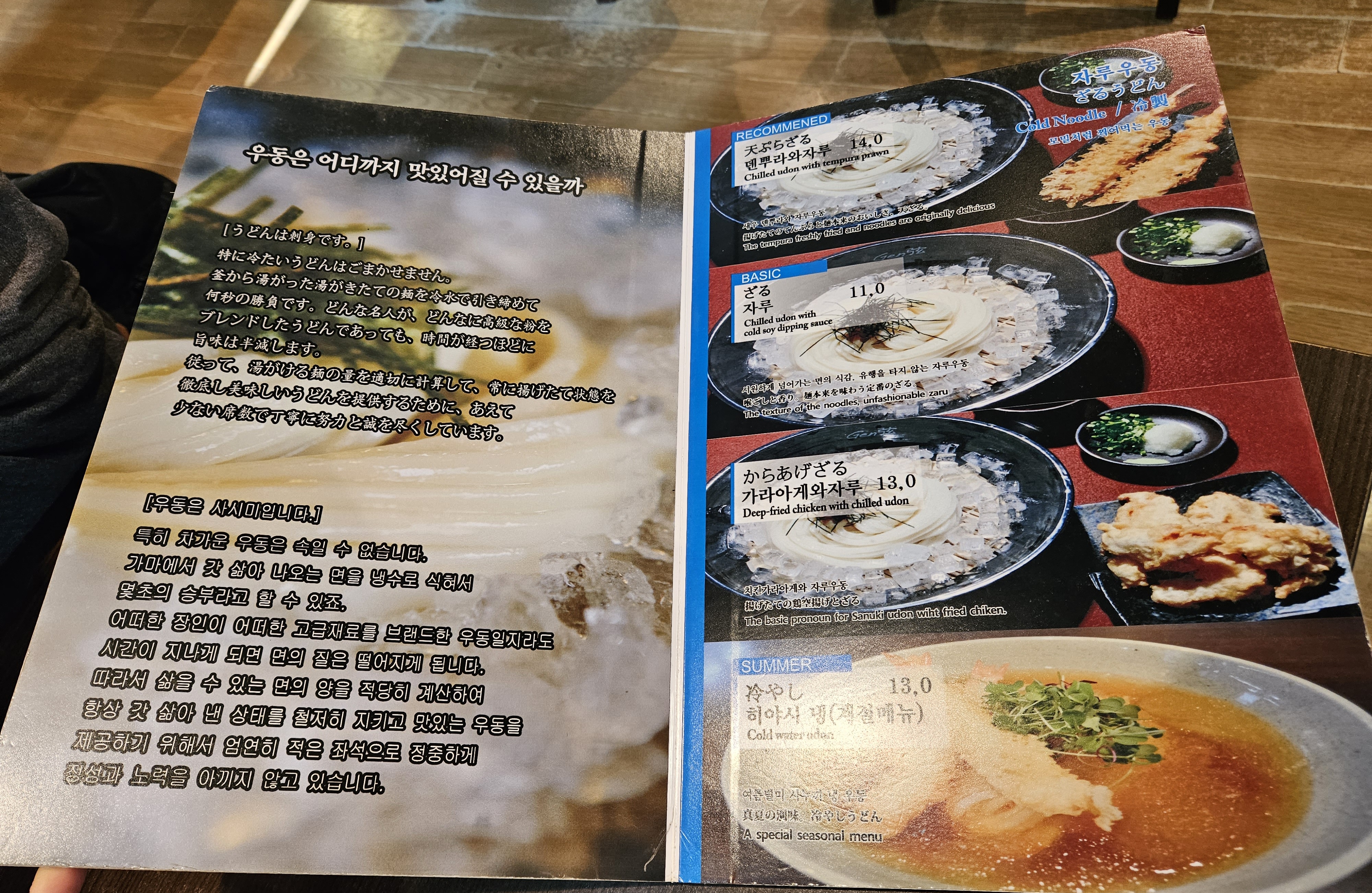 메뉴는 뜨거운 우동, 붓가케 우동, 자루 우동, 카레 우동, 크림 우동, 덮밥과 가라아게, 오코노미 야끼, 추가 메뉴와 주류 종류가 아주 다양하다.