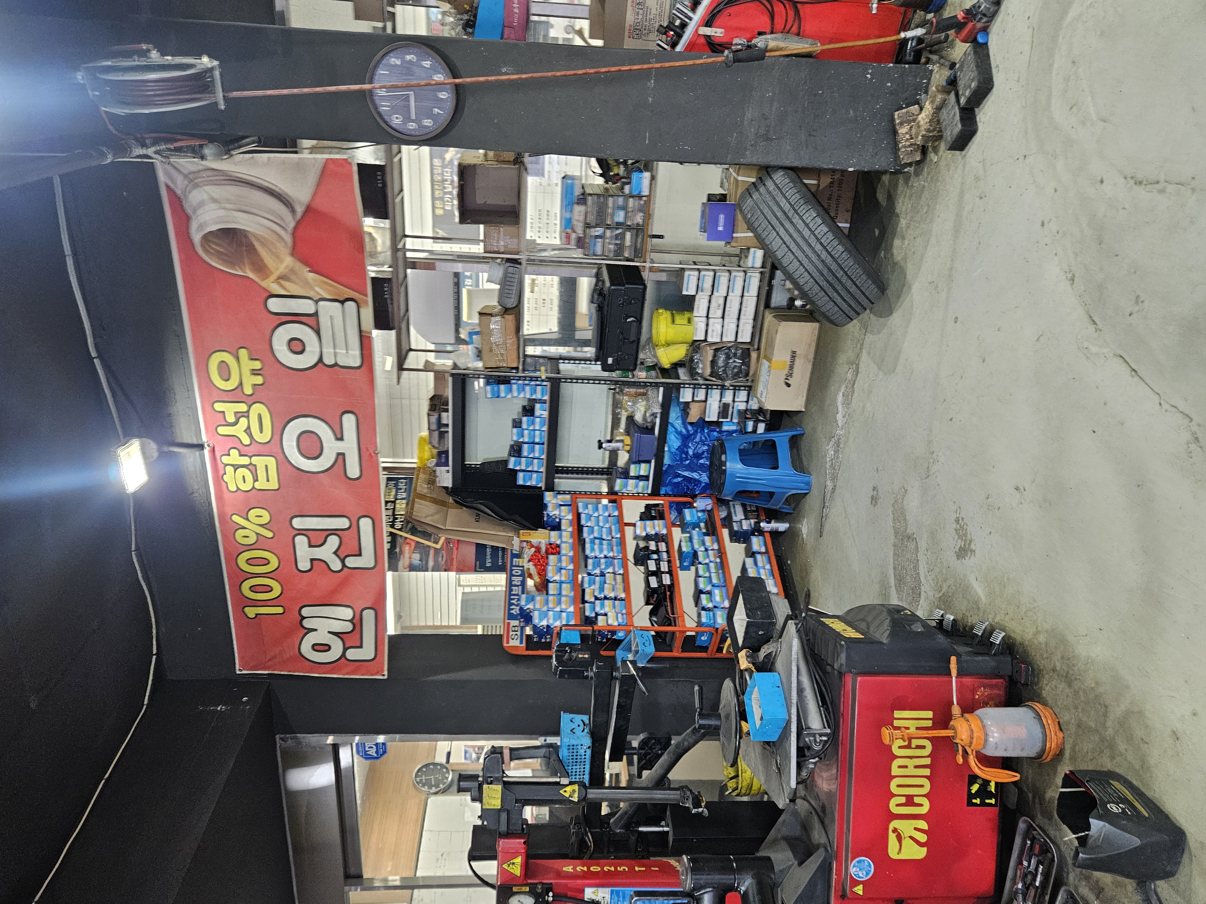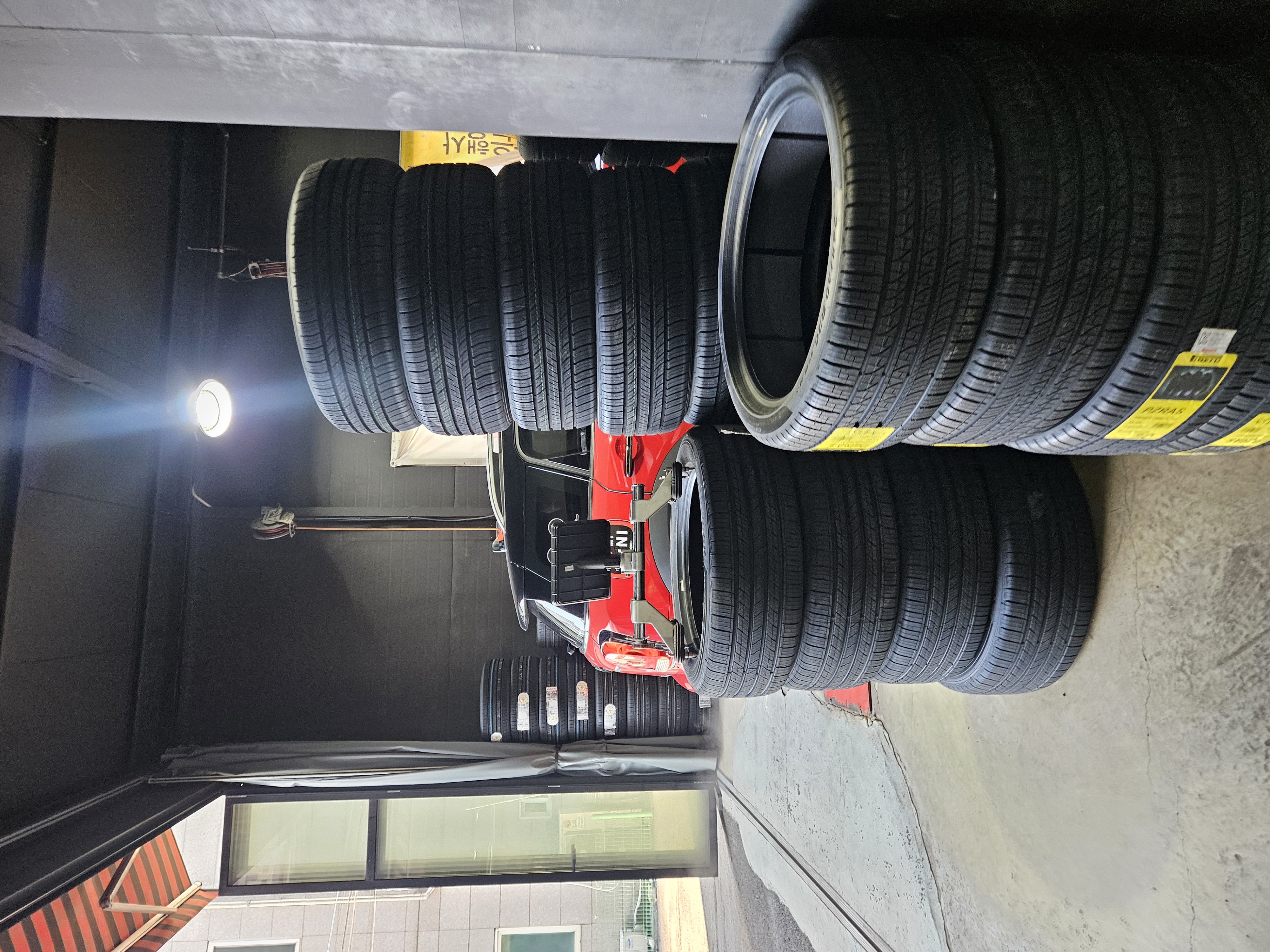 차량 3대 동시 수리 가능하게 리프트도 있고 쌓여있는 타이어 종류도 다양했다. 타이어 전문이지만 엔진오일, 미션오일, 브레이크, 에어컨도 점검 가능한 곳.