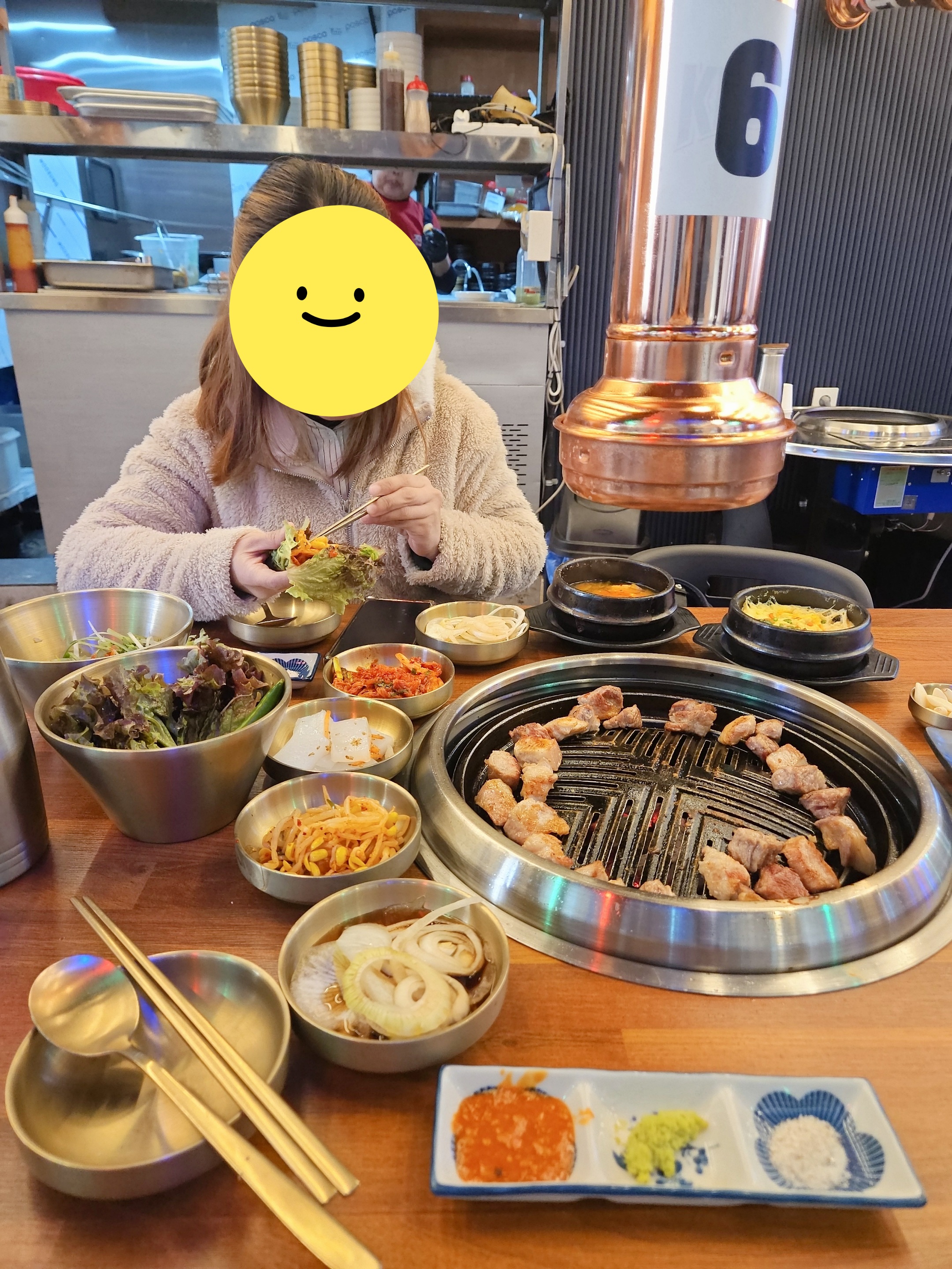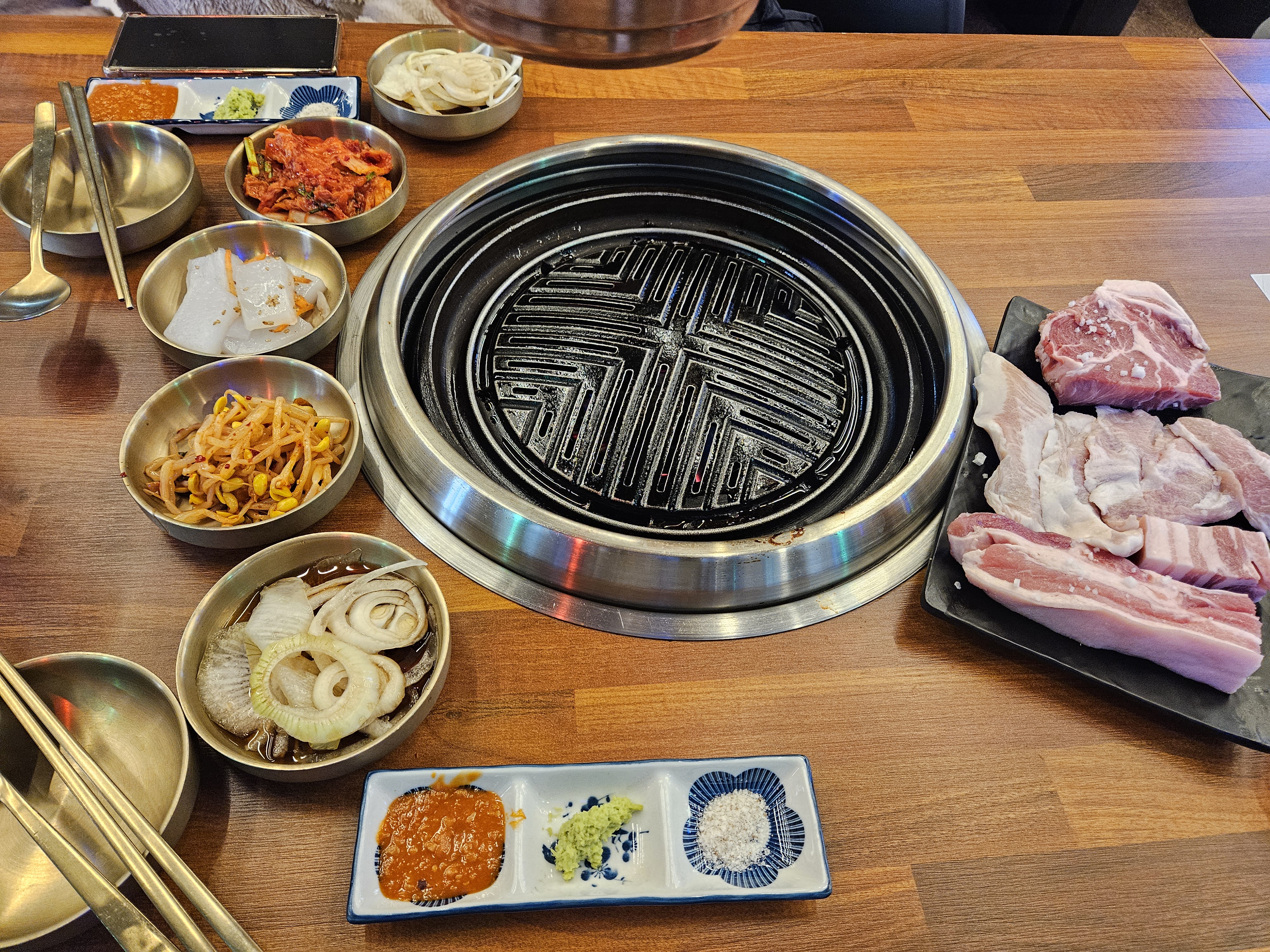 목살 삼겹살 항정살 주문하니 깔끔한 반찬과 쌈채소, 된장찌개에 계란찜도 제공된다.