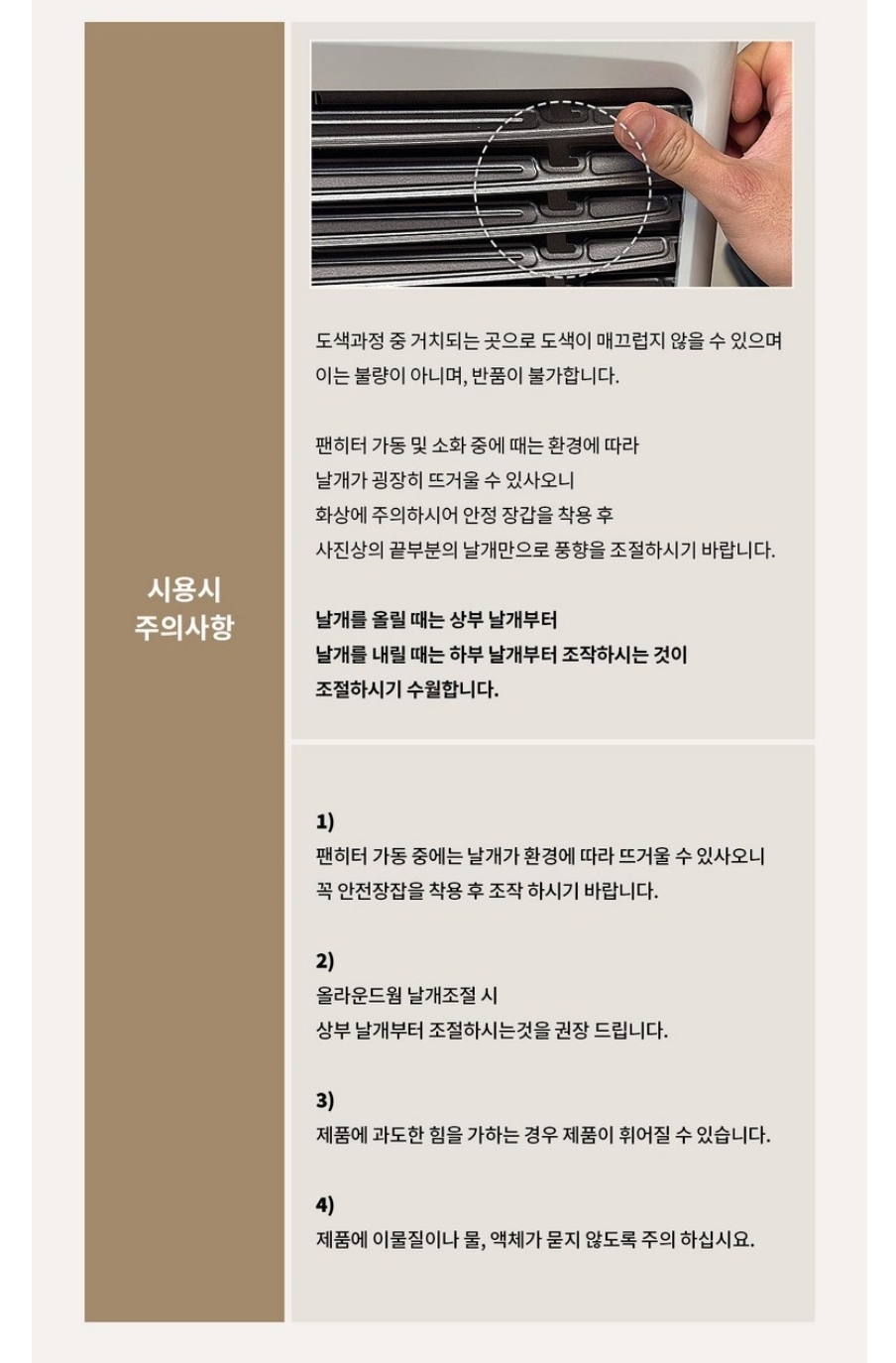 최상단, 최하단 날개 조절 Lock 설계 적용으로 뜨거운 바람 누적으로 안 한 전면 본체 패널 과열 문제를 안전하게 사용할 수 있고, 분체 도장으로 냄새와 변색 문제를 해결하여 안정적으로 사용할 수 있는 것이 특징.