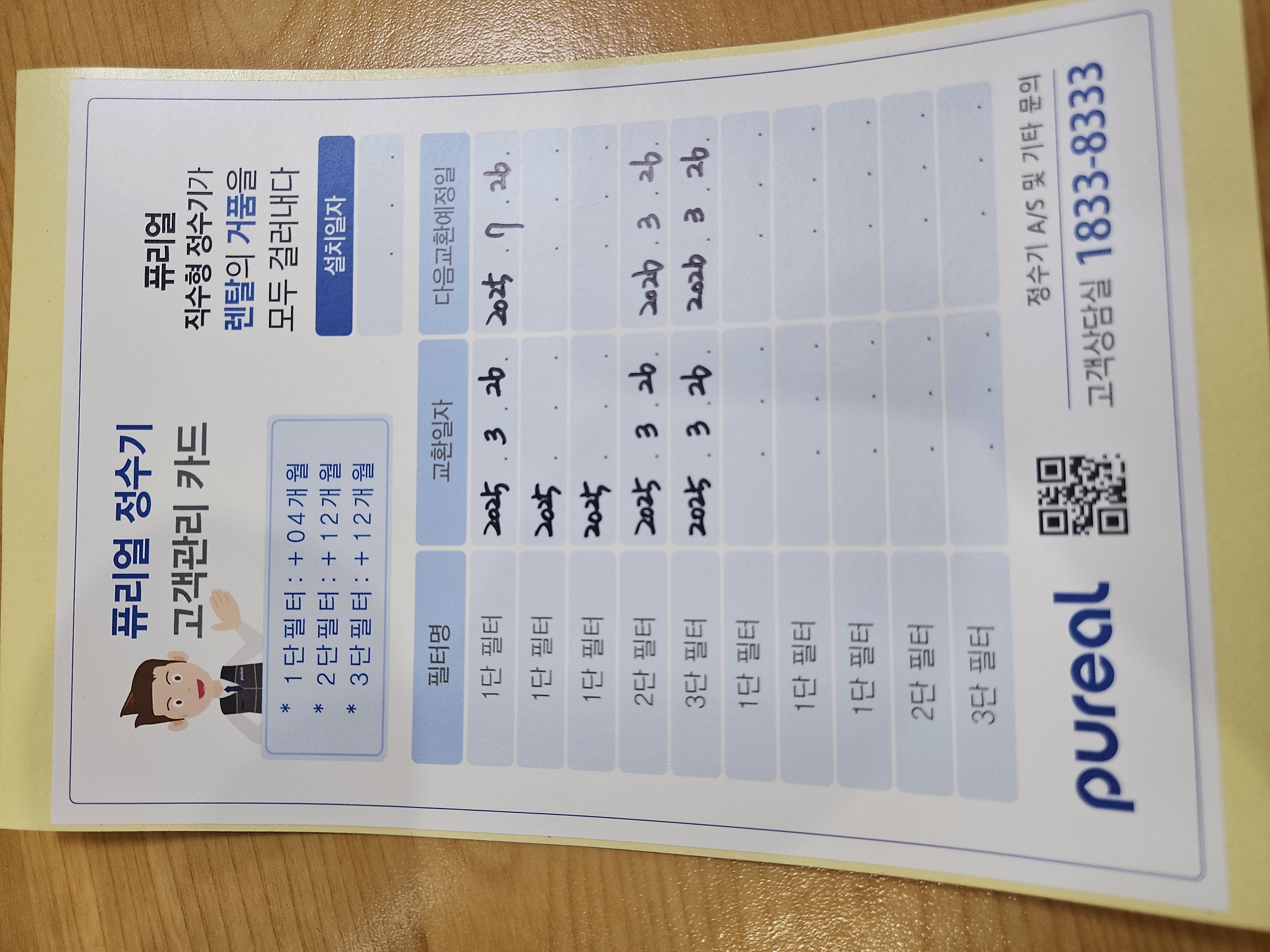 필터에 보면 교체일을 적어두는 공간이 있어 교체 시마다 날짜를 적어두곤 하는데 1년에 1번 교체해야 하는 2 & 3번 필터도 작년 3월 말 교체라 1년이 다 되어가니 그냥 필터 전부 교체해야겠더라.