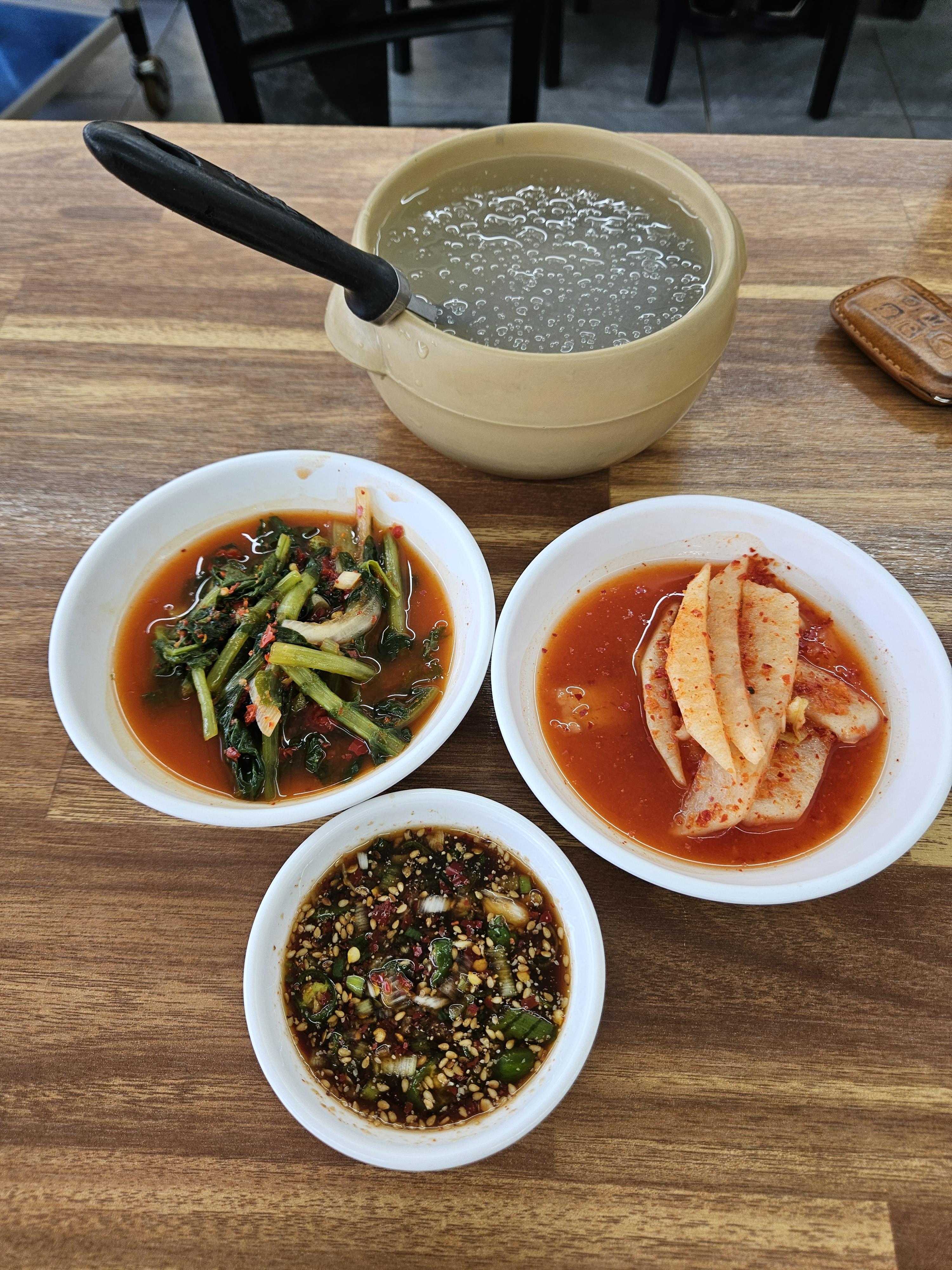 기본찬은 열무김치와 무절임이라 해야 하나 김치라 해야 하나 두 가지 김치에 감자전 양념간장, 살얼음 동치미 국물이 제공된다.