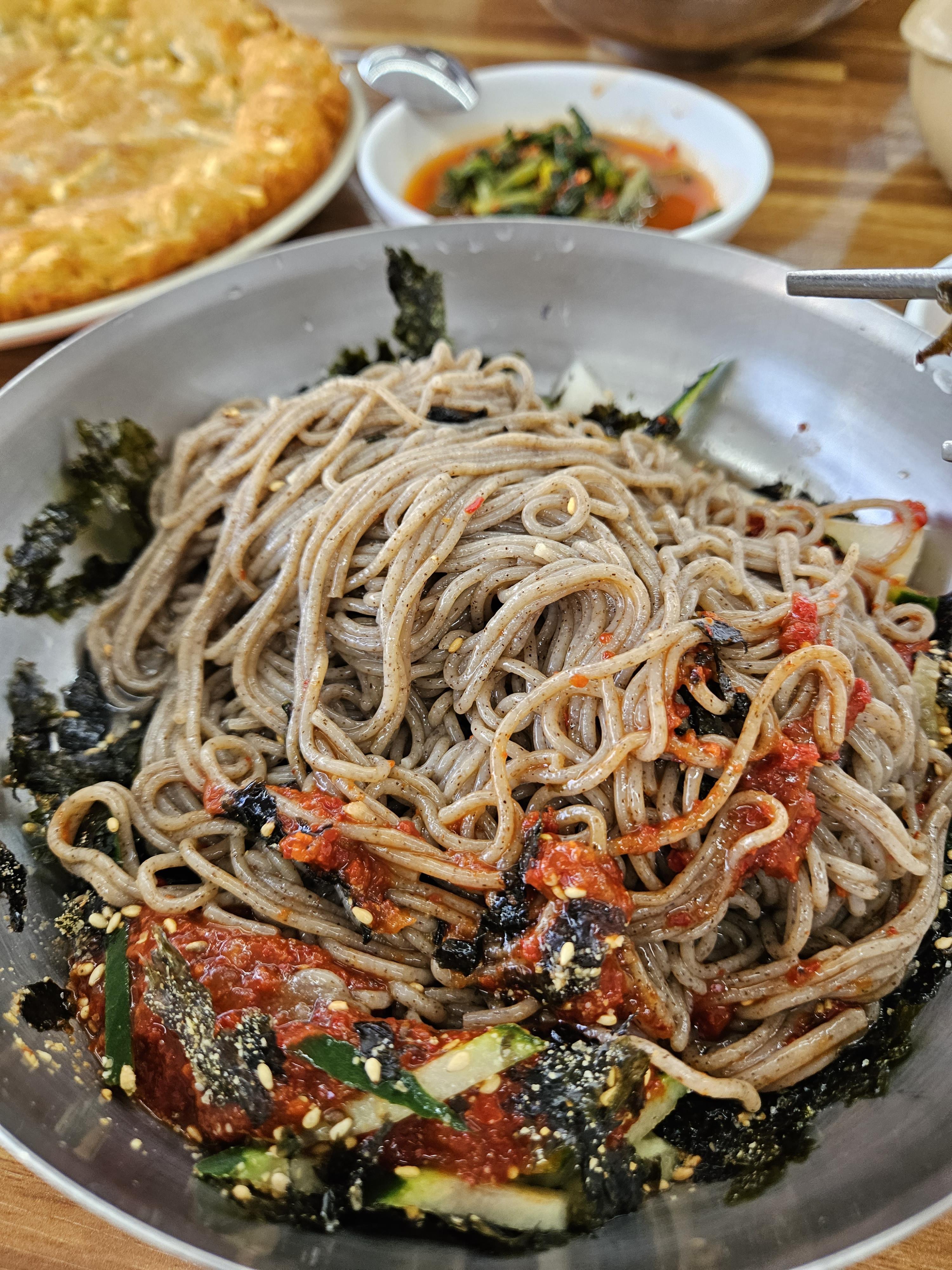 메밀 막국수 양이 많았는데 무리하며 먹다 보니 평소 먹는 양의 거의 두 배 가까운 양을 먹어 너무 배불렀다.