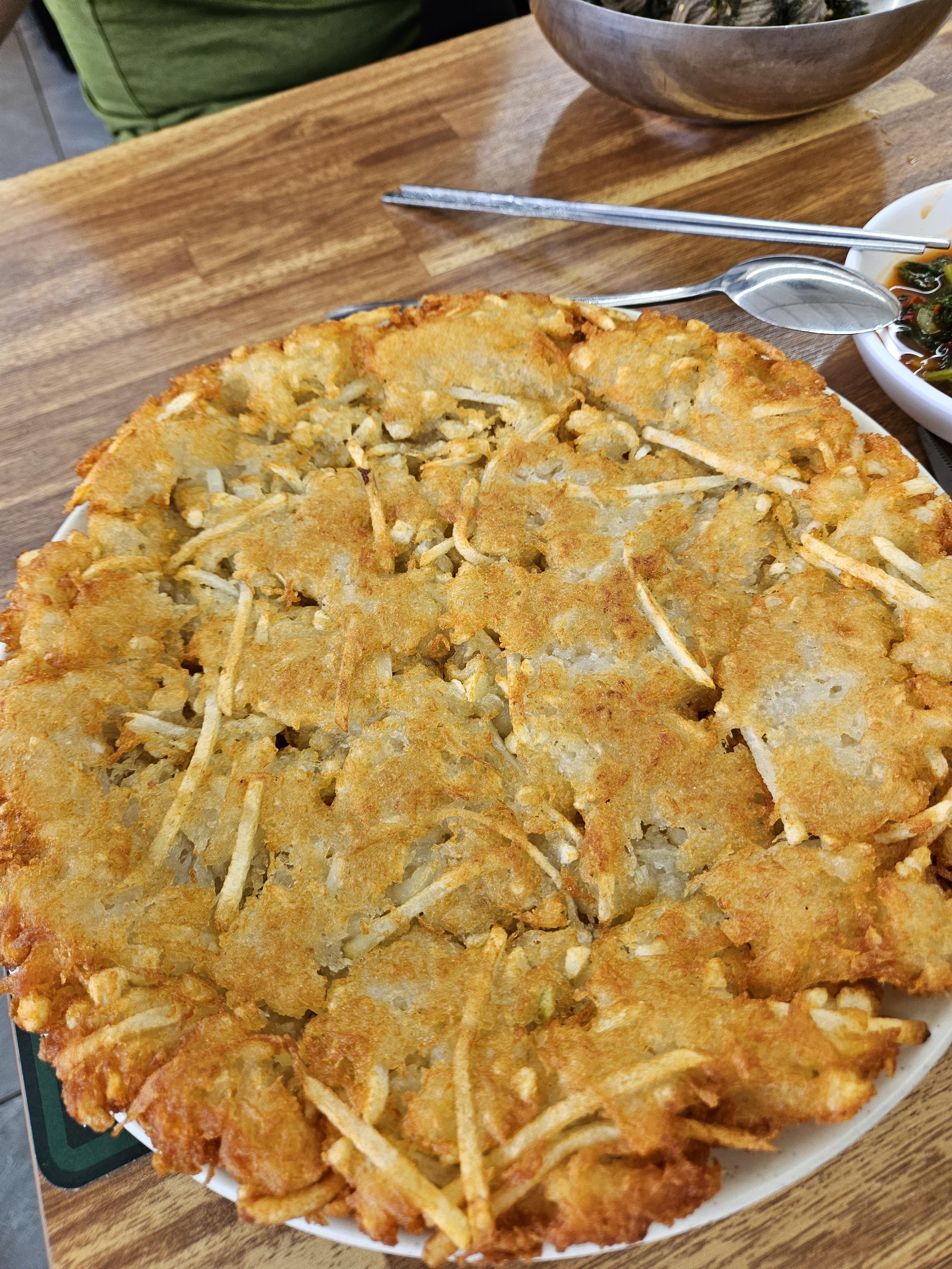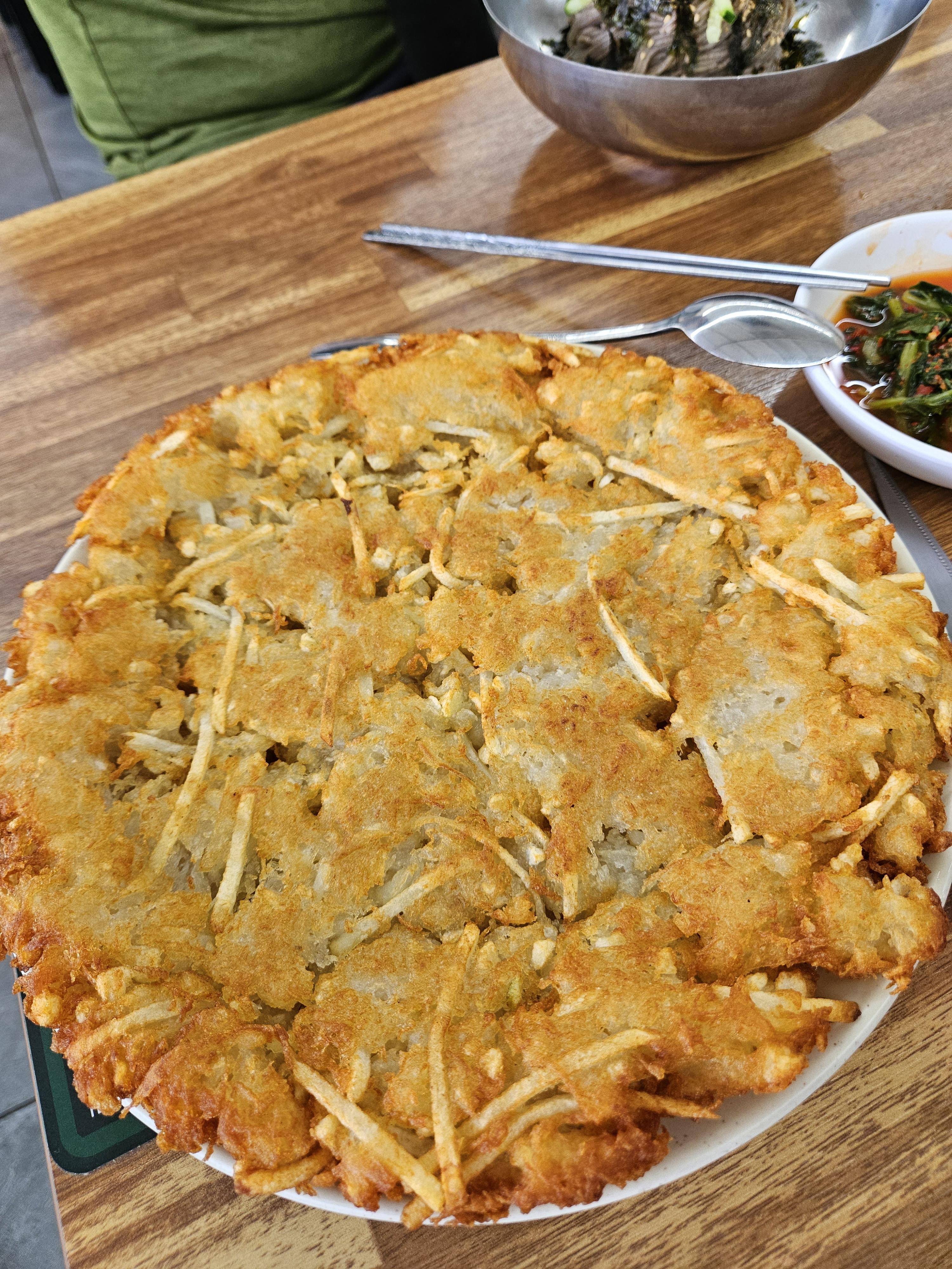 대형 접시 하나를 가득 채운 두툼한 감자전 비주얼도 흔하지 않다.