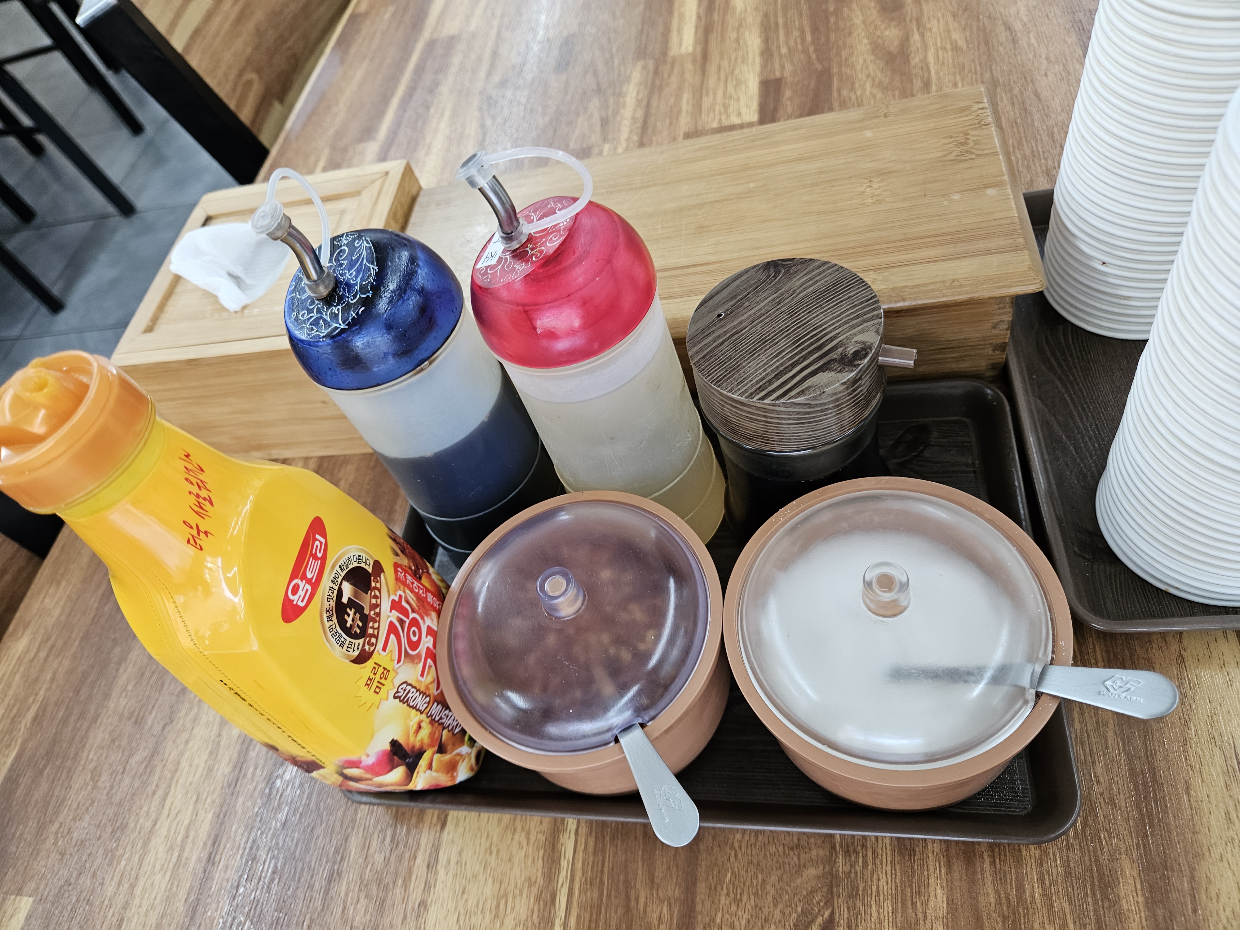 테이블마다 막국수에 곁들일 들기름, 식초, 간장, 겨자, 고추씨, 설탕 등 양념이 다양하게 구비되어 있어 안내되어 있는 동치미 막국수 or 비빔 막국수 맛있게 먹는 법을 참고하여 기호에 맞게 곁들여 먹으면 된다.