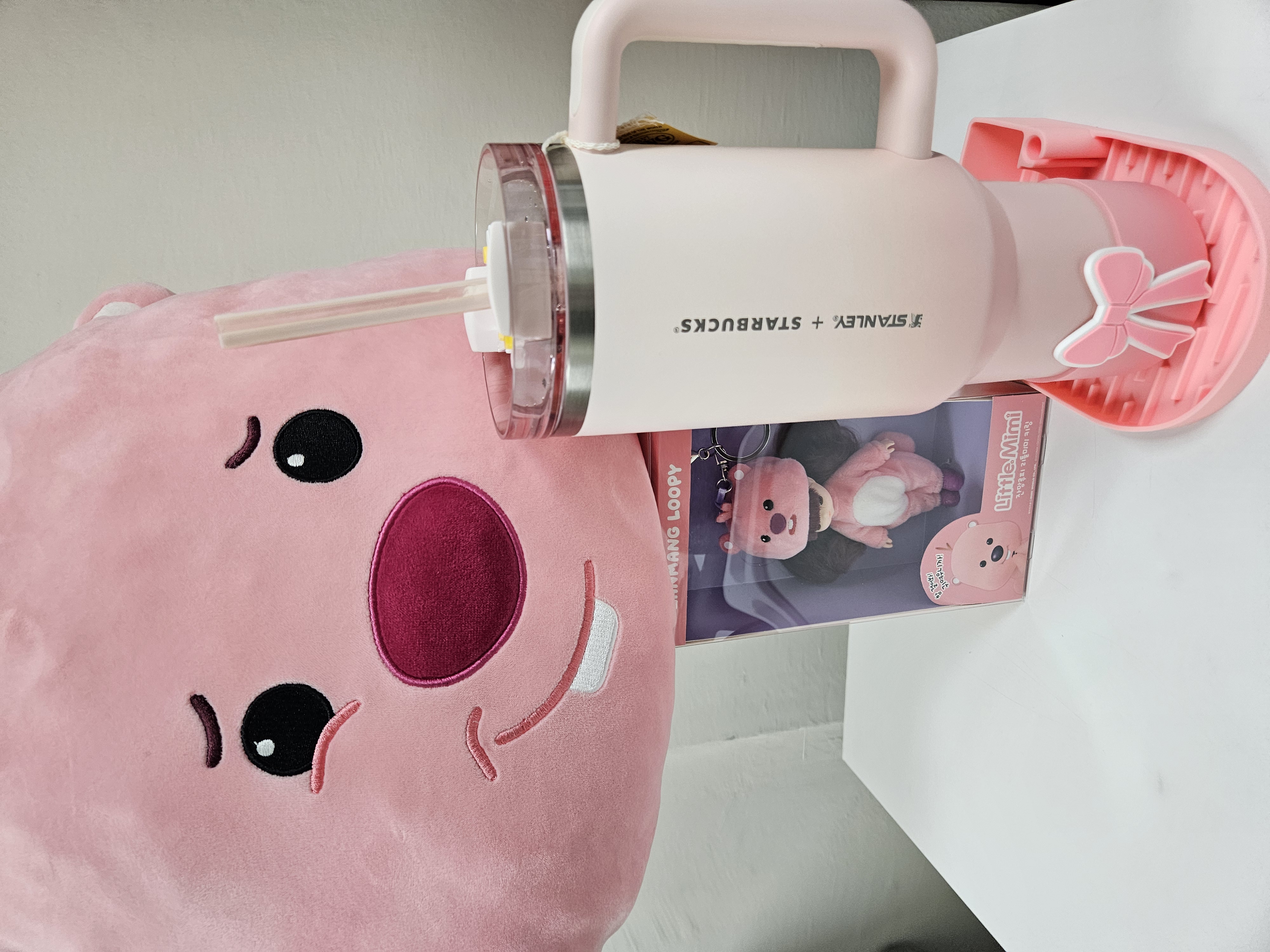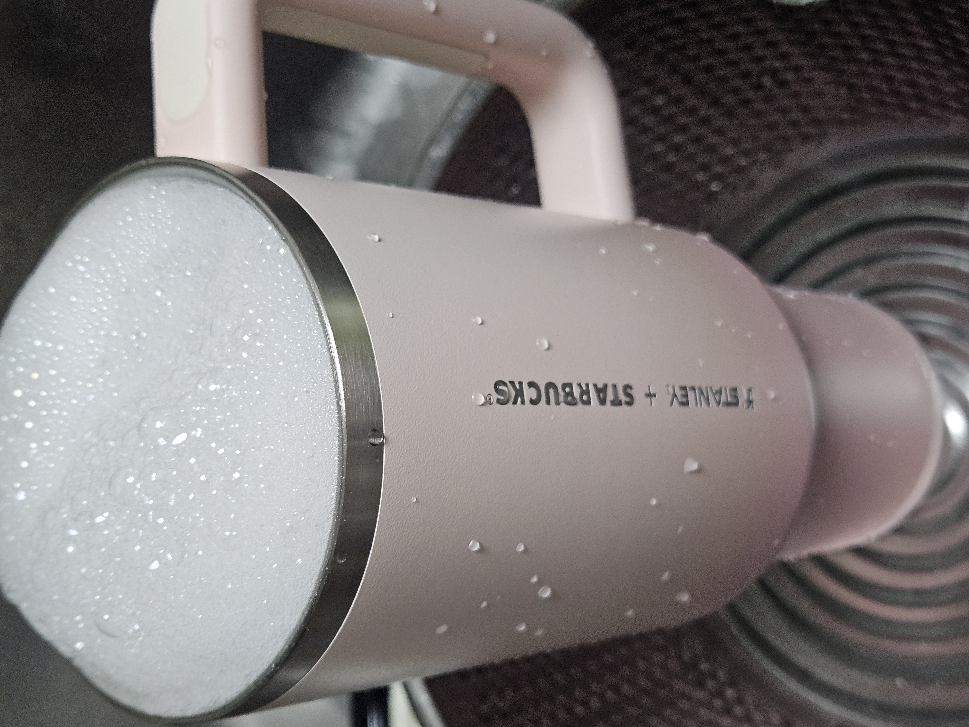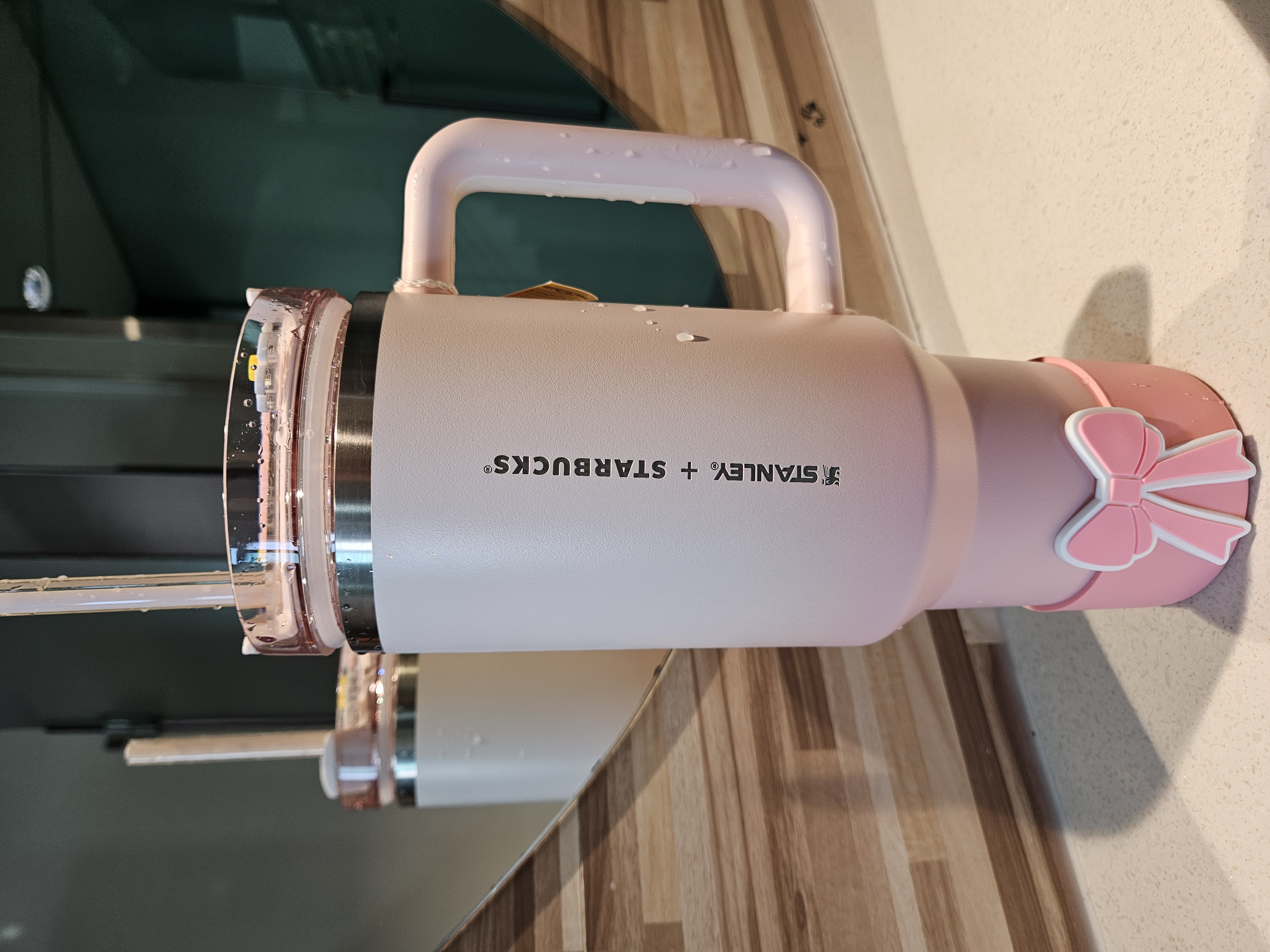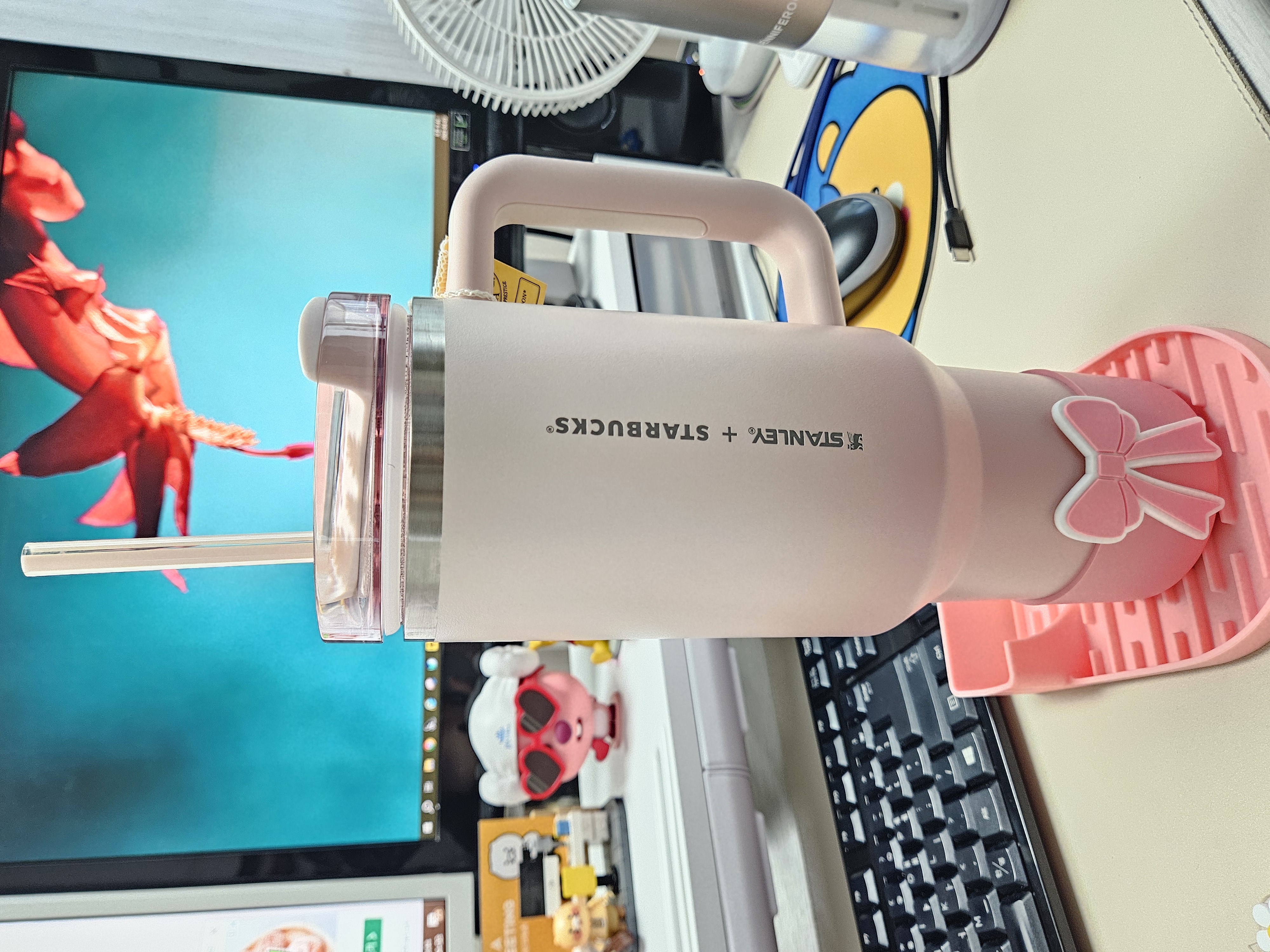 작은 폰트, 세로방향으로 인쇄된 스타벅스 + 스탠리 로고가 더 깔끔해 보이고 핑크빛 그라데이션 컬러도 요즘 더 화사하게 사용할 수 있을 것 같아서 스타벅스 SS 스탠리 핑크 켄처 텀블러 1183ml로 골랐음.