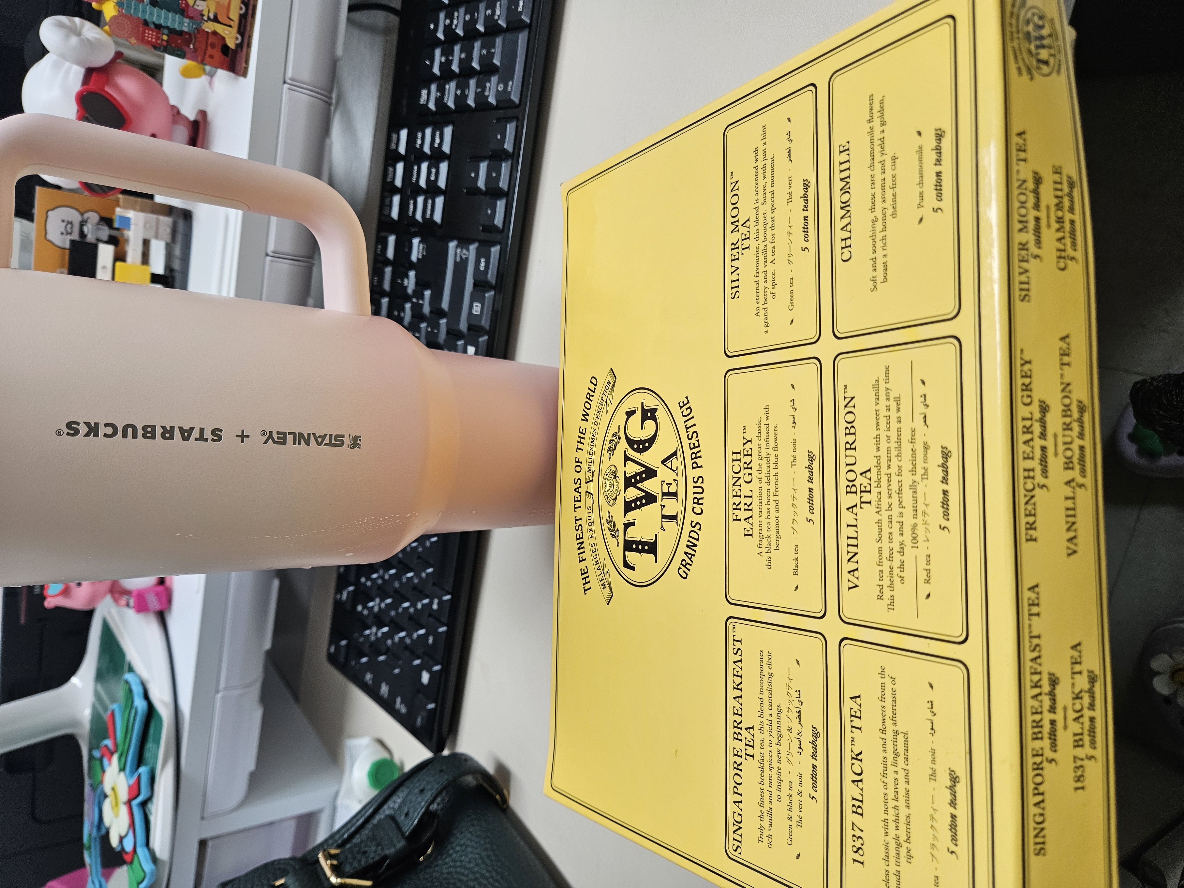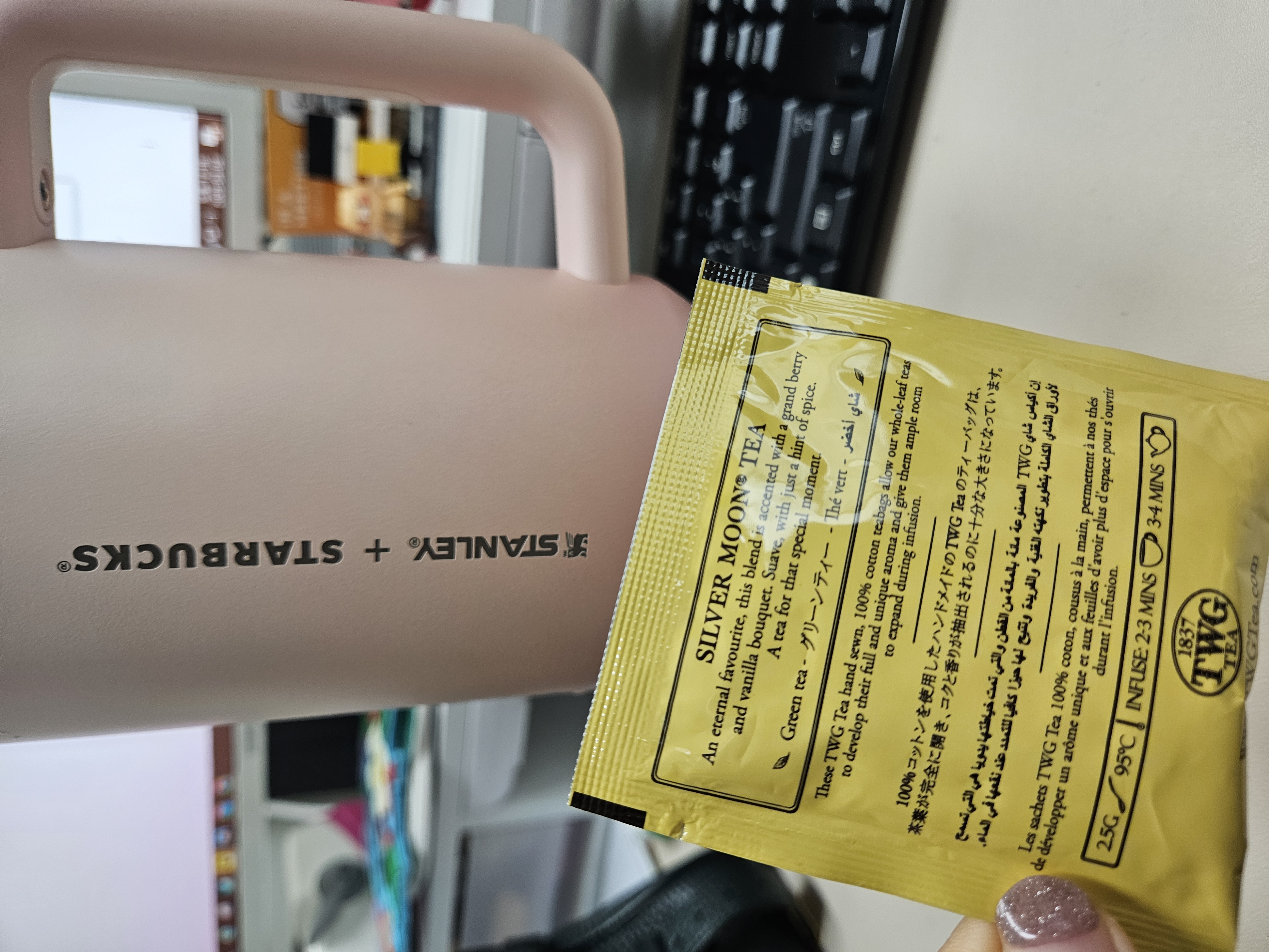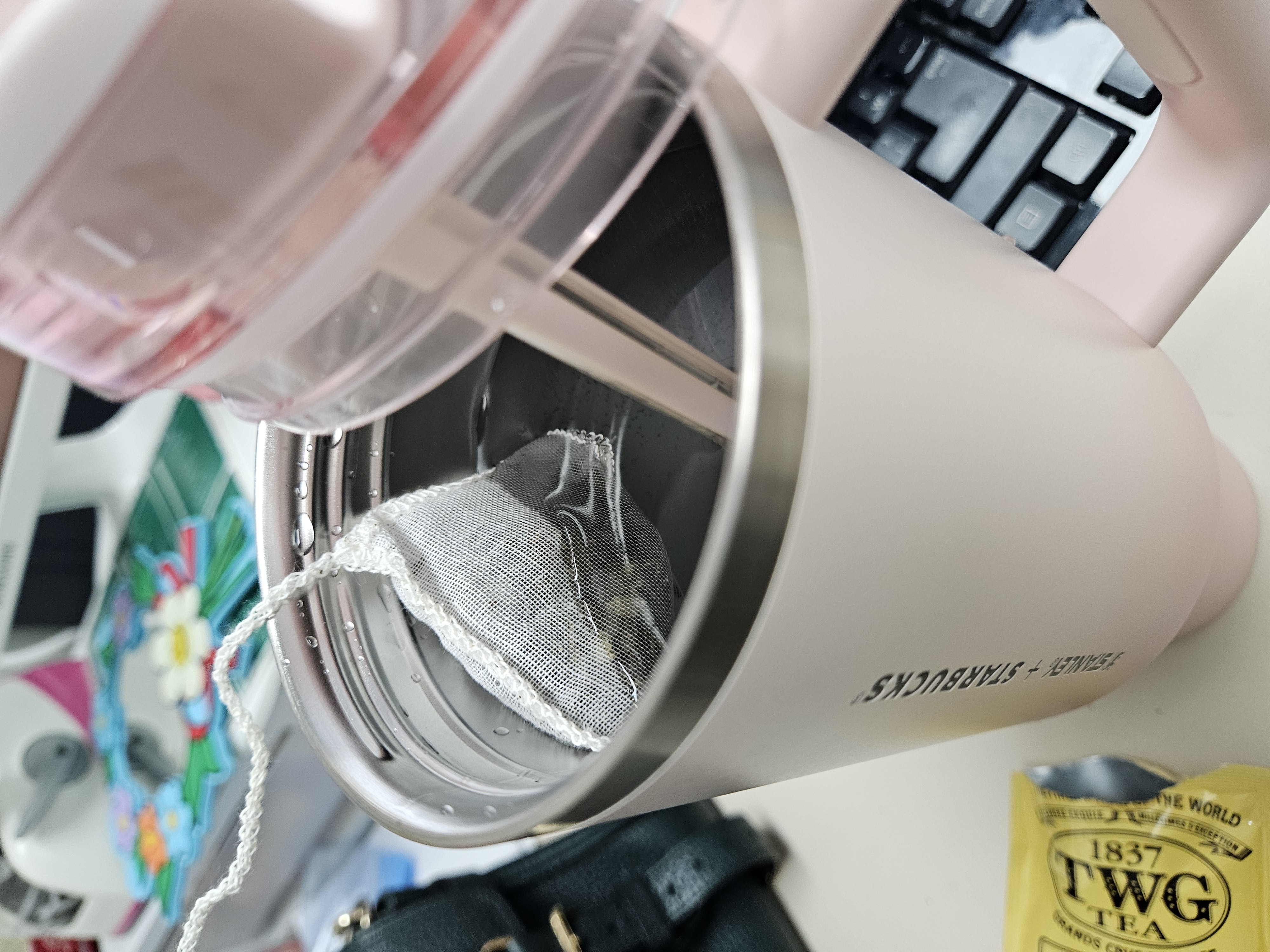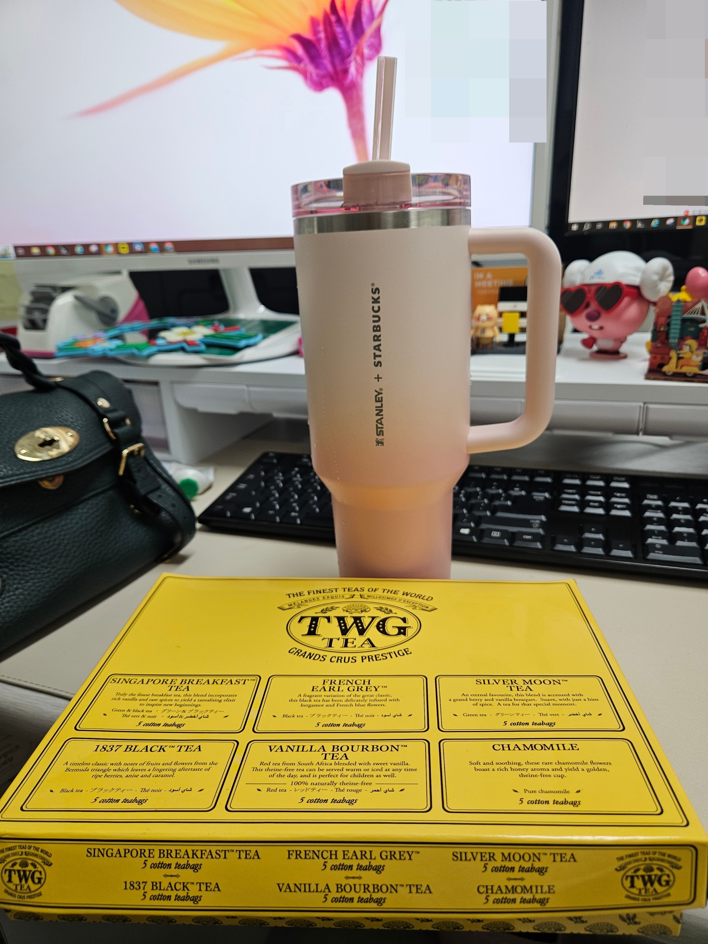 작은 폰트, 세로방향으로 인쇄된 스타벅스 + 스탠리 로고가 더 깔끔해 보이고 핑크빛 그라데이션 컬러도 요즘 더 화사하게 사용할 수 있을 것 같아서 스타벅스 SS 스탠리 핑크 켄처 텀블러 1183ml로 골랐음.