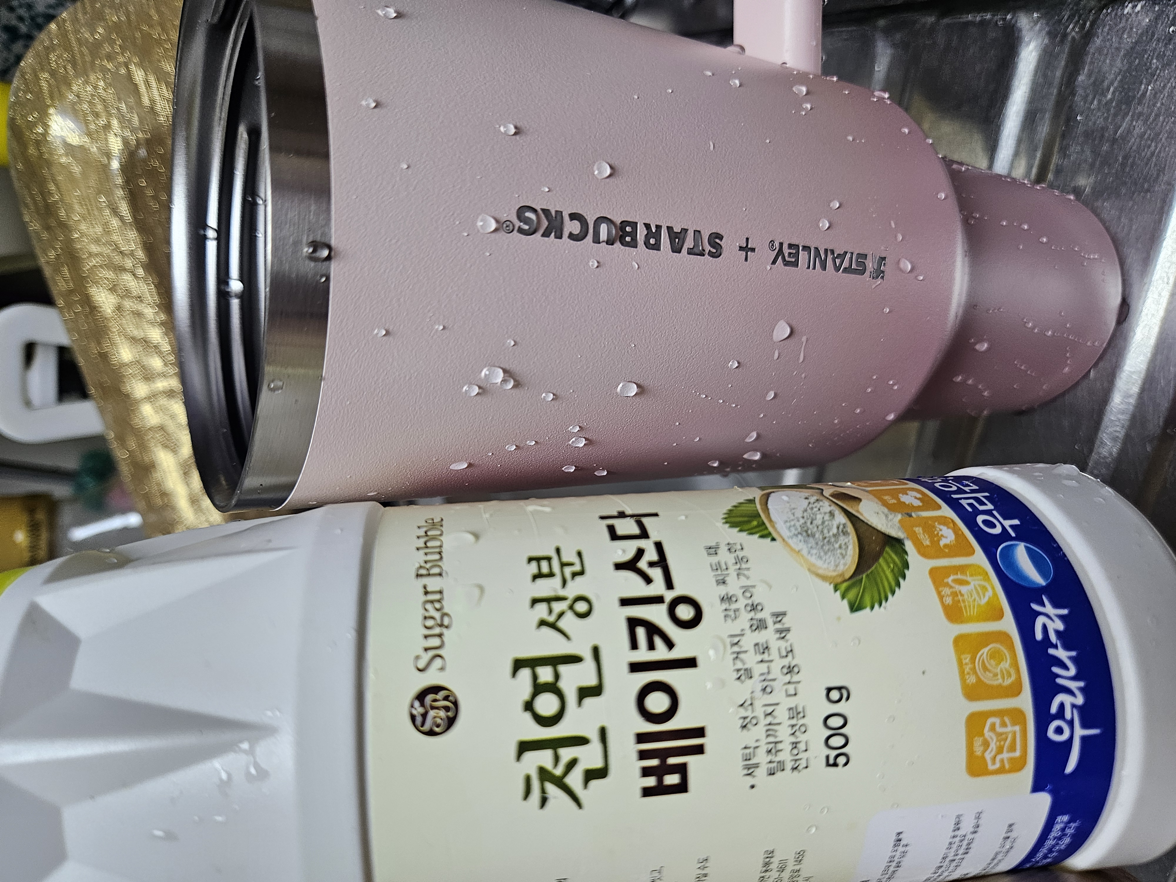 흐르는 물에 헹군 후 주방용 세제와 베이킹소다를 1:1로 넣어놓고, 냄비에 물을 끓여 텀블러에 부었는데 온도가 너무 뜨거울까 싶어 찬물과 좀 섞었다.
