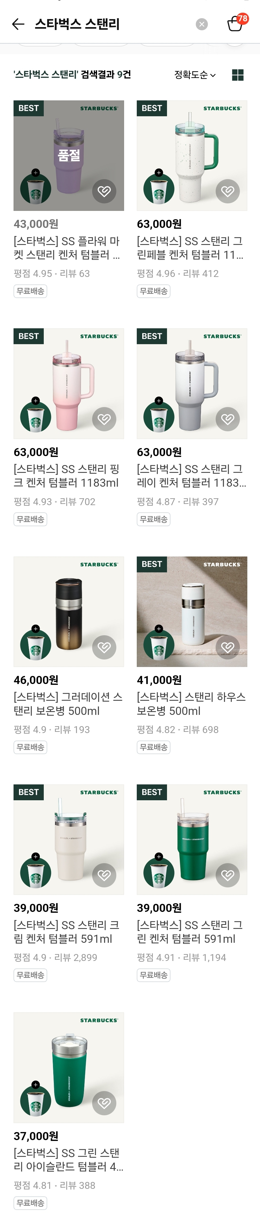 현재 네이버 스타벅스 공식 쇼핑몰에서 판매하고 있는 스타벅스 스탠리 제품은 총 9개.